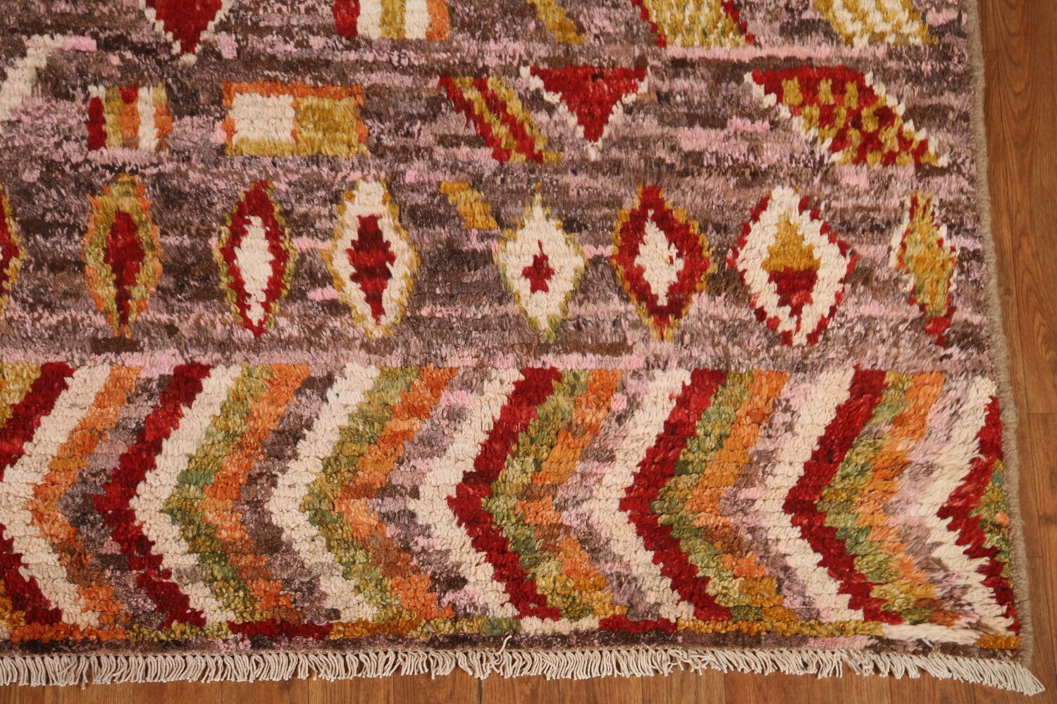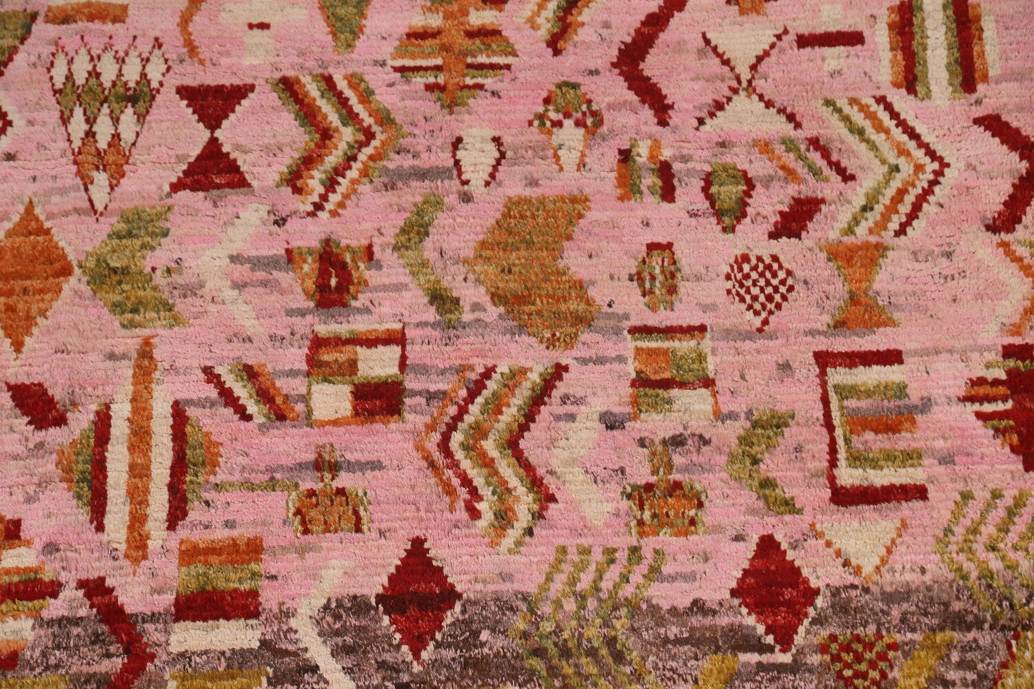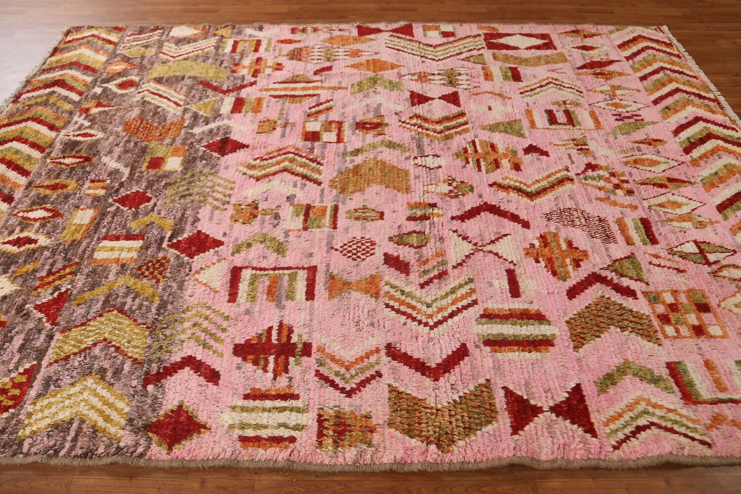 A Beautiful Genuine Pakistan Moroccan rug is Hand Knotted by skillful weavers in Pakistan with 100% Wool Material. This rug is in condition. dimensions are 9' 4'' X 6' 10'' in foot and 284 X 208 in centimeter. the primary color is Pink.