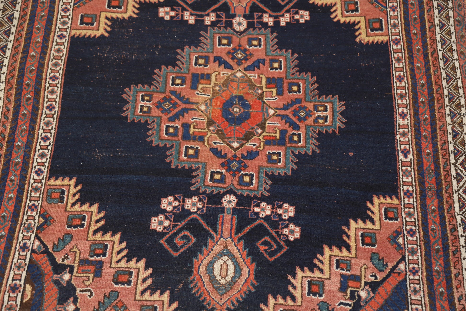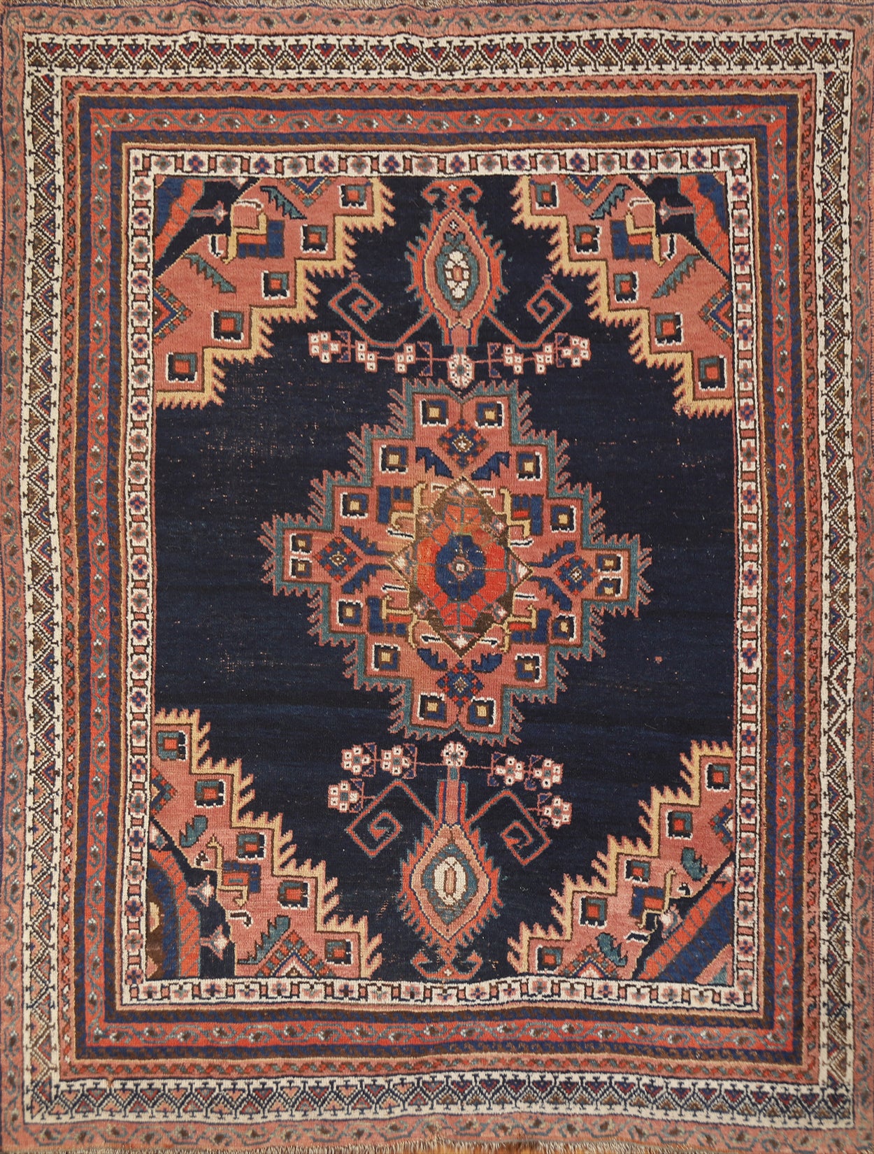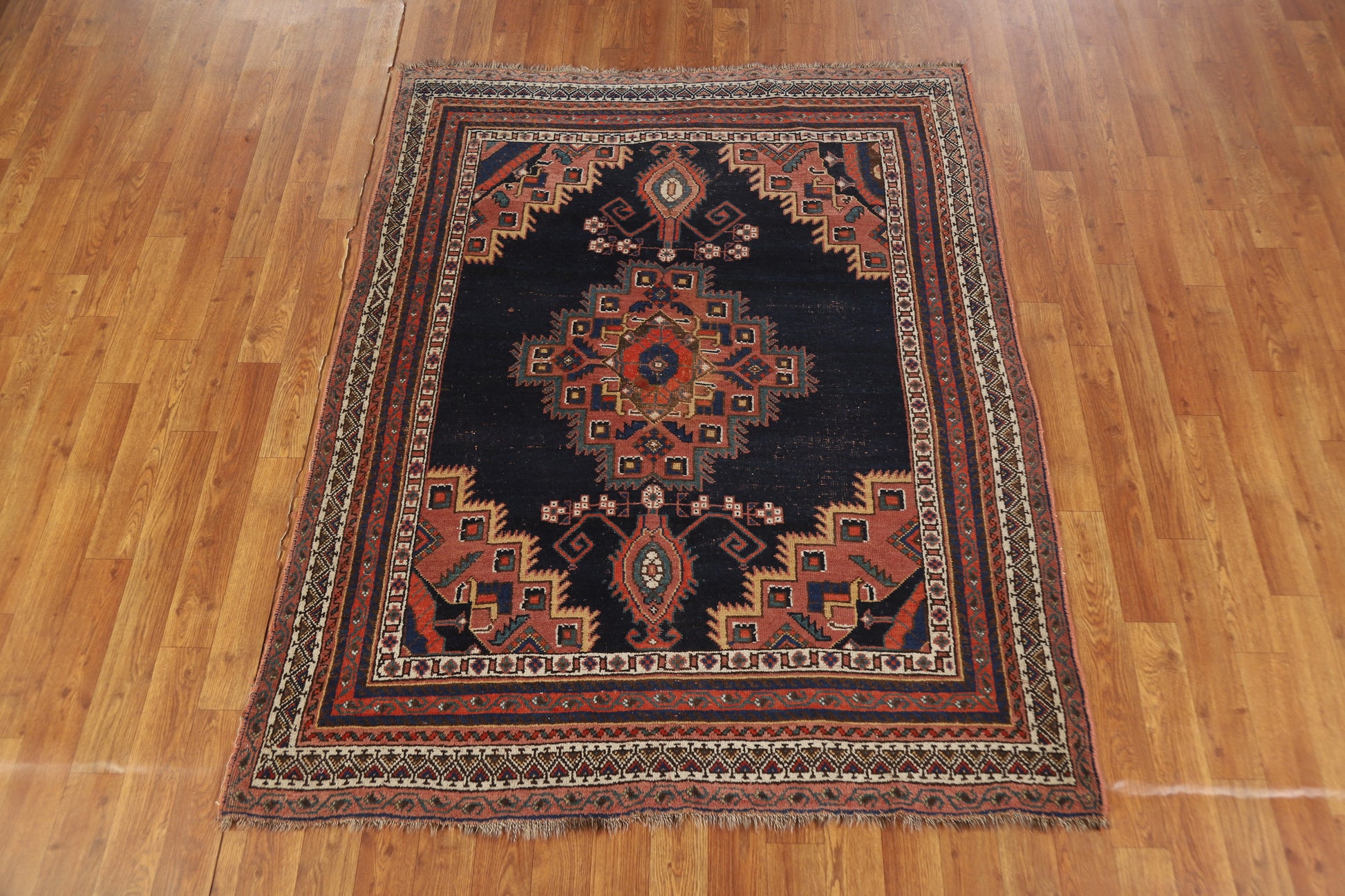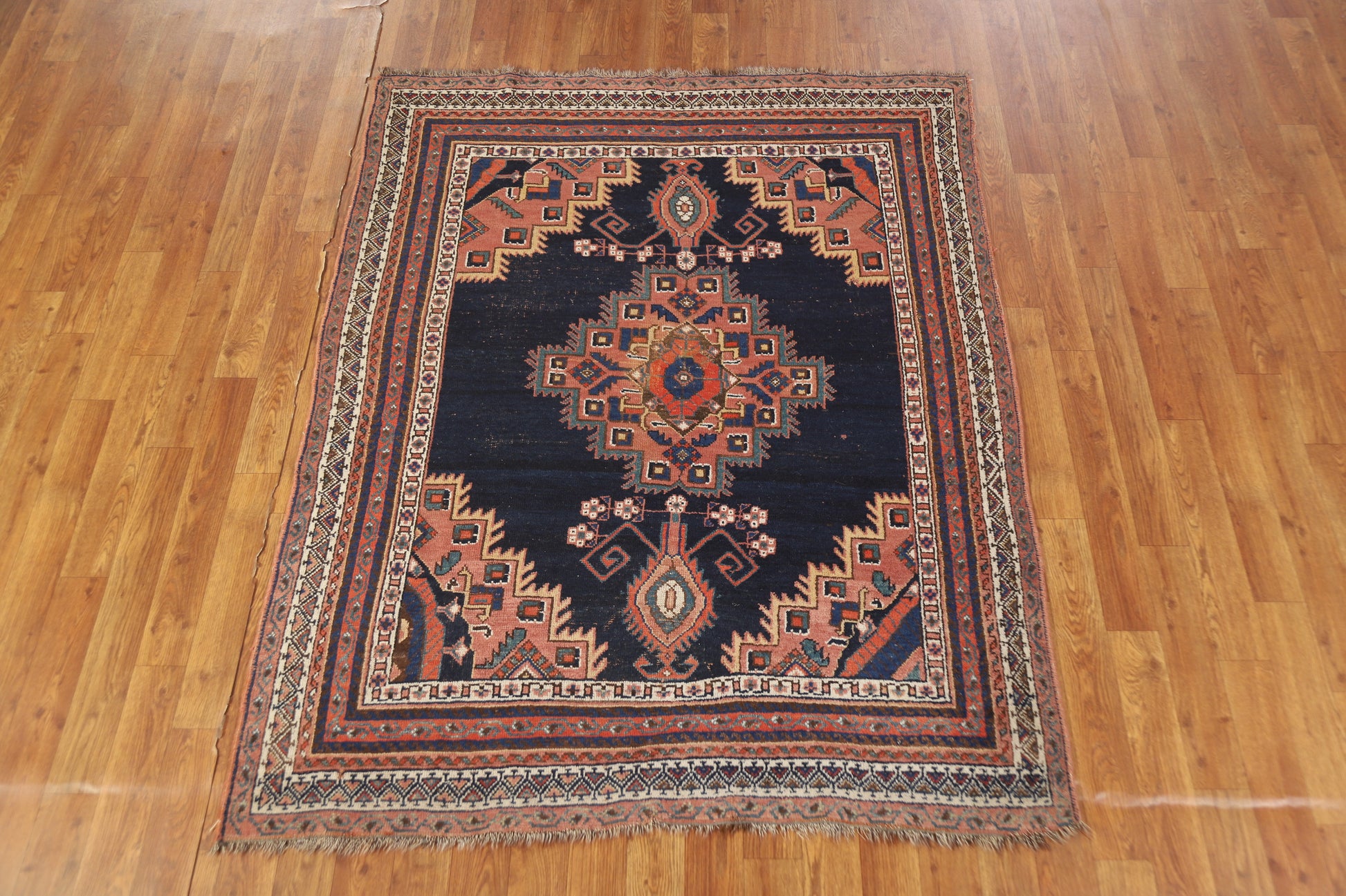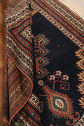 A Beautiful Genuine Persia ( Persia ) Afshar rug is Hand Knotted by skillful weavers in Persia ( Persia ) with 100% Wool Material. This rug is in Very Good (Low Pile-Small Repair) condition. dimensions are 5' 2'' X 4' 3'' in foot and 157 X 130 in centimeter. the primary color is Navy Blue & Blues.