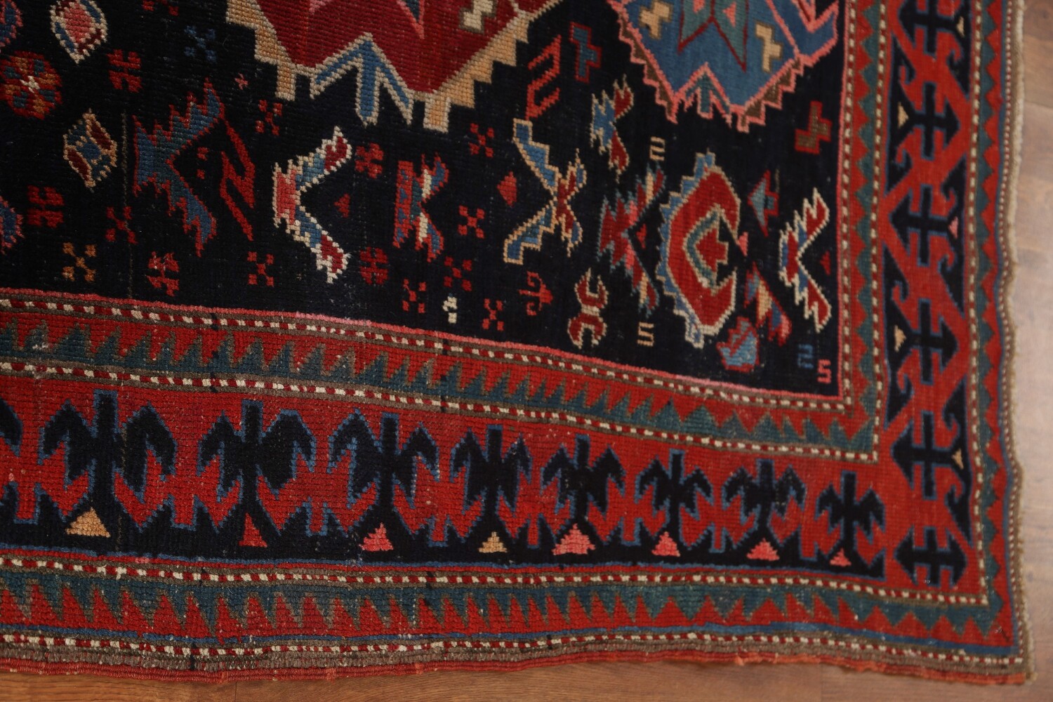 A Beautiful Genuine Russia Caucasian rug is Hand Knotted by skillful weavers in Russia with 100% Wool Material. This rug is in Very Good (Evenly Low Pile) condition. dimensions are 5' 9'' X 4' 5'' in foot and 175 X 135 in centimeter. the primary color is Navy Blue & Blues.