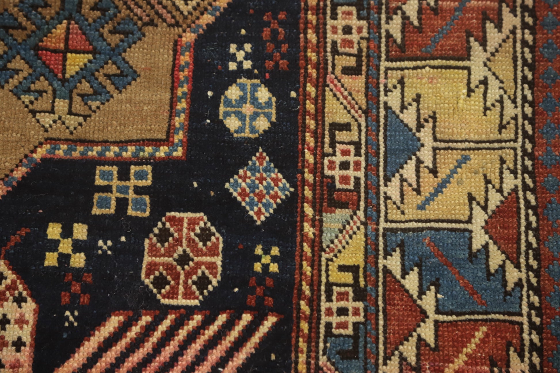 A Beautiful Genuine Russia Kazak rug is Hand Knotted by skillful weavers in Russia with 100% Wool Material. This rug is in Very Good (Low Pile-Abrash-Repair) condition. dimensions are 7' 11'' X 4' 0'' in foot and 241 X 122 in centimeter. the primary color is Navy Blue & Blues.