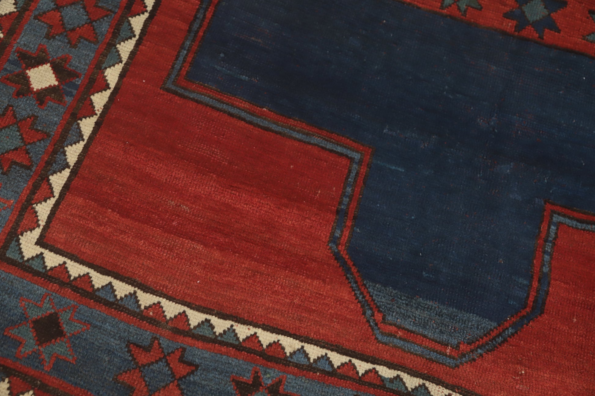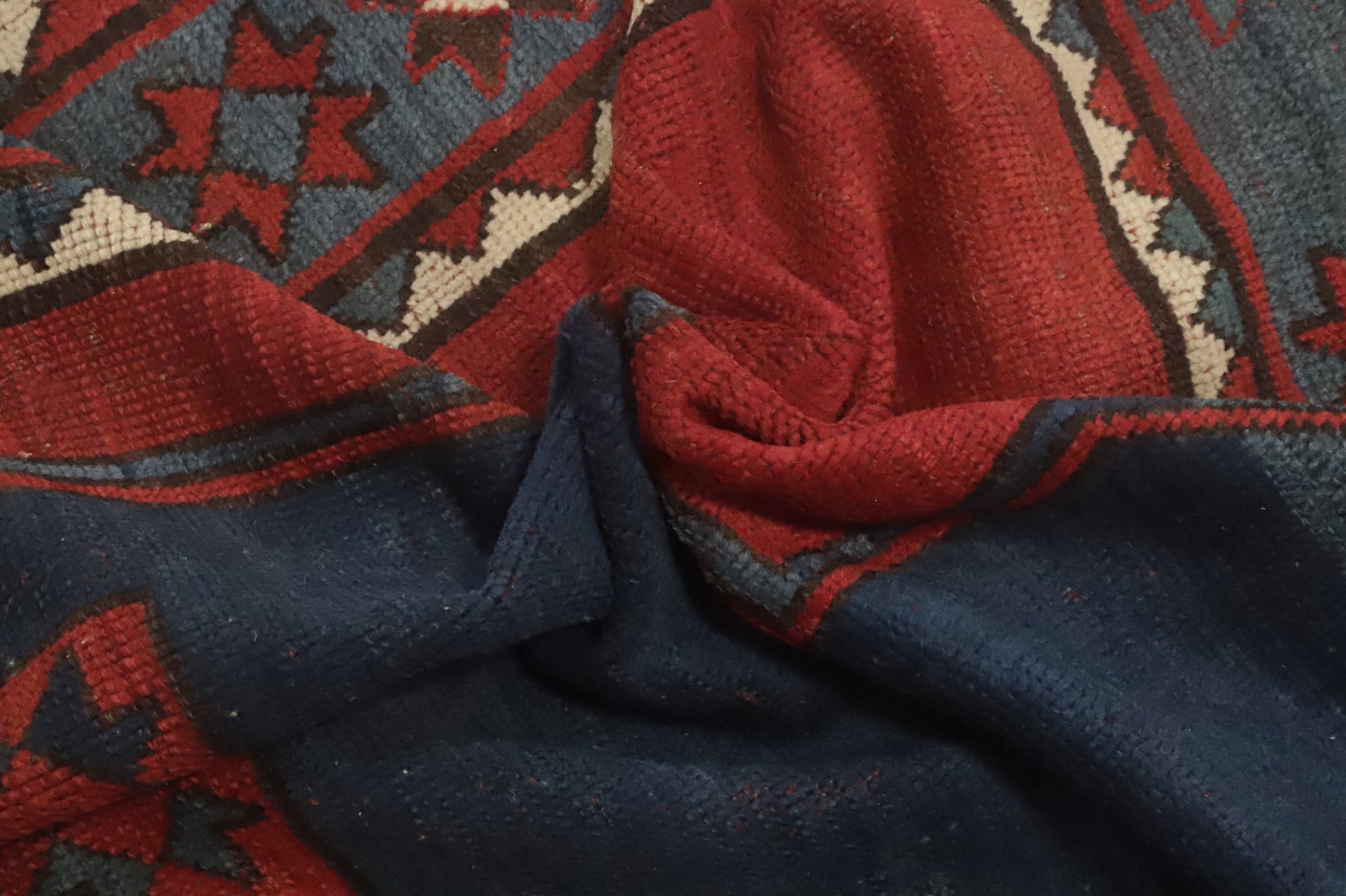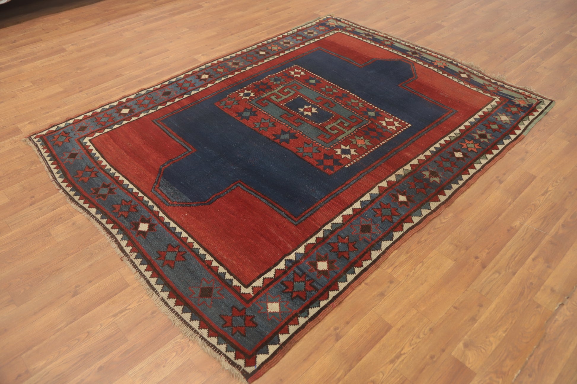 A Beautiful Genuine Russia Kazak rug is Hand Knotted by skillful weavers in Russia with 100% Wool Material. This rug is in Very Good (Low Pile-Abrash-Repairs) condition. dimensions are 6' 11'' X 5' 1'' in foot and 211 X 155 in centimeter. the primary color is Navy Blue & Blues.