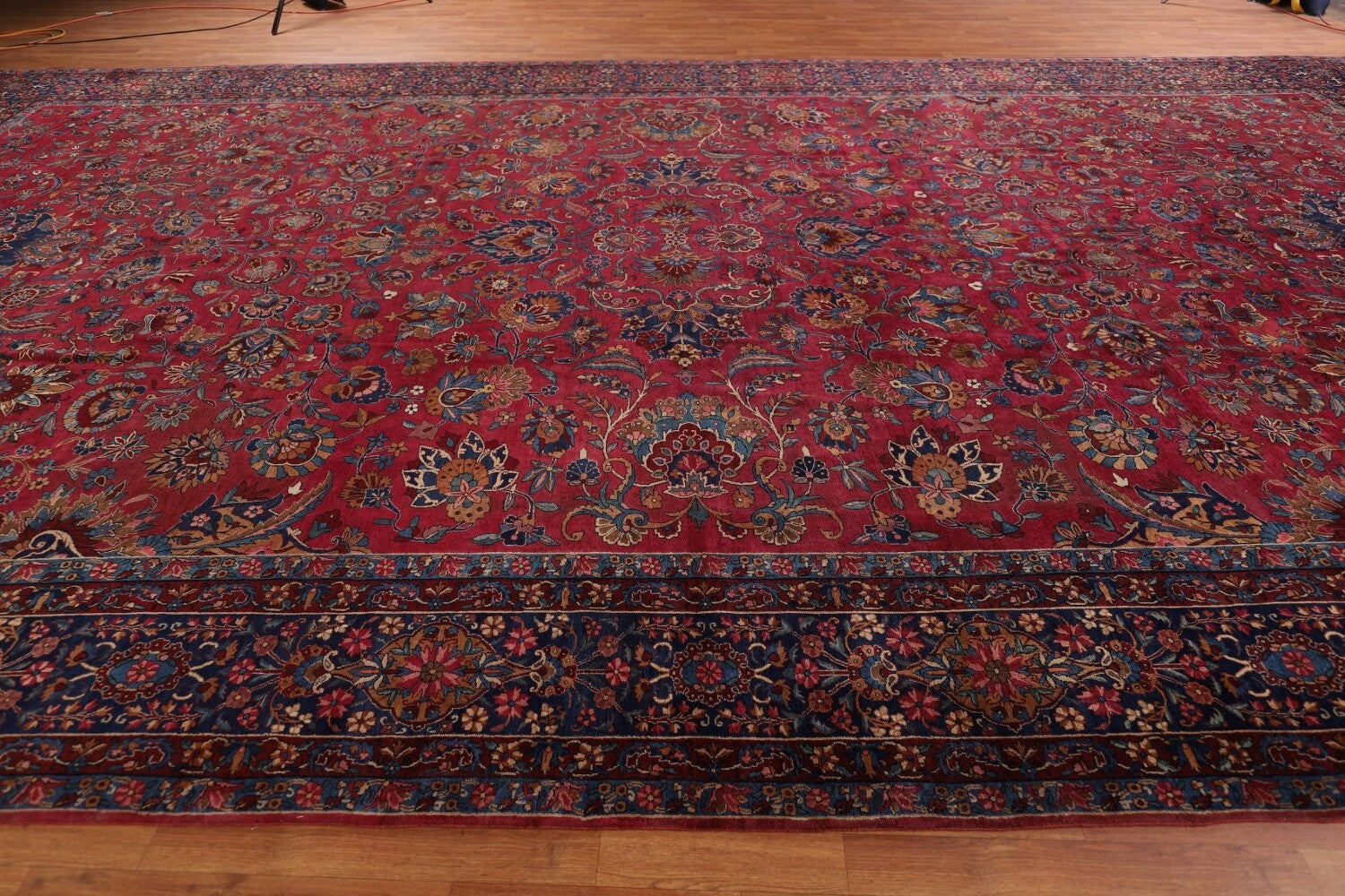 A Beautiful Genuine Persia ( Persia ) Kerman (Ravar) rug is Hand Knotted by skillful weavers in Persia ( Persia ) with 100% Wool Material. This rug is in Very Good ( Low Pile ) condition. dimensions are 21' 2'' X 11' 10'' in foot and 645 X 361 in centimeter. the primary color is Pink.