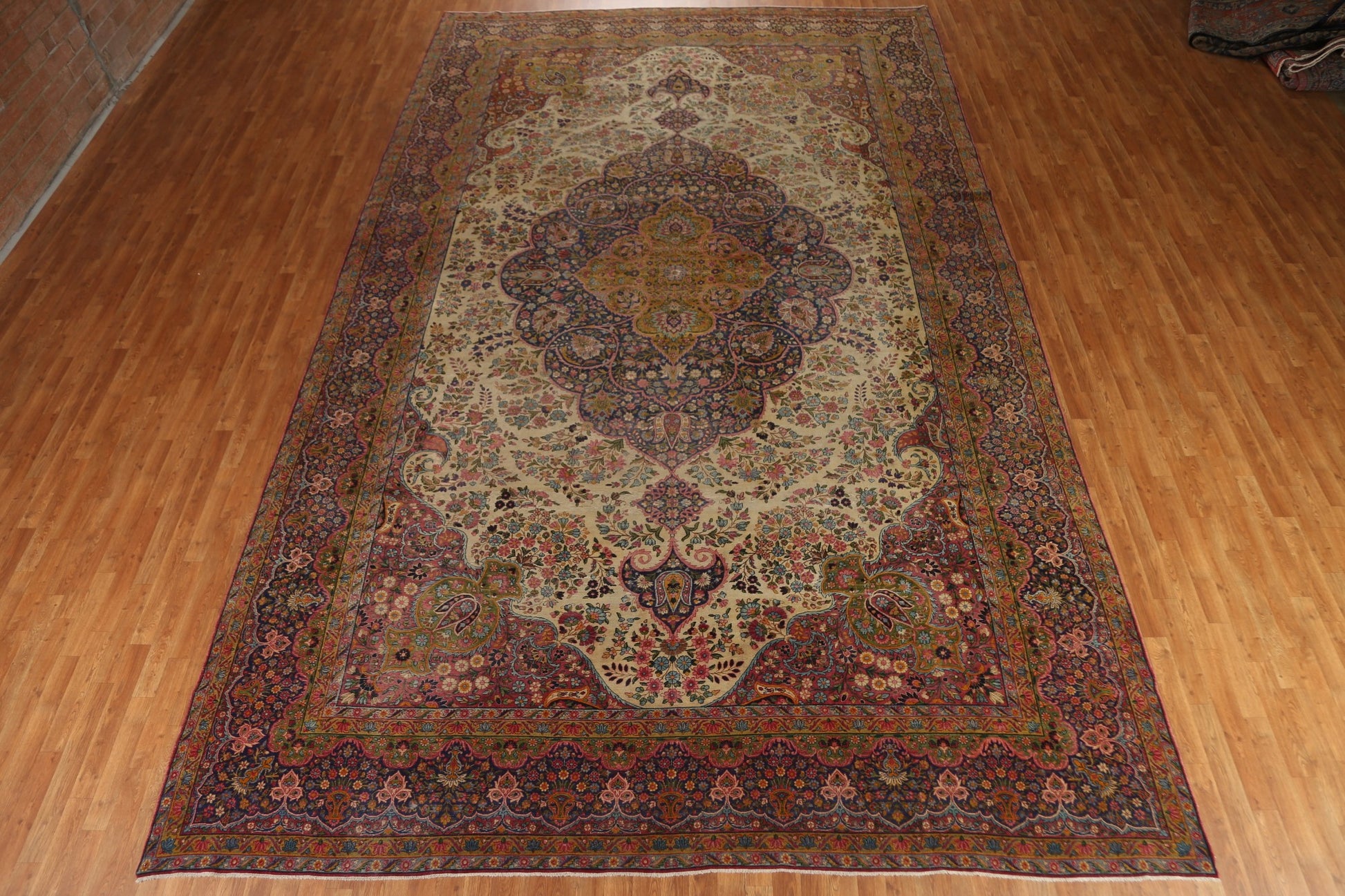A Beautiful Genuine Persia ( Persia ) Kerman (Lavar) rug is Hand Knotted by skillful weavers in Persia ( Persia ) with 100% Wool Material. This rug is in Very Good (Evenly Low Pile) condition. dimensions are 17' 7'' X 10' 8'' in foot and 536 X 325 in centimeter. the primary color is Beige & Ivories.