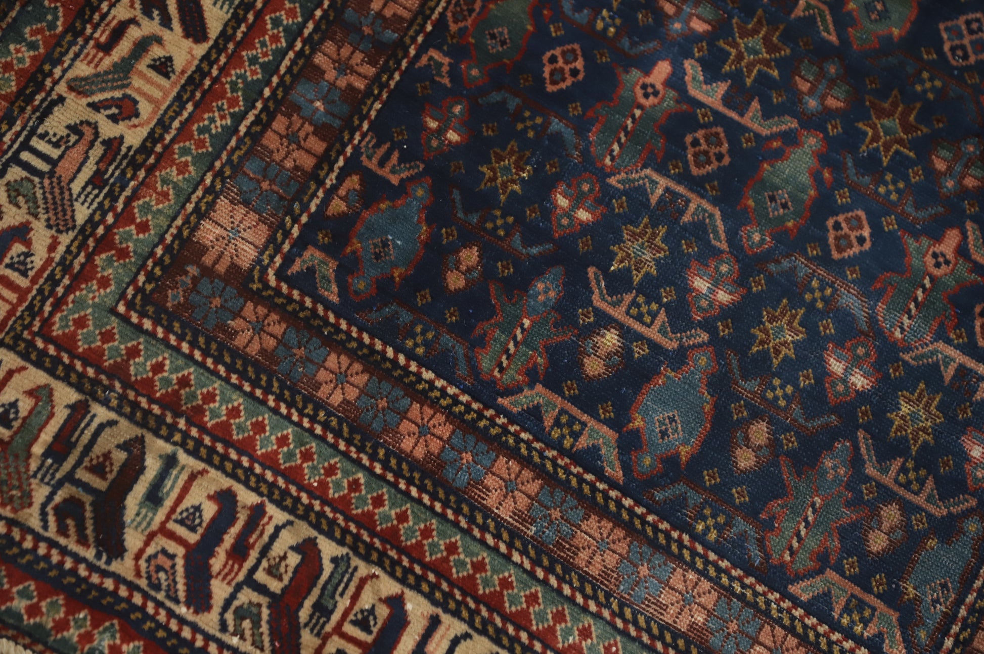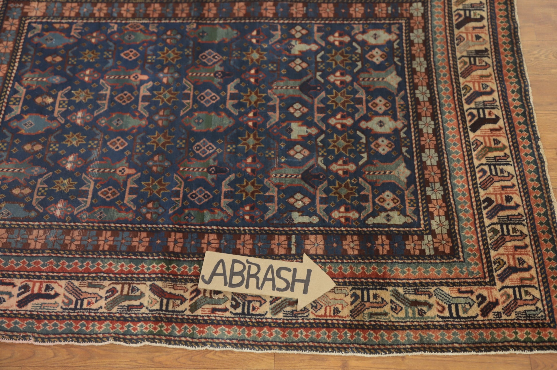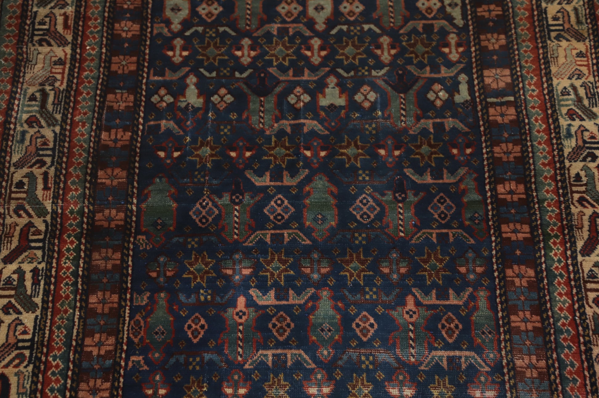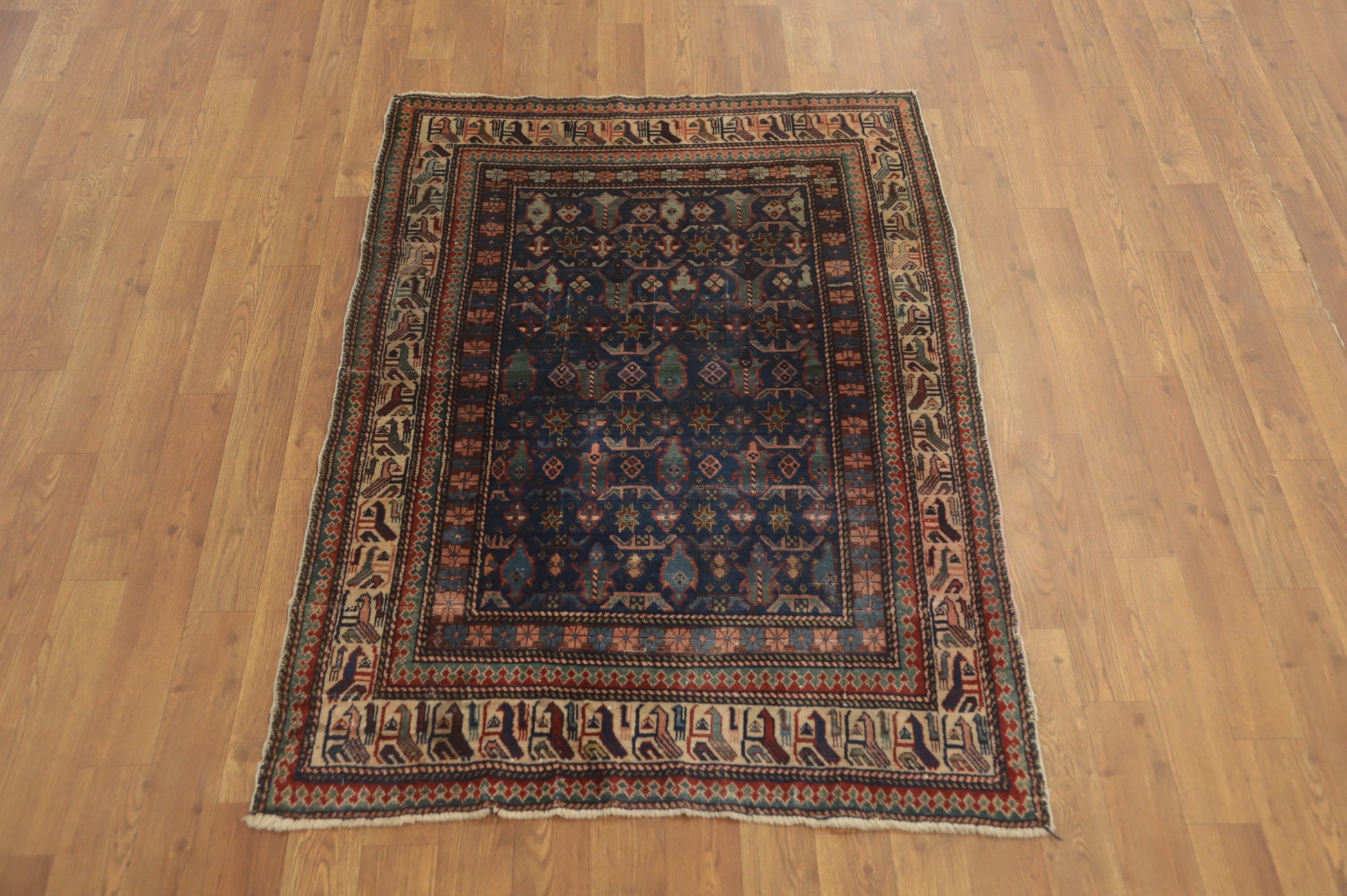 A Beautiful Genuine Russia Shirvan rug is Hand Knotted by skillful weavers in Russia with 100% Wool Material. This rug is in Very Good (Low Pile-Abrash) condition. dimensions are 4' 1'' X 2' 11'' in foot and 124 X 89 in centimeter. the primary color is Navy Blue & Blues.