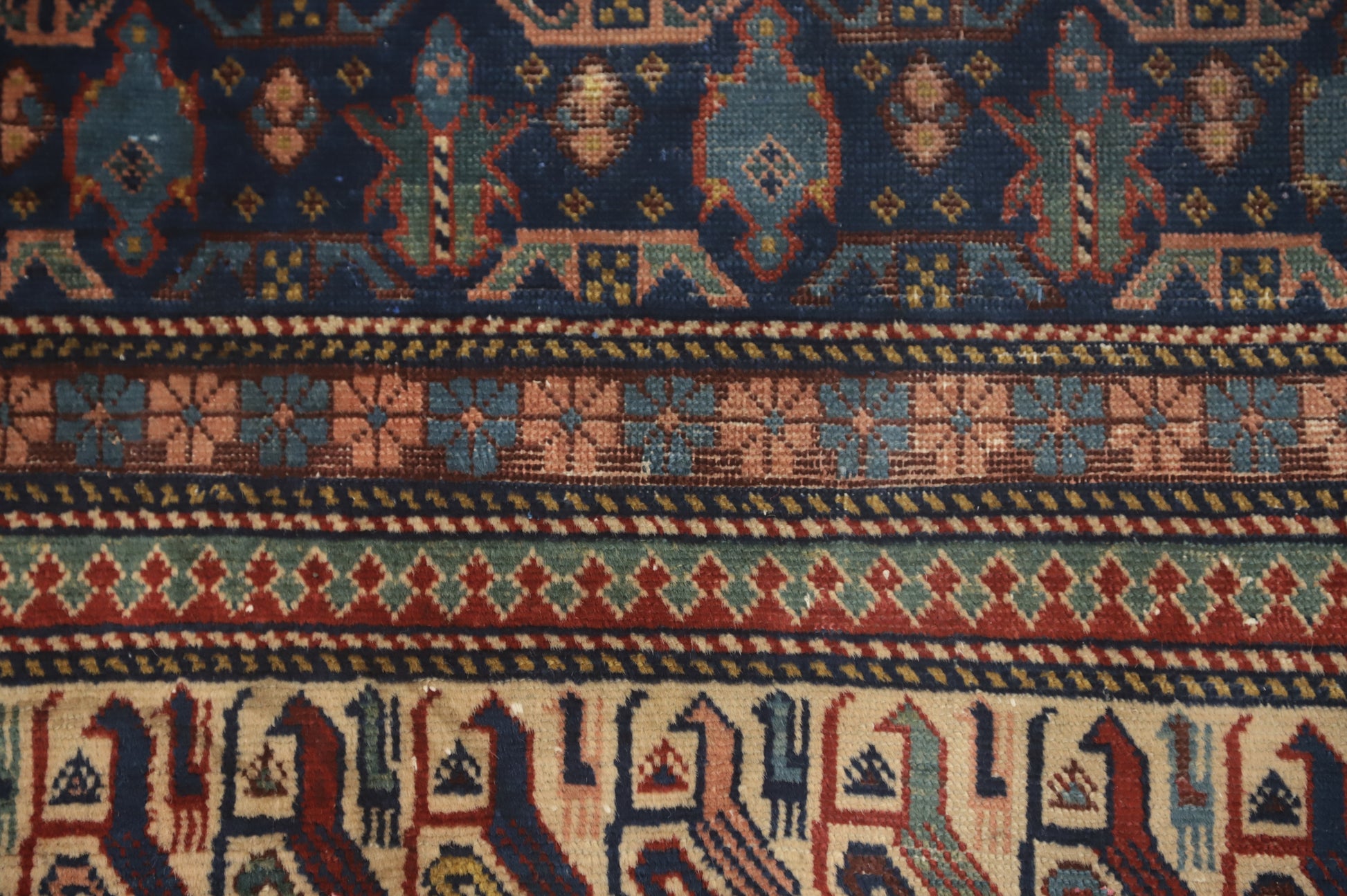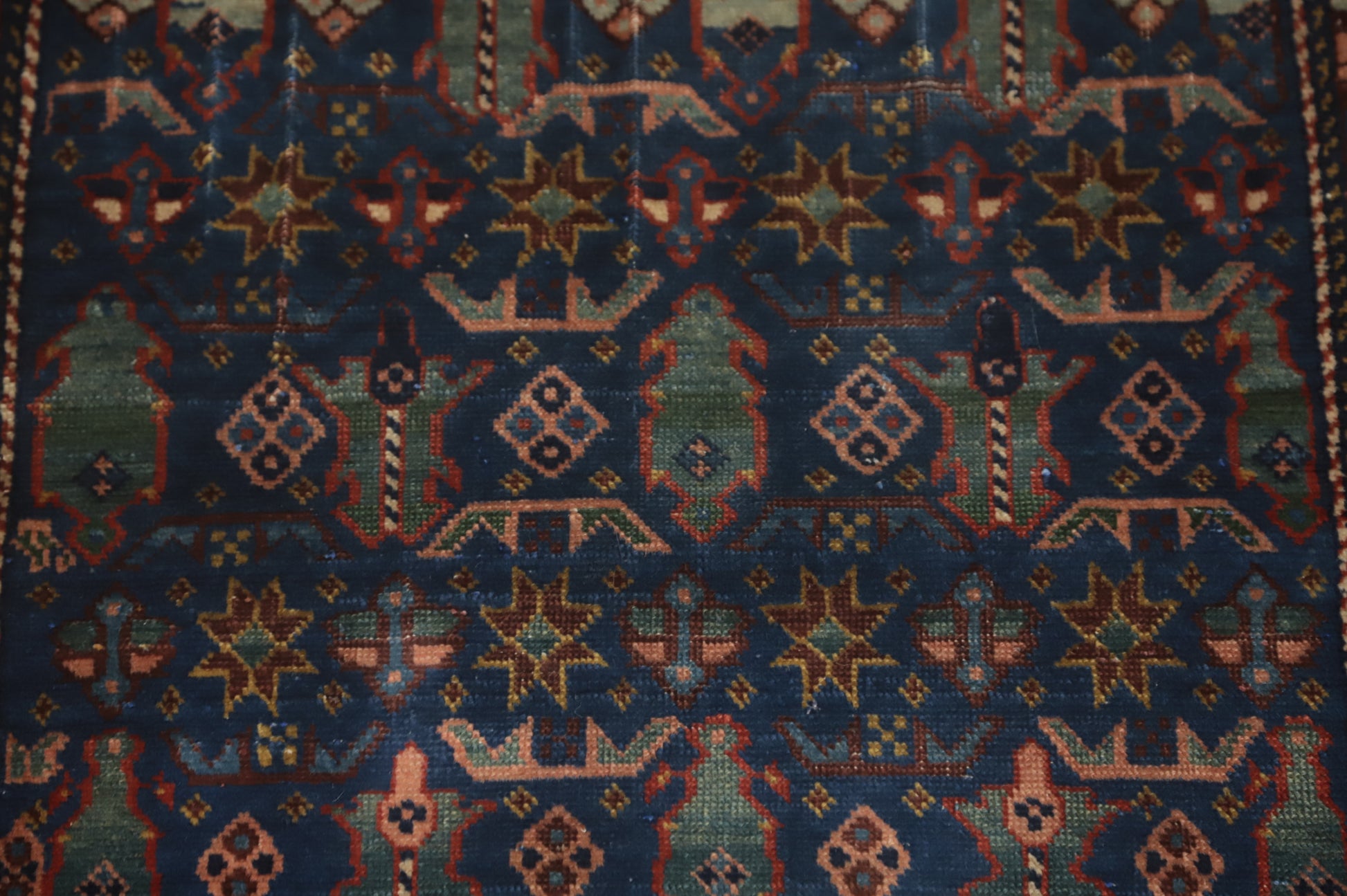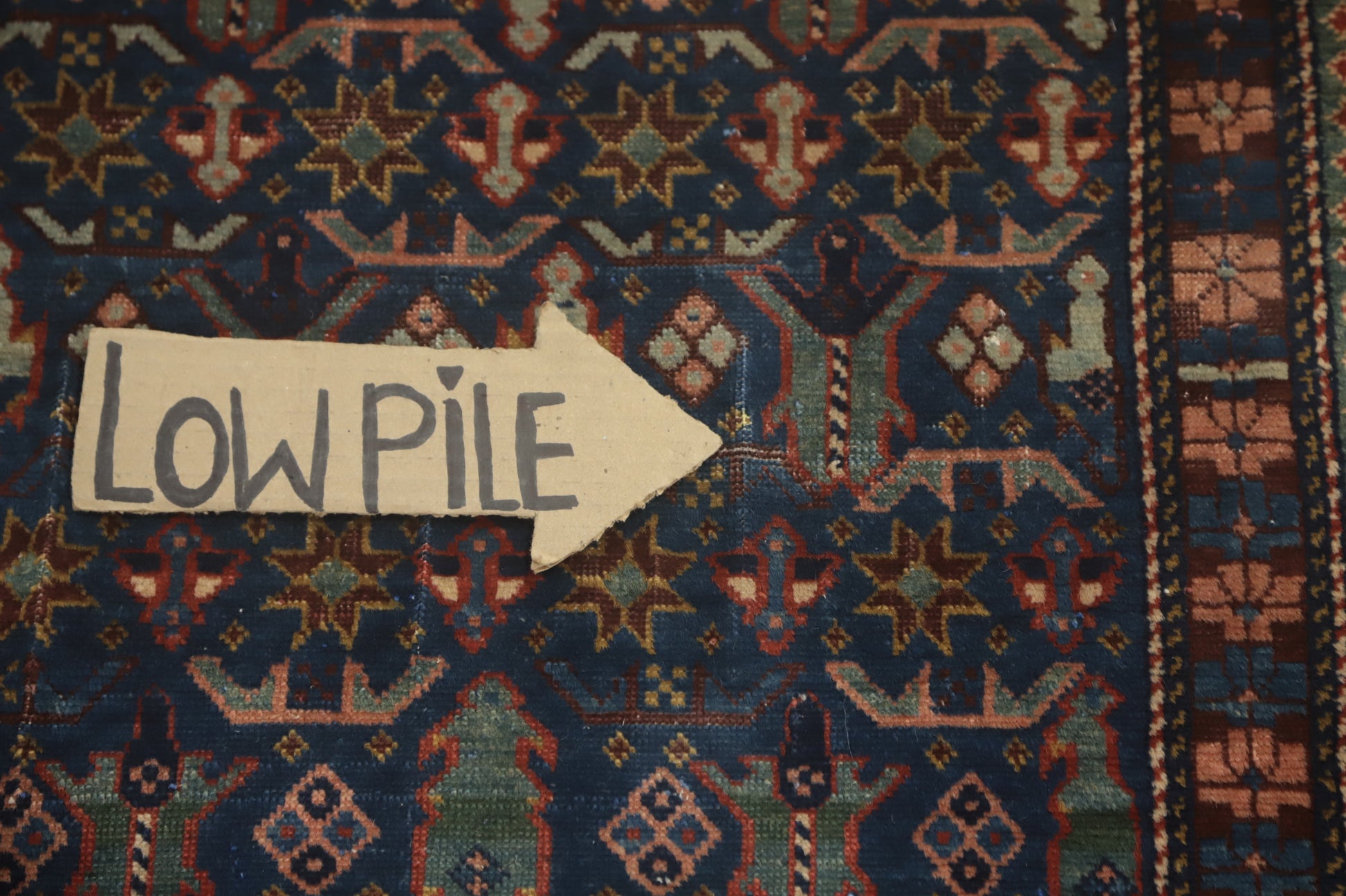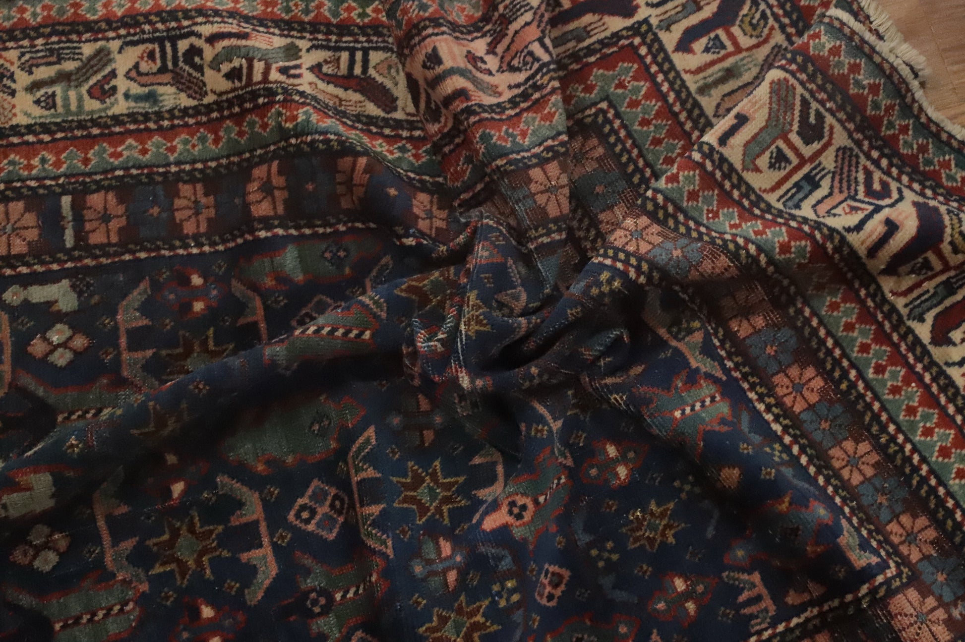 A Beautiful Genuine Russia Shirvan rug is Hand Knotted by skillful weavers in Russia with 100% Wool Material. This rug is in Very Good (Low Pile-Abrash) condition. dimensions are 4' 1'' X 2' 11'' in foot and 124 X 89 in centimeter. the primary color is Navy Blue & Blues.