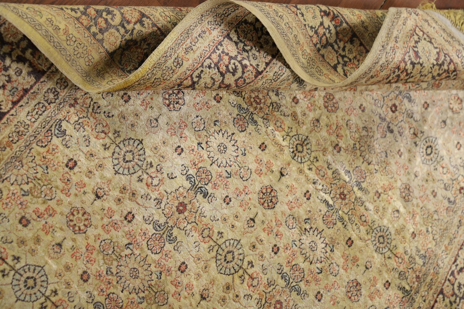 A Beautiful Genuine Persia ( Persia ) Sarouk (Farahan) rug is Hand Knotted by skillful weavers in Persia ( Persia ) with 100% Silk Material. This rug is in Very Good condition. dimensions are 6' 0'' X 4' 0'' in foot and 183 X 122 in centimeter. the primary color is Yellow & Gold.