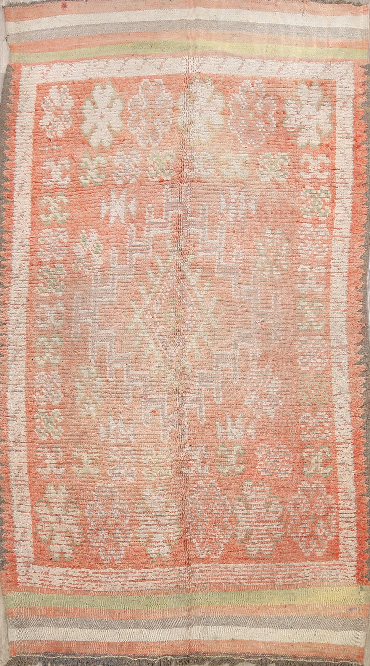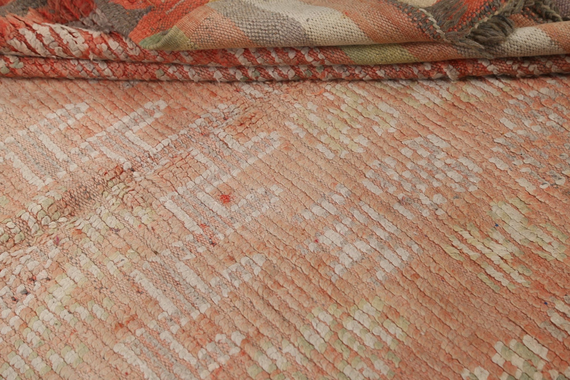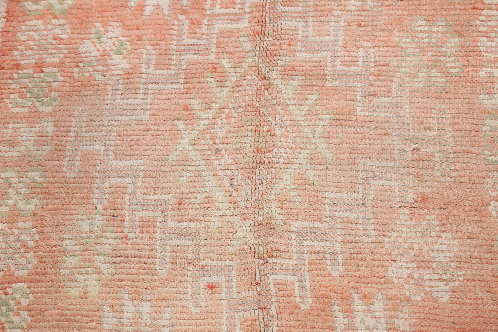 A Beautiful Genuine Morocco Moroccan rug is Hand Knotted by skillful weavers in Morocco with 100% Wool Material. This rug is in Very Good (Evenly Low Pile) condition. dimensions are 9' 8'' X 5' 8'' in foot and 295 X 173 in centimeter. the primary color is Peach.