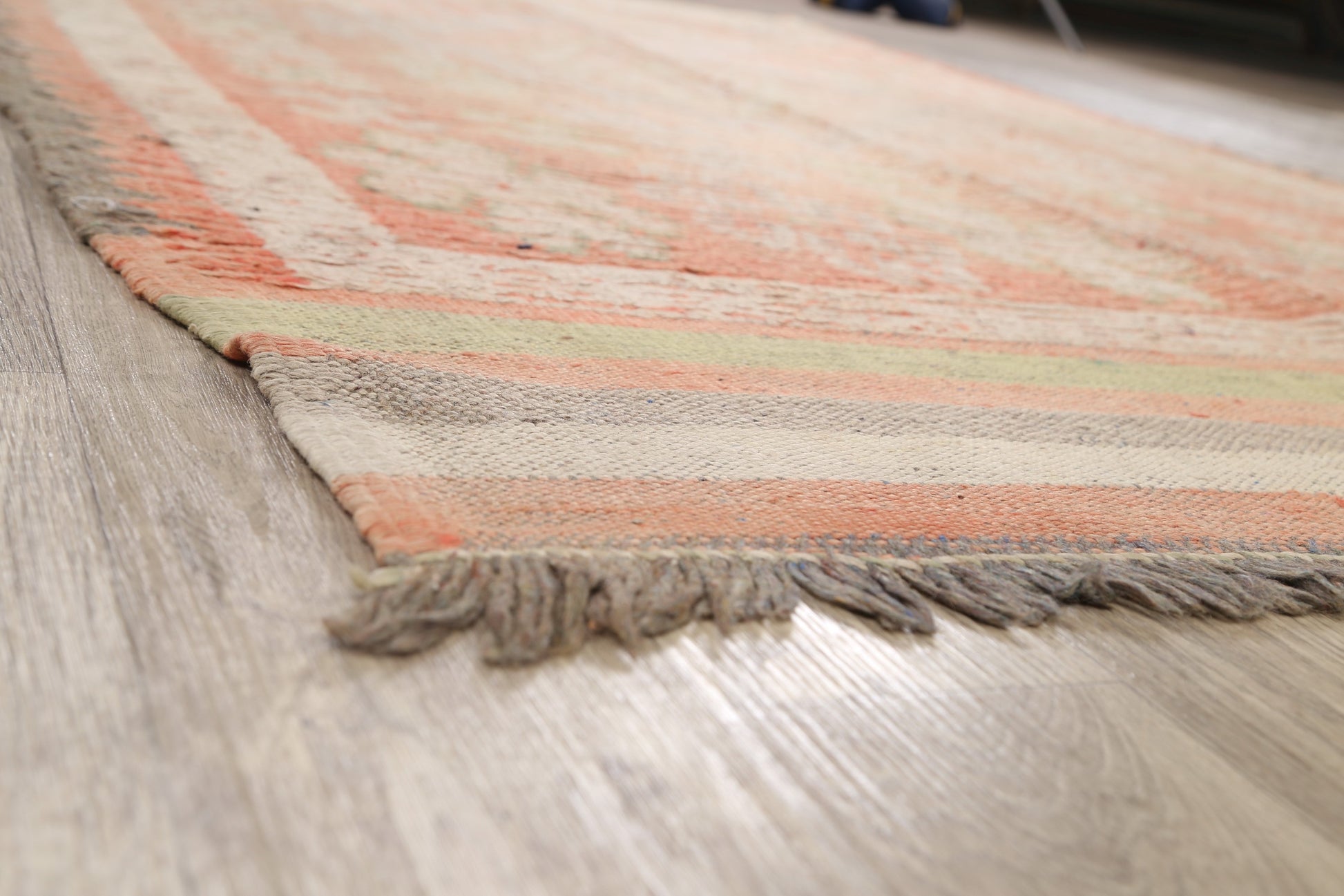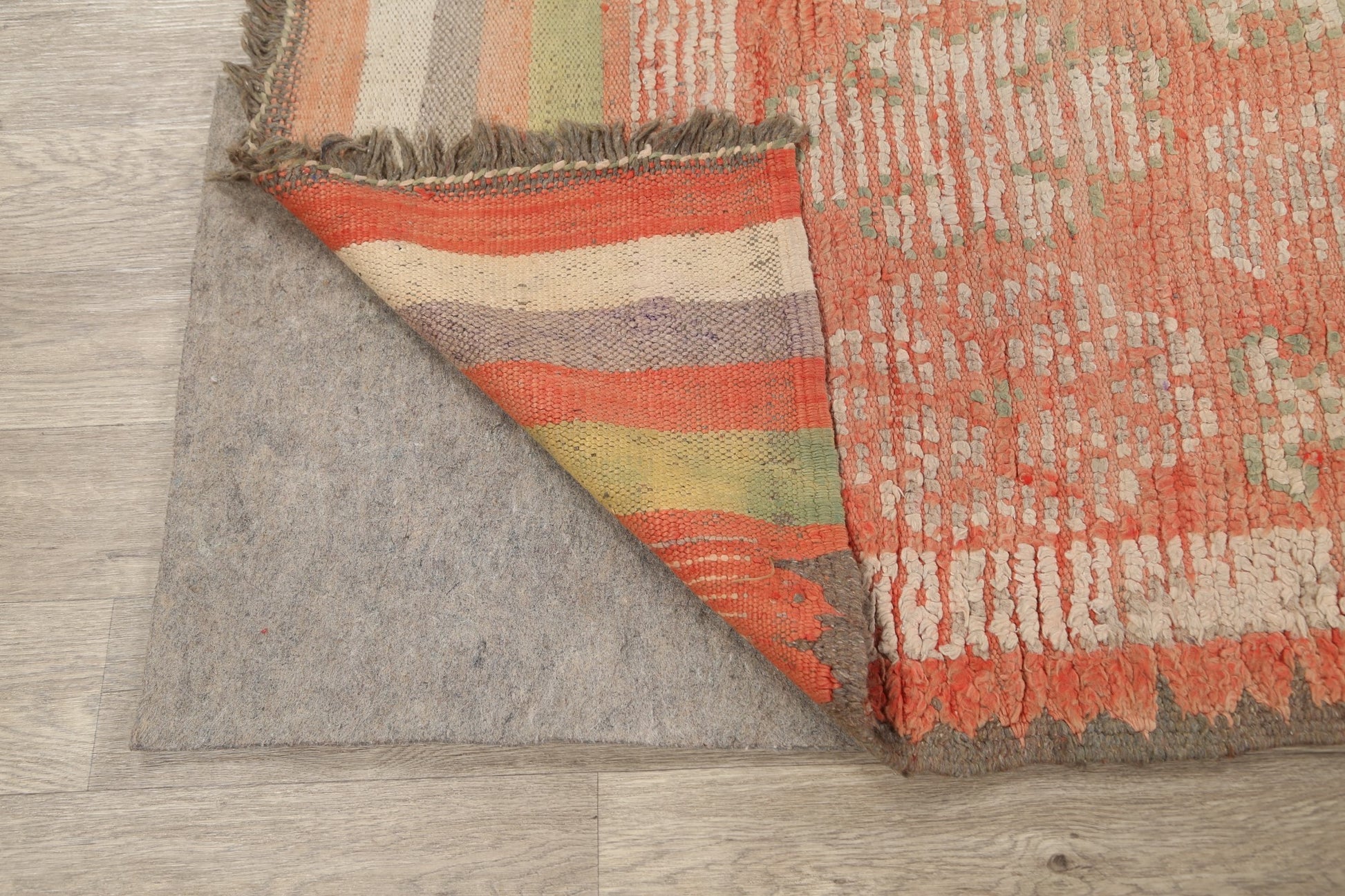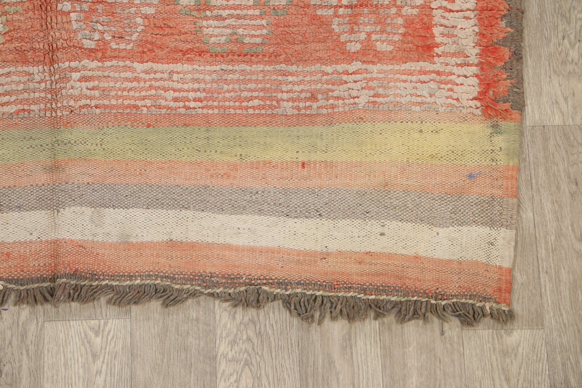 A Beautiful Genuine Morocco Moroccan rug is Hand Knotted by skillful weavers in Morocco with 100% Wool Material. This rug is in Very Good (Evenly Low Pile) condition. dimensions are 9' 8'' X 5' 8'' in foot and 295 X 173 in centimeter. the primary color is Peach.
