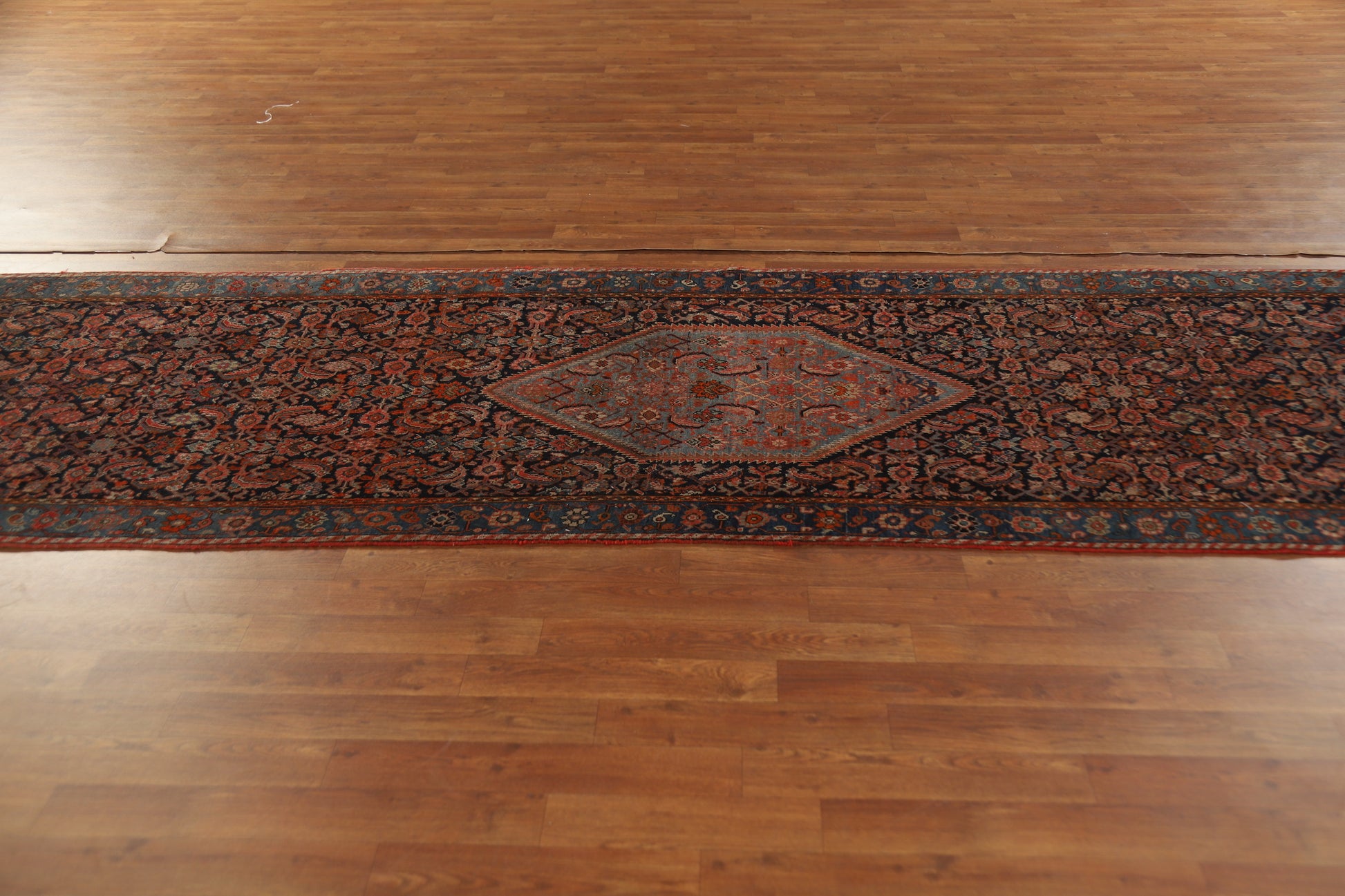 A Beautiful Genuine Persia ( Persia ) Bidjar (Halvaei) rug is Hand Knotted by skillful weavers in Persia ( Persia ) with 100% Wool Material. This rug is in Very Good (Low Pile) condition. dimensions are 19' 6'' X 3' 5'' in foot and 594 X 104 in centimeter. the primary color is Navy Blue & Blues.