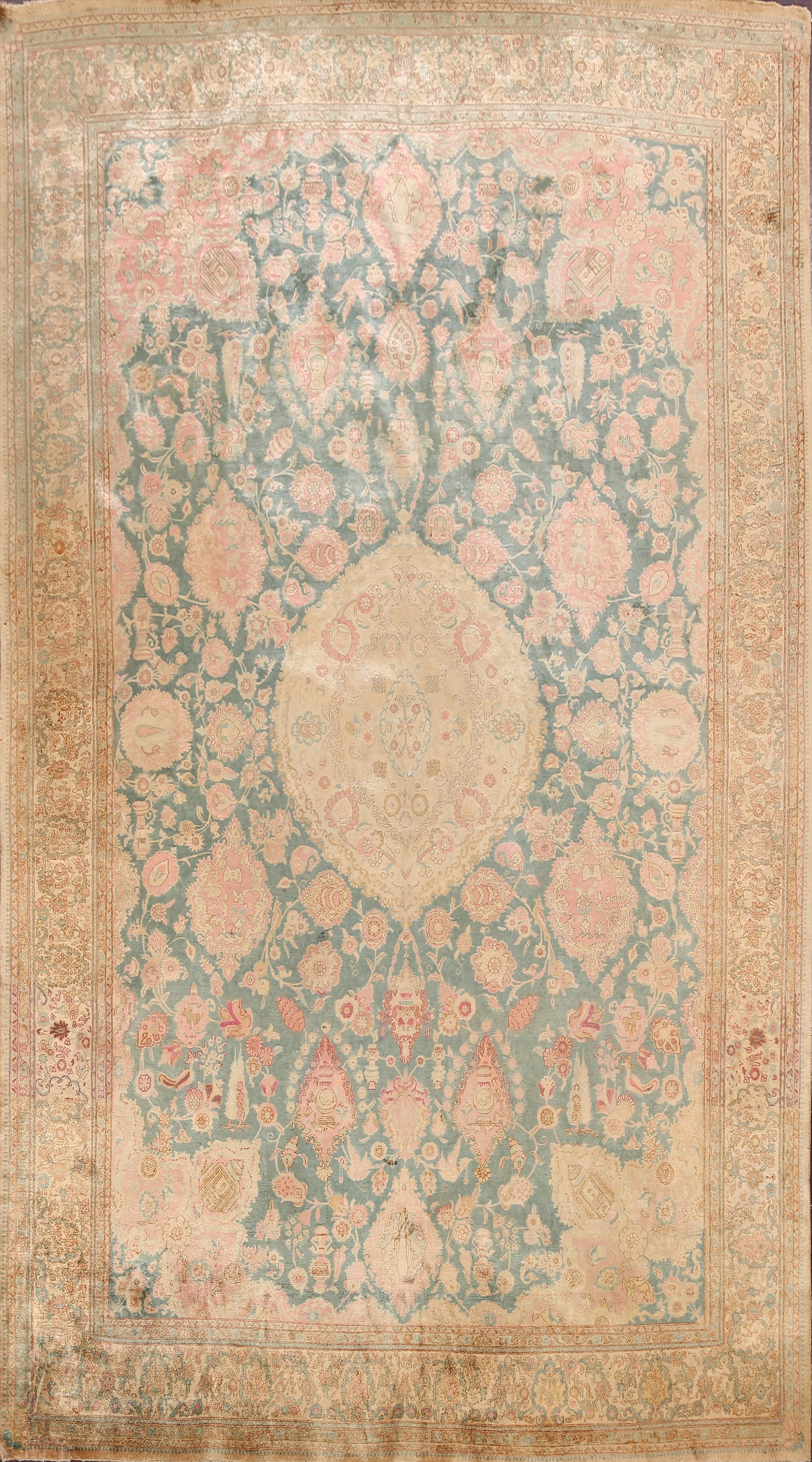 A Beautiful Genuine Turkey Hereke rug is Hand Knotted by skillful weavers in Turkey with 100% Silk Material. This rug is in Very Good (Repair) condition. dimensions are 9' 10'' X 6' 7'' in foot and 300 X 201 in centimeter. the primary color is Green.