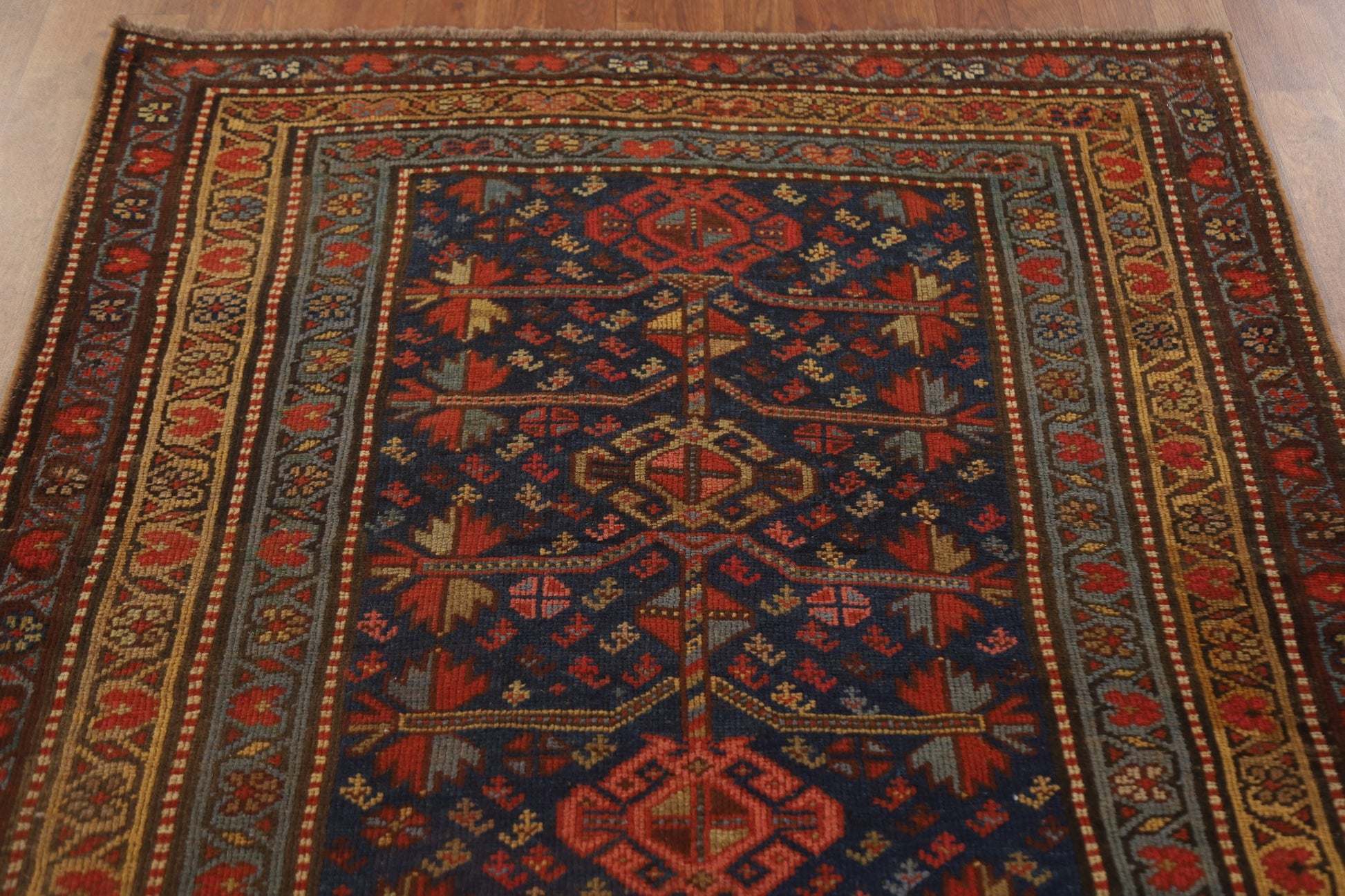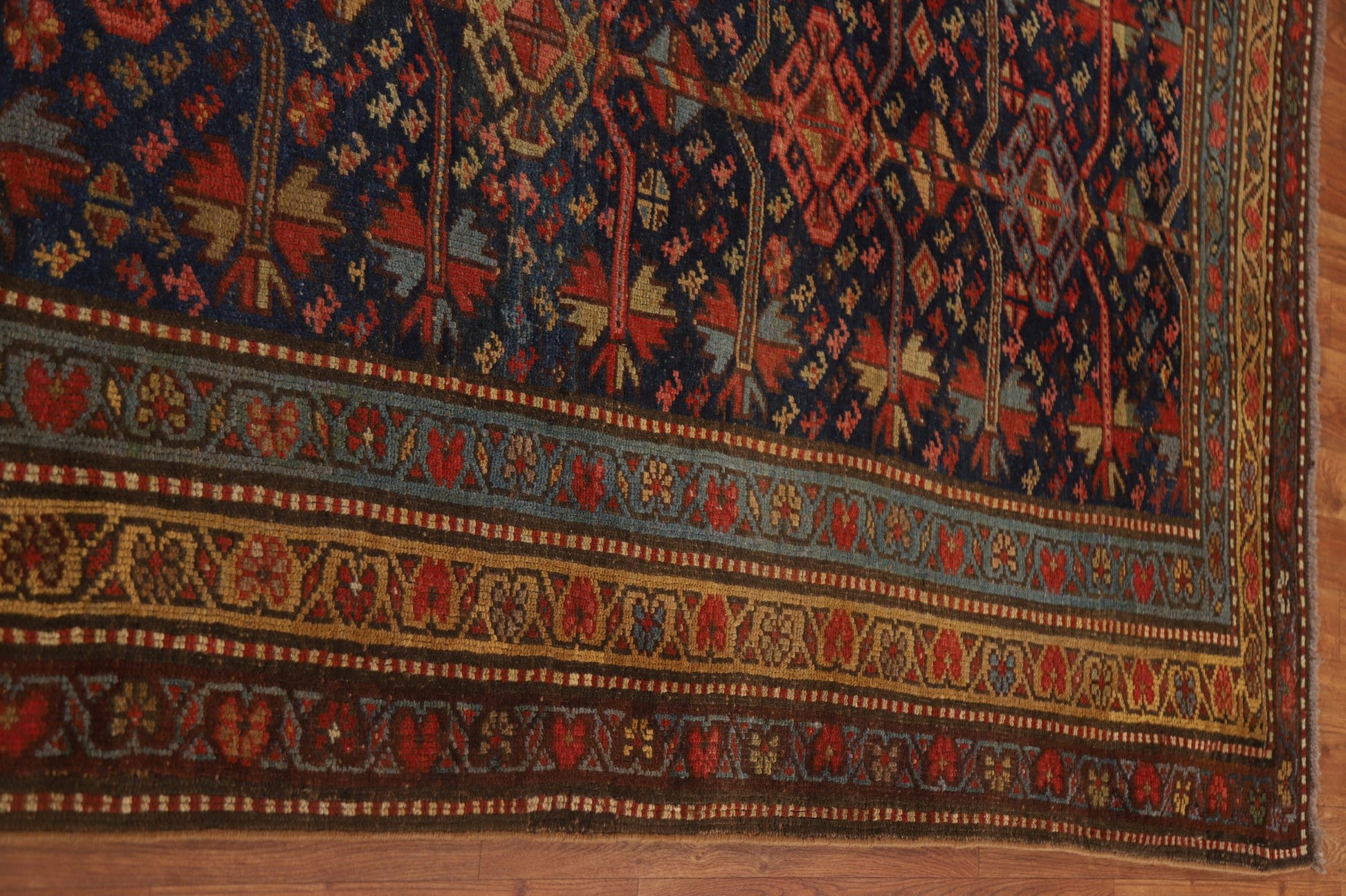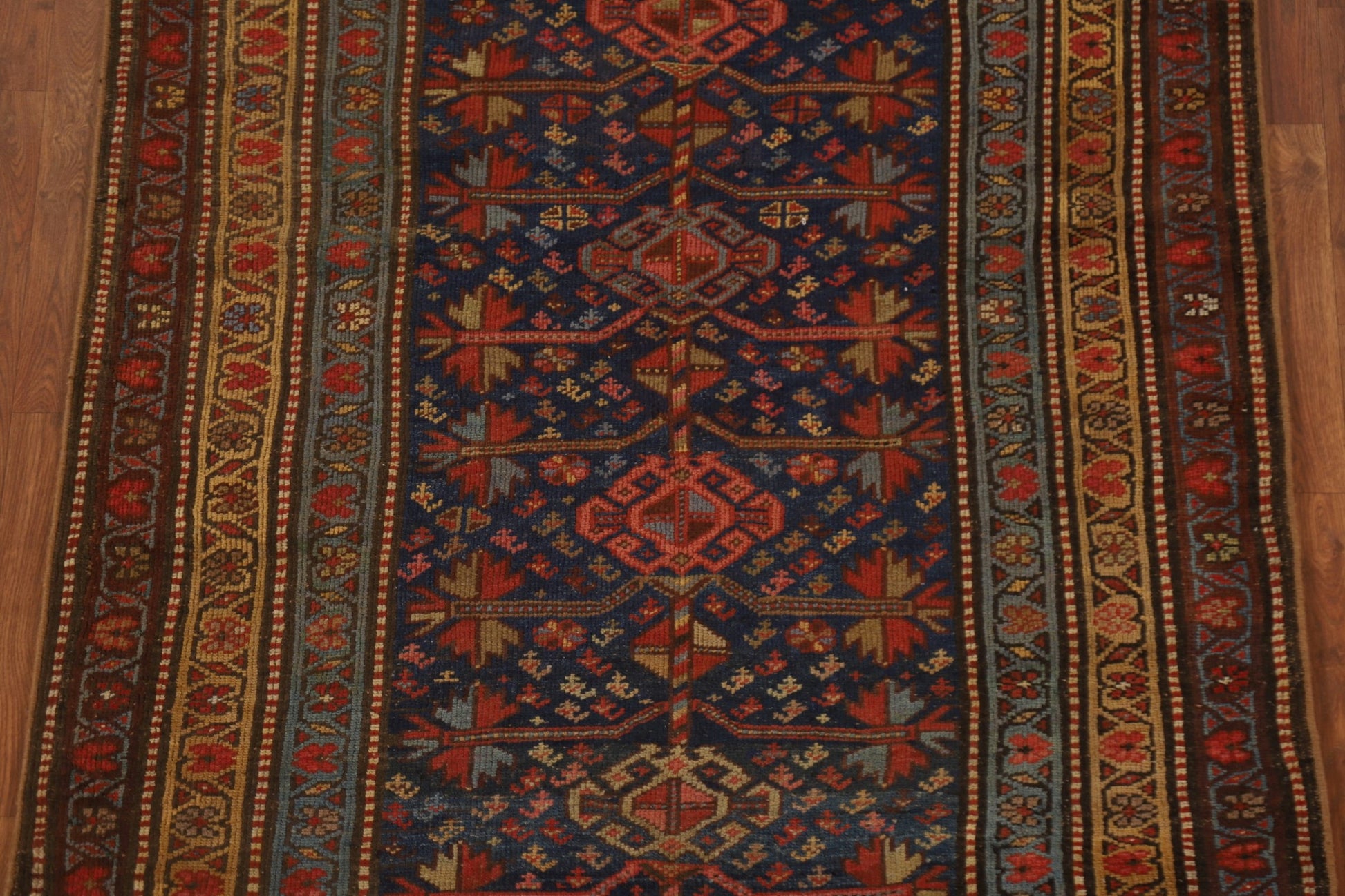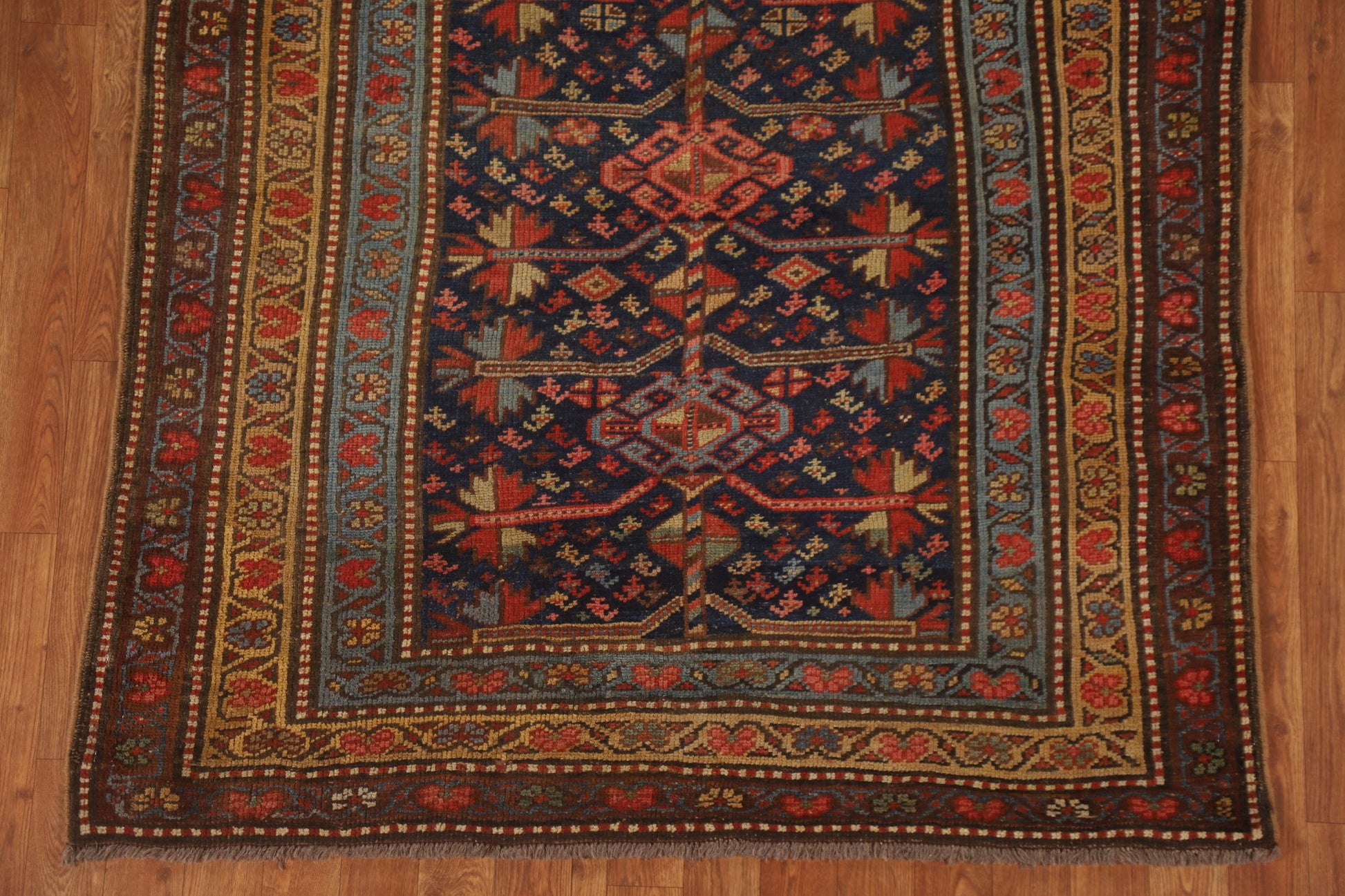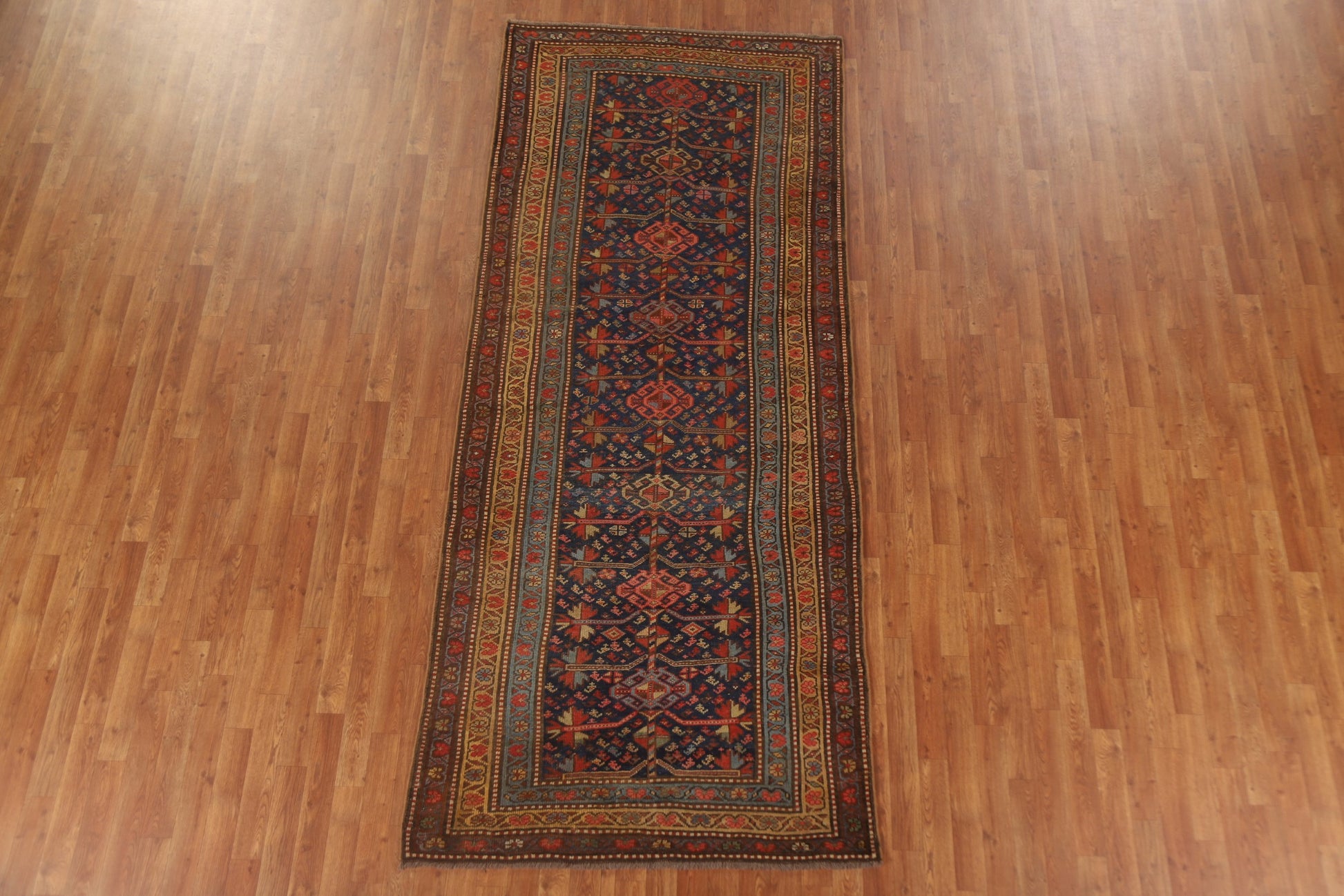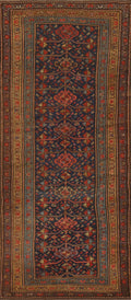 A Beautiful Genuine Persia ( Persia ) Heriz (Bakhshayesh) rug is Hand Knotted by skillful weavers in Persia ( Persia ) with 100% Wool Material. This rug is in Very Good (Evenly Low Pile) condition. dimensions are 9' 10'' X 4' 2'' in foot and 300 X 127 in centimeter. the primary color is Navy Blue & Blues.
