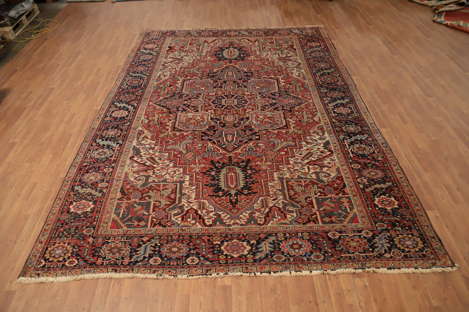 A Beautiful Genuine Persia ( Persia ) Heriz (serapi) rug is Hand Knotted by skillful weavers in Persia ( Persia ) with 100% Wool Material. This rug is in Very Good ( Low Pile ) condition. dimensions are 12' 11'' X 8' 11'' in foot and 394 X 272 in centimeter. the primary color is Oranges & Rust.