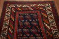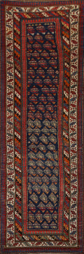 A Beautiful Genuine Russia Kazak (100% Vegetable Dye) rug is Hand Knotted by skillful weavers in Russia with 100% Wool Material. This rug is in Very Good (Evenly Low Pile) condition. dimensions are 14' 7'' X 3' 7'' in foot and 445 X 109 in centimeter. the primary color is Navy Blue & Blues.