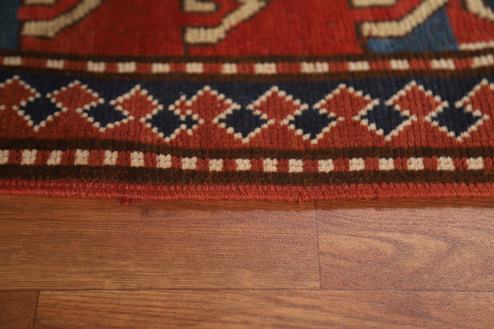 A Beautiful Genuine Russia Kazak (100% Vegetable Dye) rug is Hand Knotted by skillful weavers in Russia with 100% Wool Material. This rug is in Very Good (Evenly Low Pile) condition. dimensions are 9' 6'' X 4' 2'' in foot and 290 X 127 in centimeter. the primary color is Red.