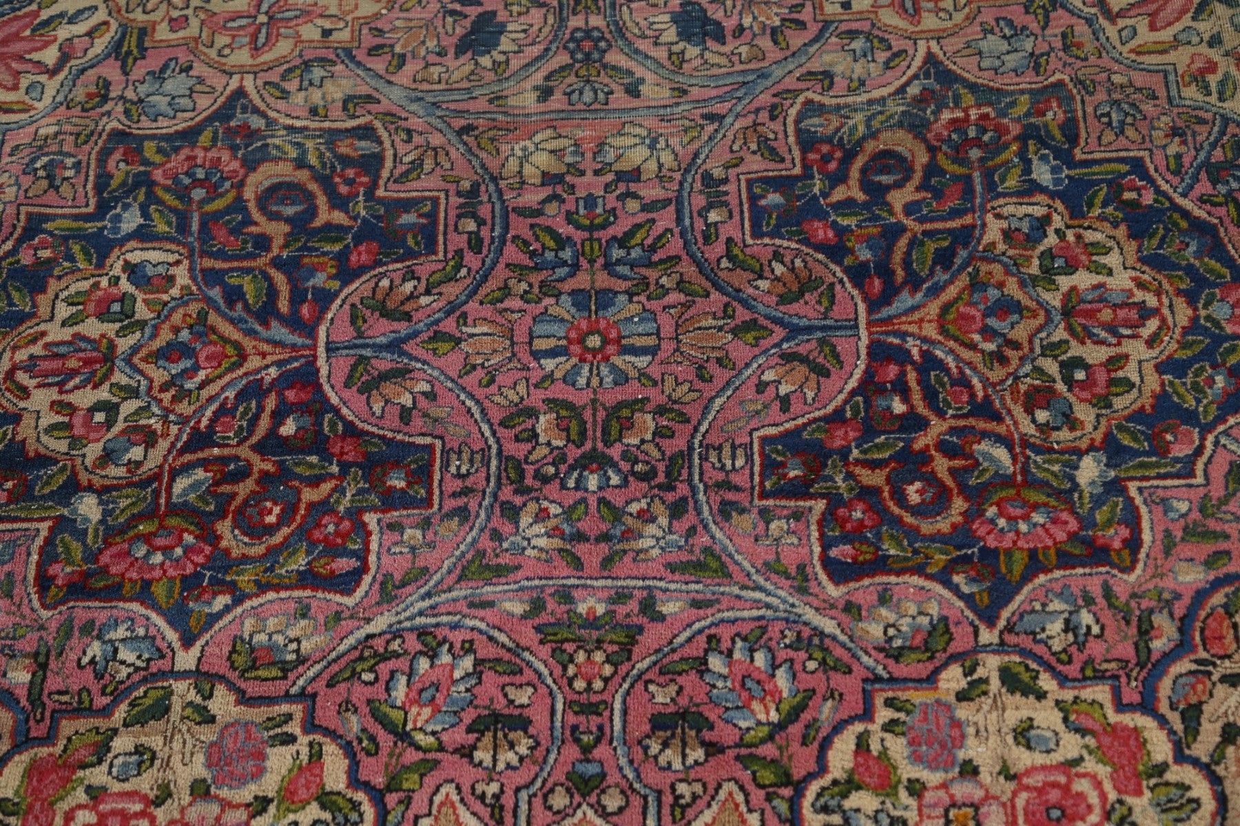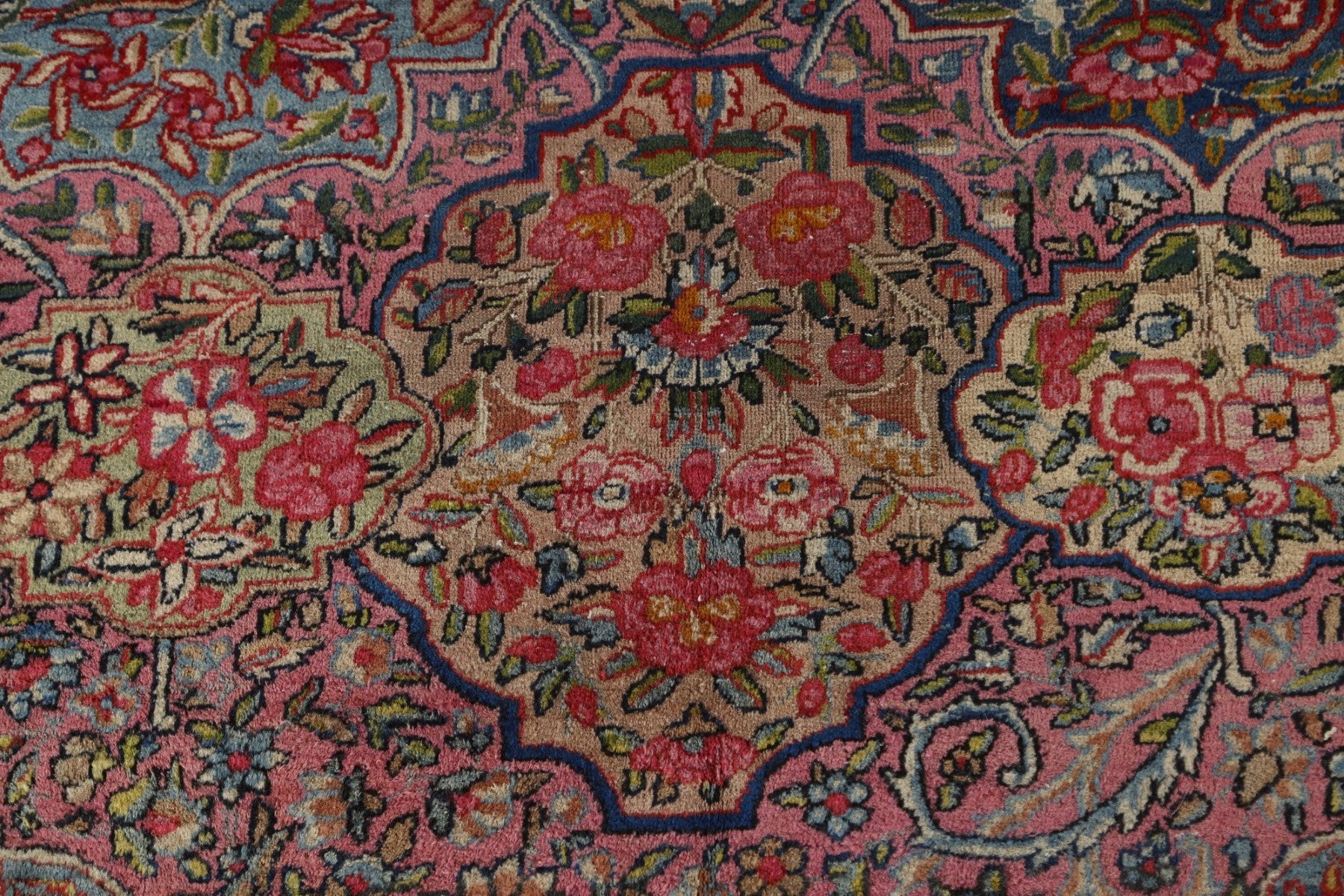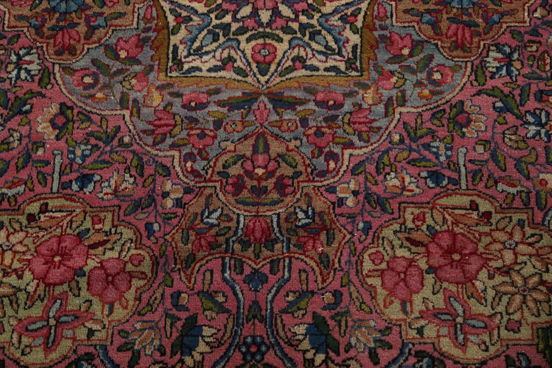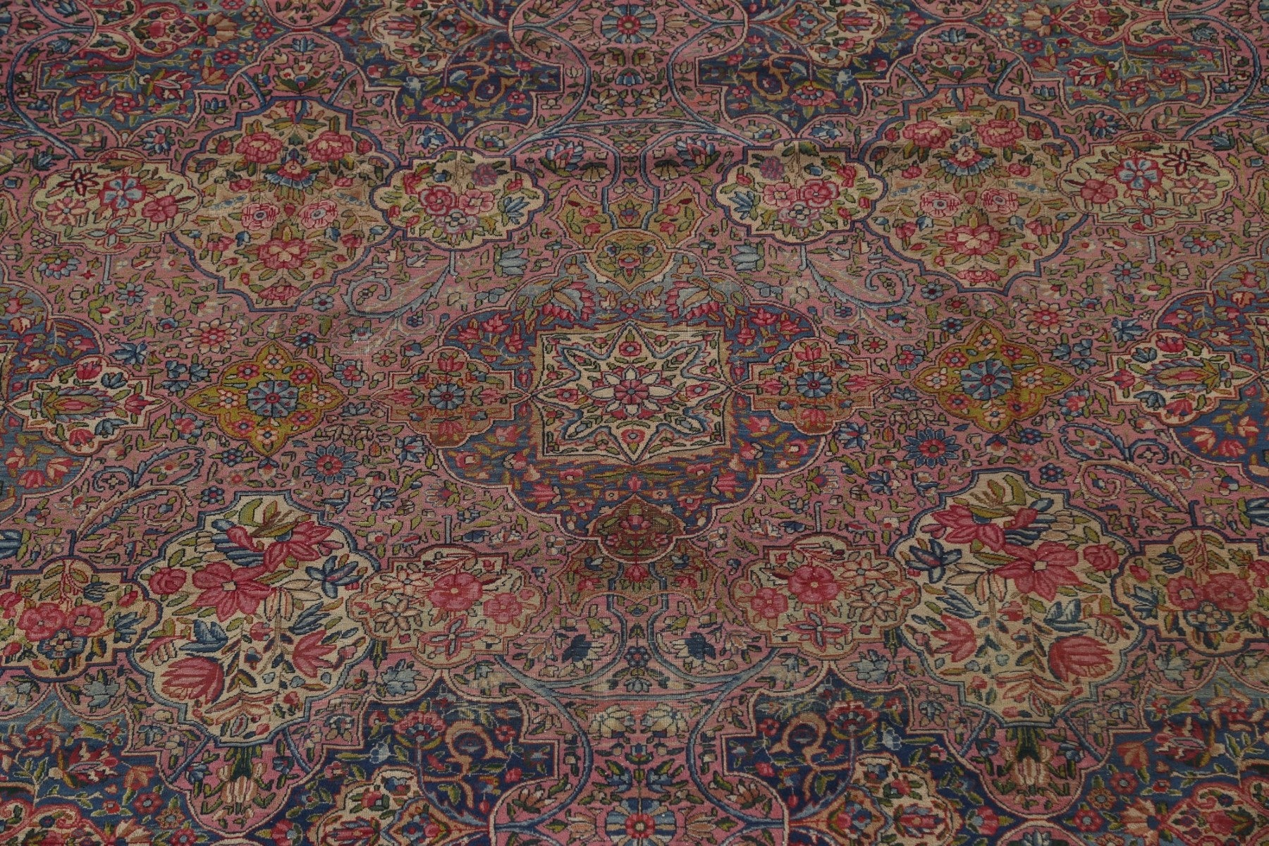 A Beautiful Genuine Persia ( Persia ) Kerman (Lavar) rug is Hand Knotted by skillful weavers in Persia ( Persia ) with 100% Wool Material. This rug is in Very Good (Evenly Low Pile) condition. dimensions are 12' 9'' X 9' 10'' in foot and 389 X 300 in centimeter. the primary color is Pink.