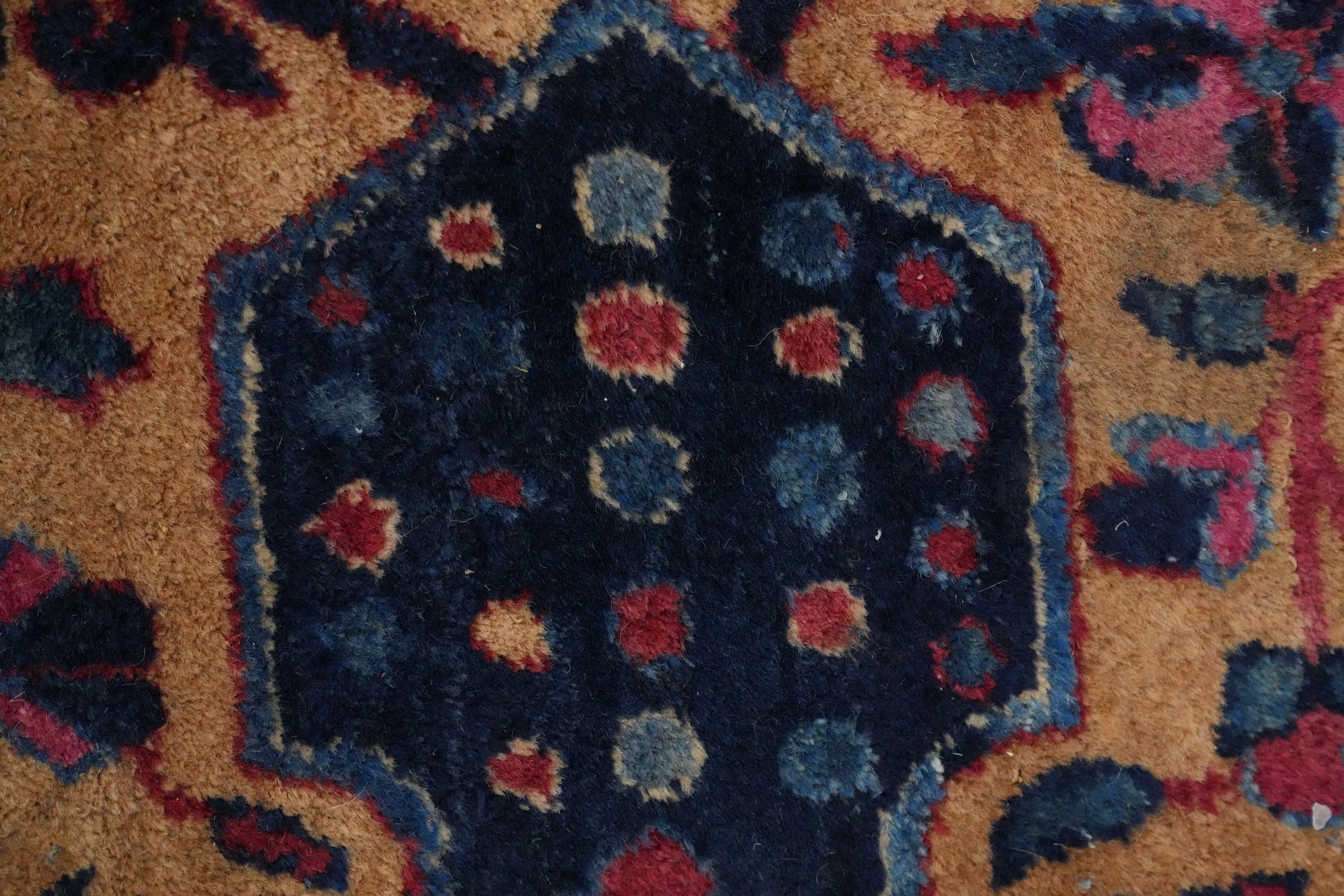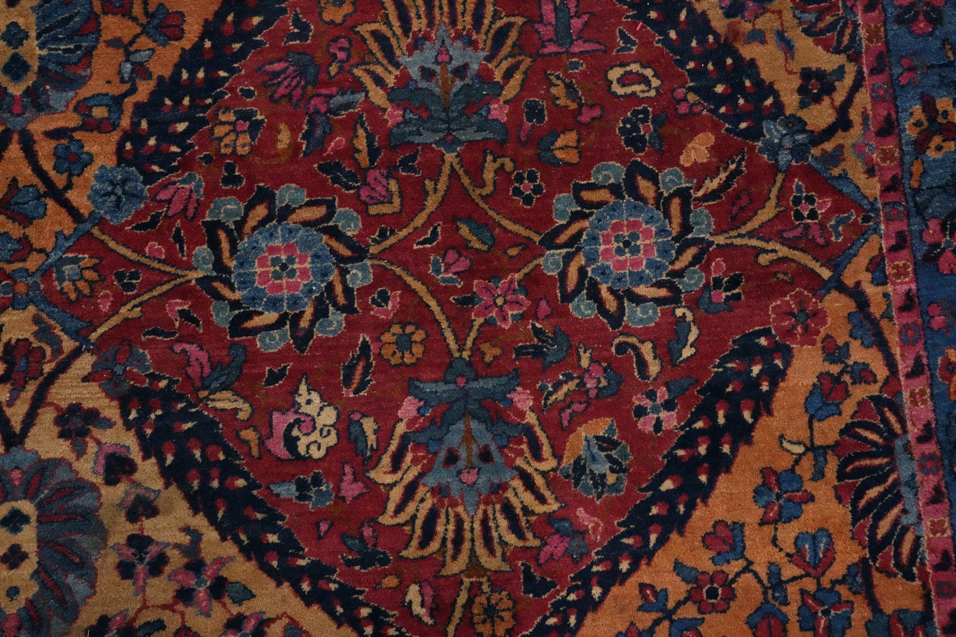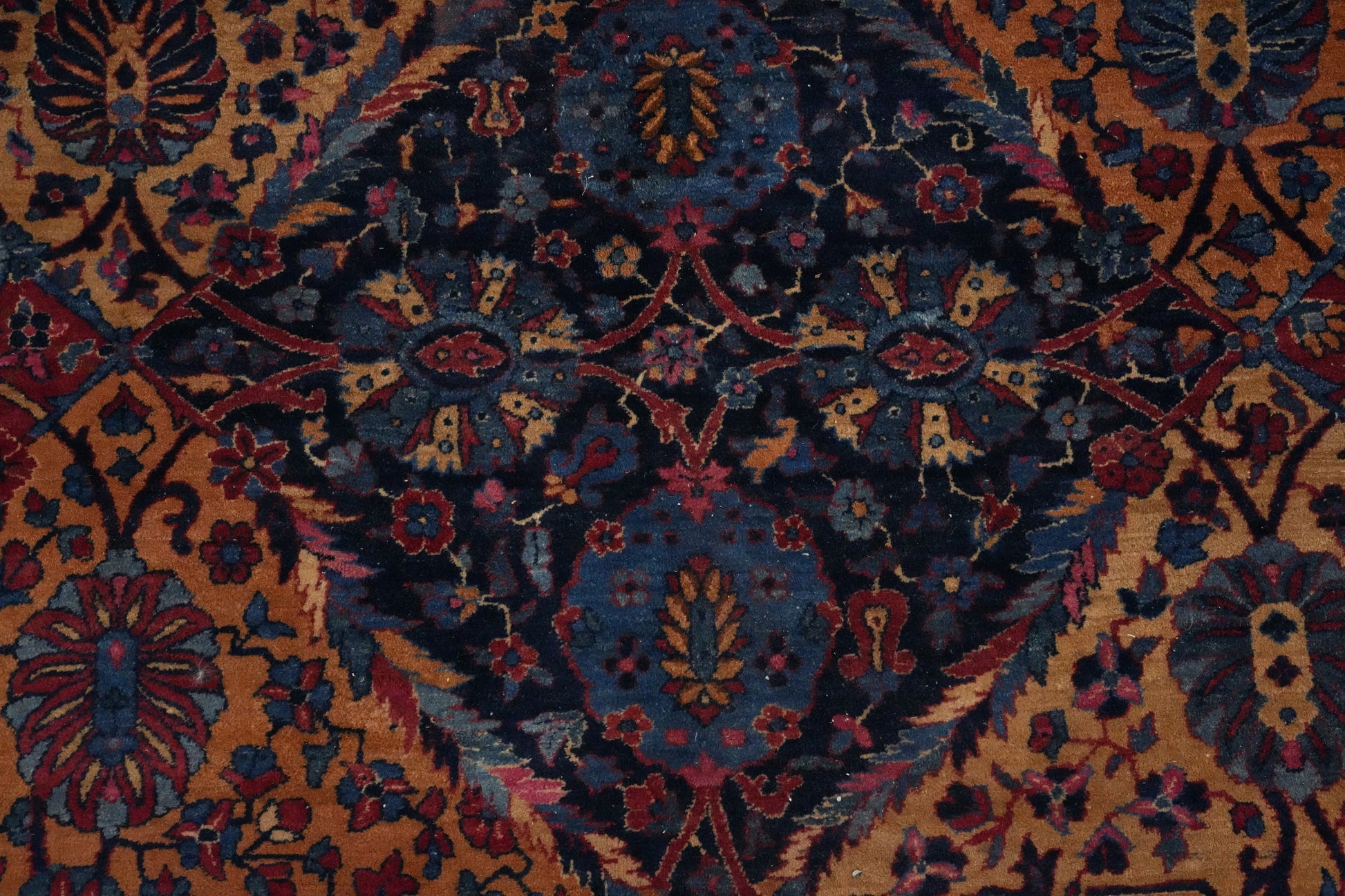 A Beautiful Genuine Persia ( Persia ) Kerman rug is Hand Knotted by skillful weavers in Persia ( Persia ) with 100% Kork Wool Material. This rug is in Very Good (Abrash) condition. dimensions are 18' 2'' X 11' 9'' in foot and 554 X 358 in centimeter. the primary color is Oranges & Rust.