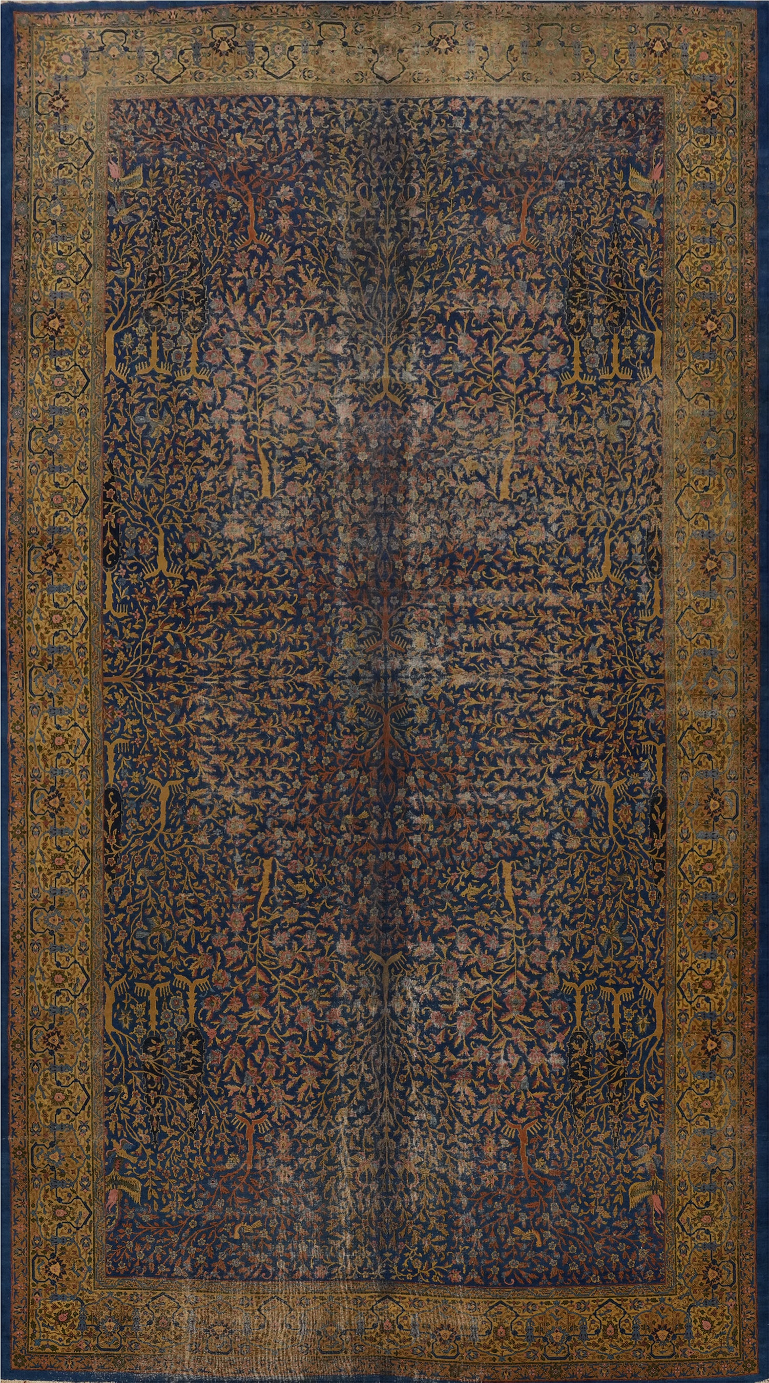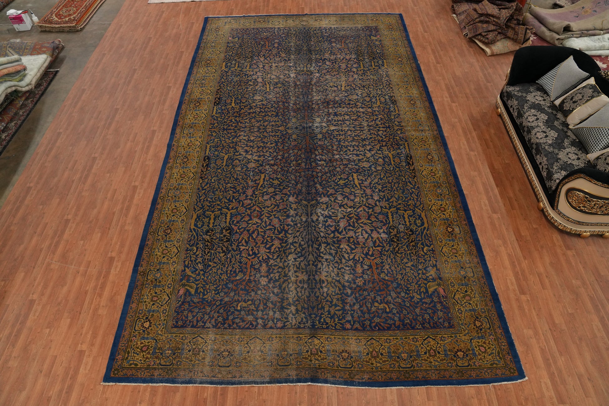 A Beautiful Genuine Persia ( Persia ) Kerman (Ravar) rug is Hand Knotted by skillful weavers in Persia ( Persia ) with 100% Wool Material. This rug is in Very Good (Evenly Low Pile) condition. dimensions are 21' 2'' X 11' 9'' in foot and 645 X 358 in centimeter. the primary color is Navy Blue & Blues.