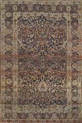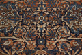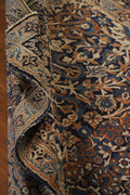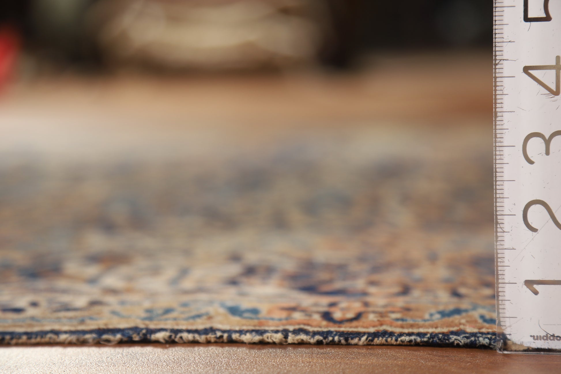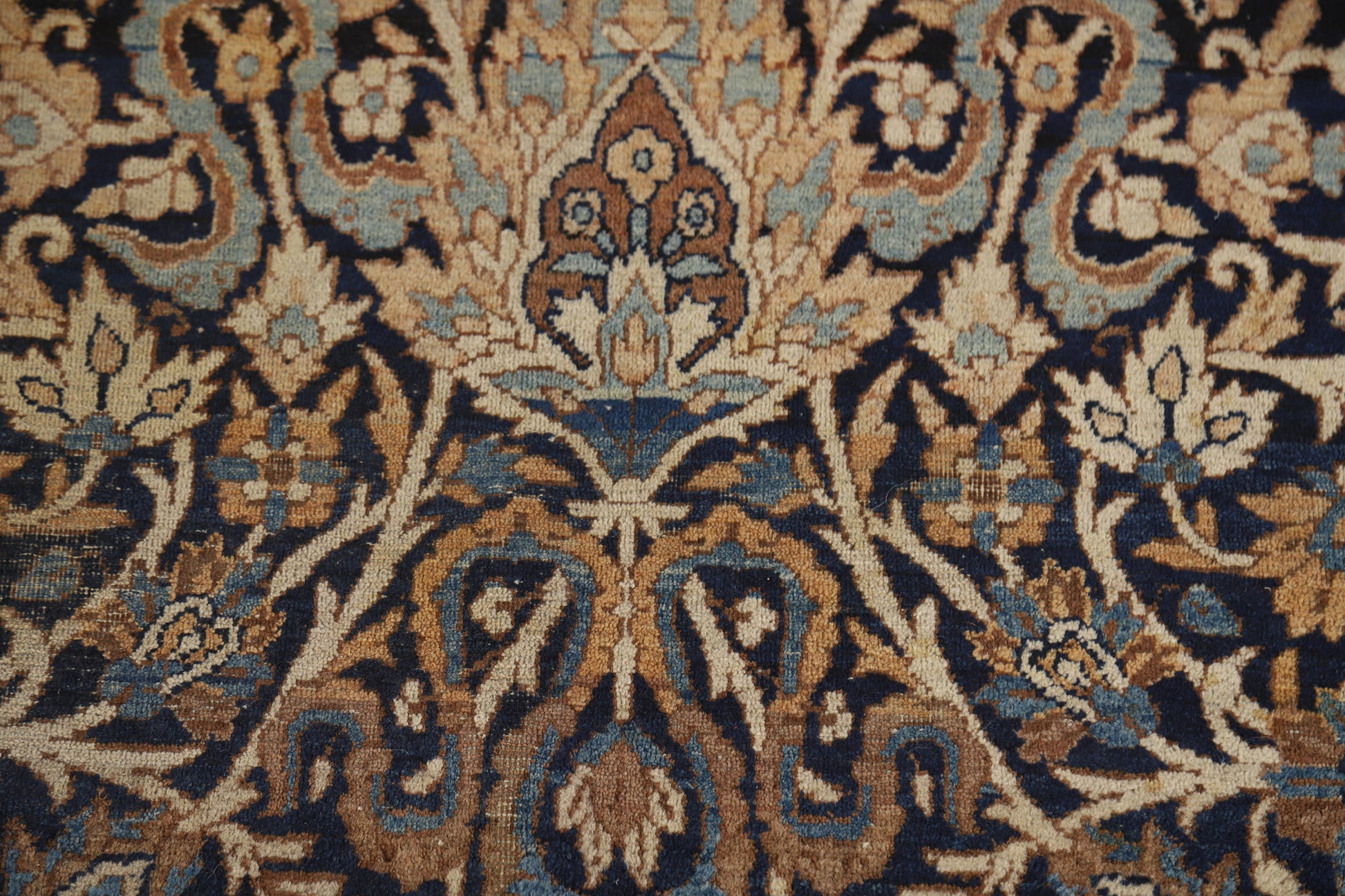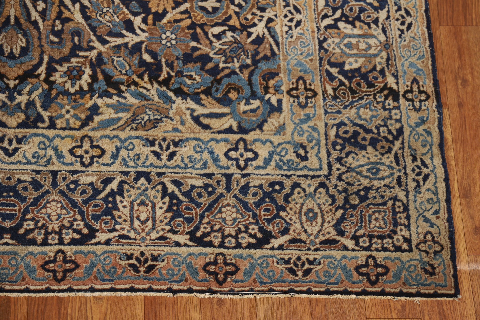 A Beautiful Genuine Persia ( Persia ) Kerman (Ravar) rug is Hand Knotted by skillful weavers in Persia ( Persia ) with 100% Wool Material. This rug is in Very Good (Evenly Low Pile) condition. dimensions are 7' 0'' X 4' 7'' in foot and 213 X 140 in centimeter. the primary color is Navy Blue & Blues.