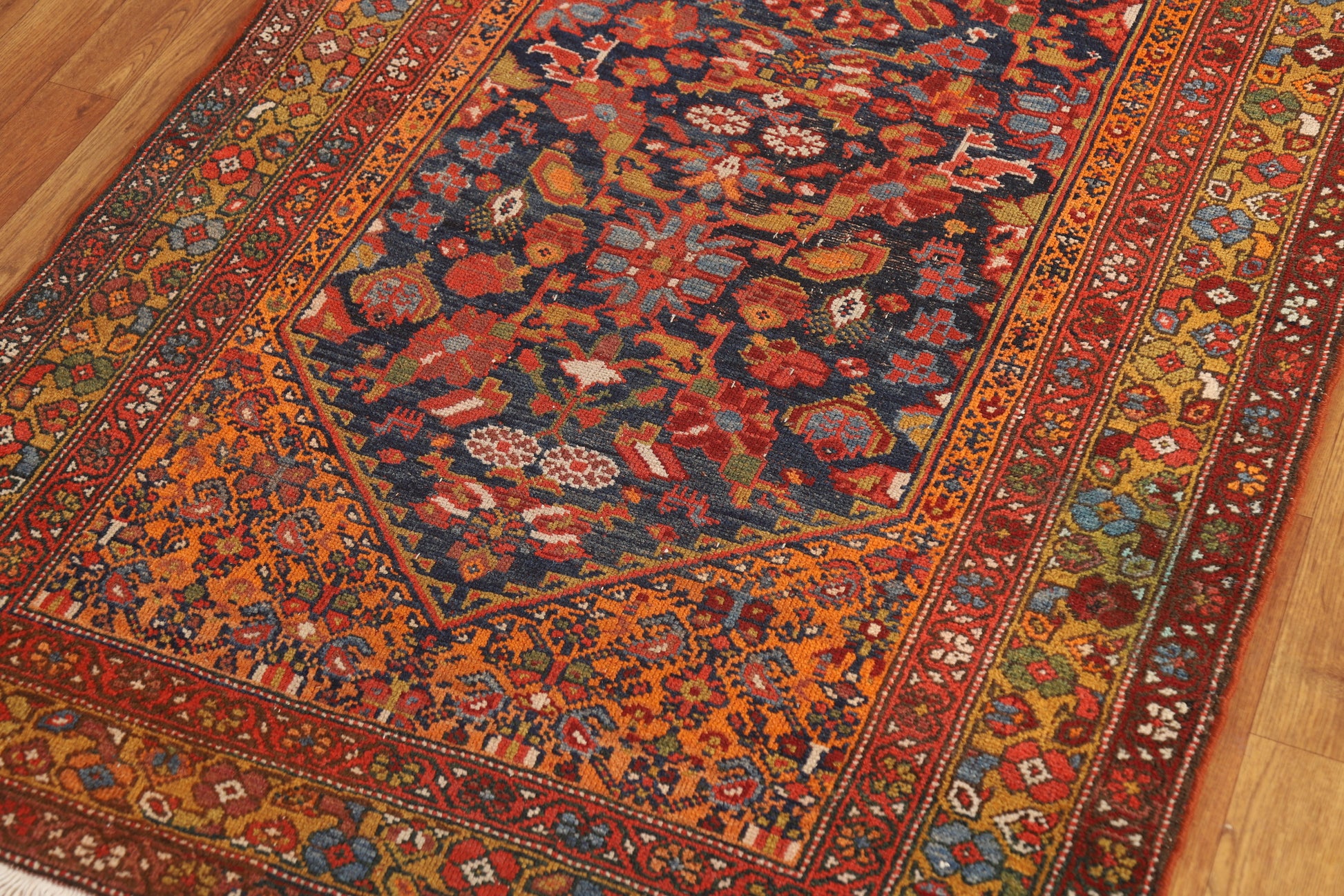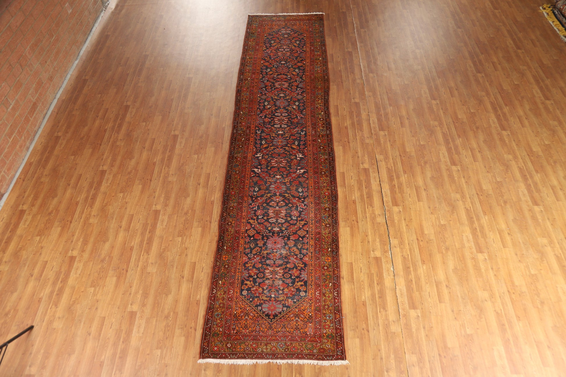 A Beautiful Genuine Persia ( Persia ) Malayer rug is Hand Knotted by skillful weavers in Persia ( Persia ) with 100% Wool Material. This rug is in Very Good (Evenly Low Pile) condition. dimensions are 15' 8'' X 3' 7'' in foot and 478 X 109 in centimeter. the primary color is Navy Blue & Blues.