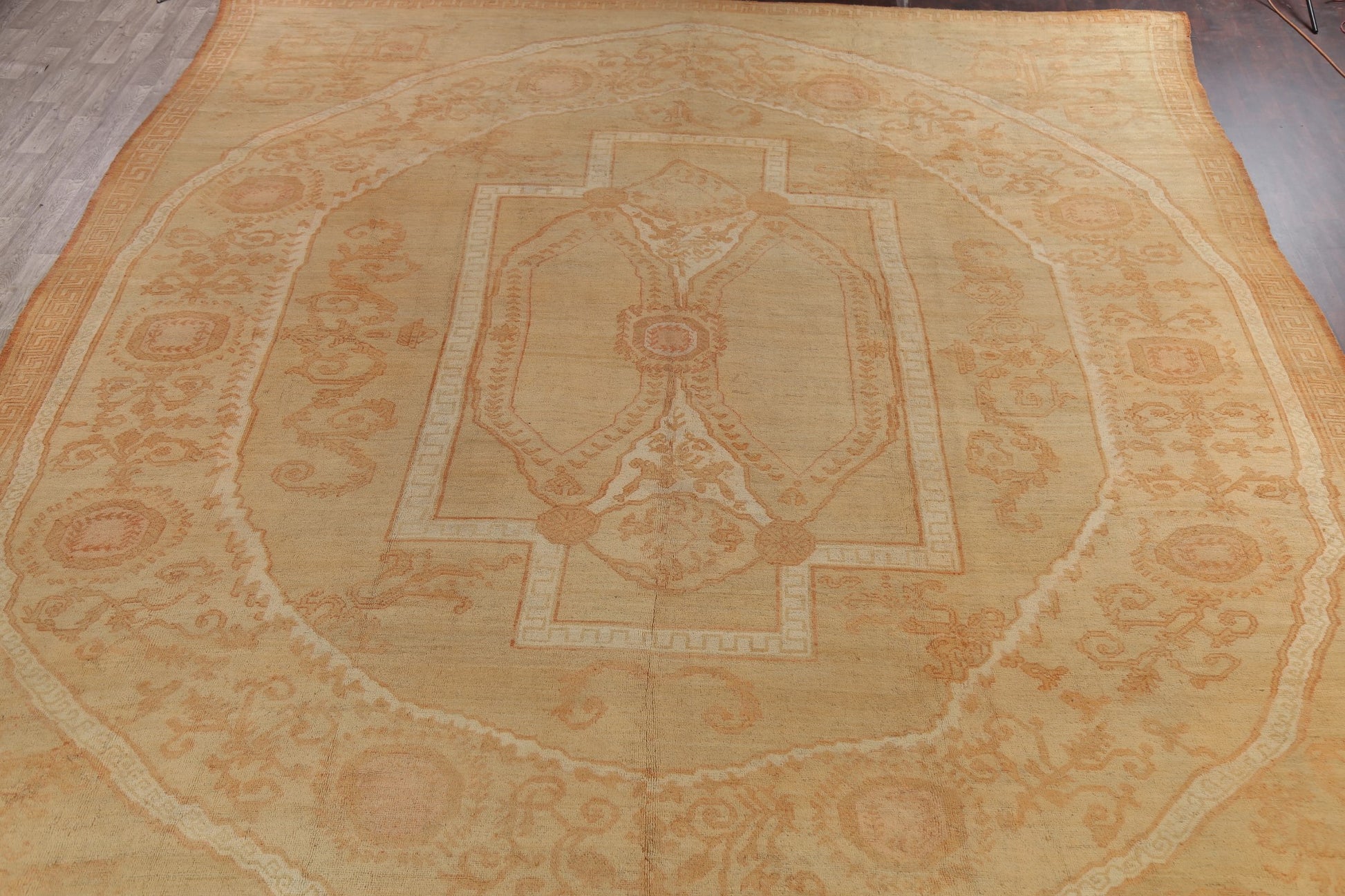 A Beautiful Genuine Turkey Oushak rug is Hand Knotted by skillful weavers in Turkey with 100% Wool Material. This rug is in Very Good condition. dimensions are 23' 3'' X 17' 9'' in foot and 709 X 541 in centimeter. the primary color is Green.