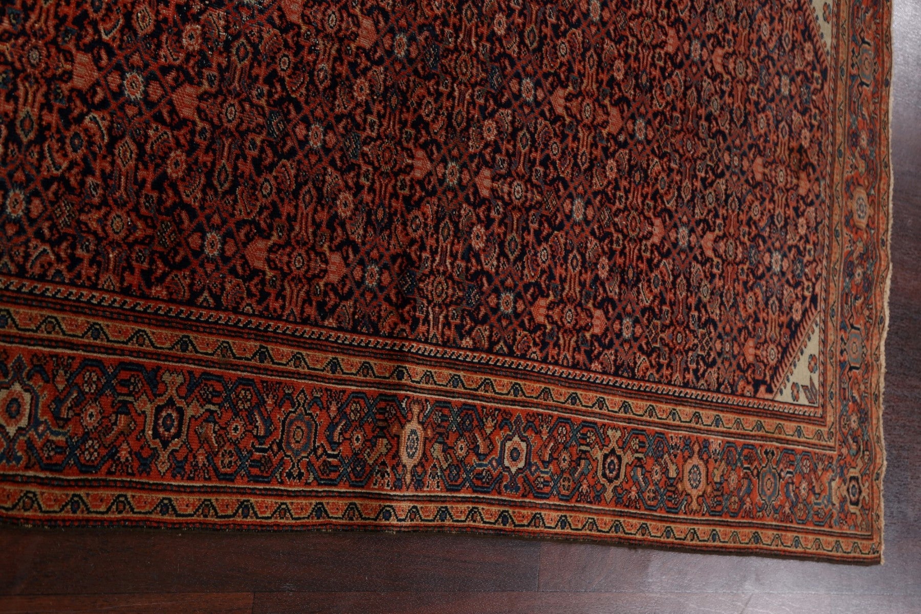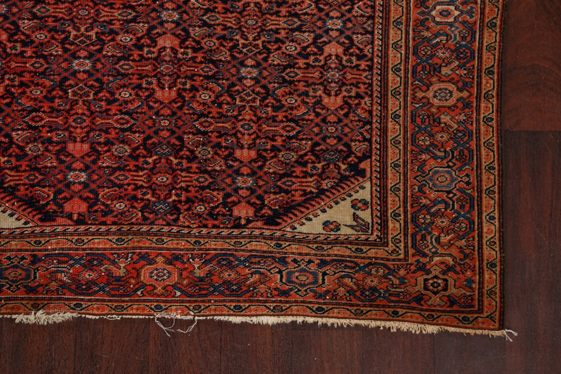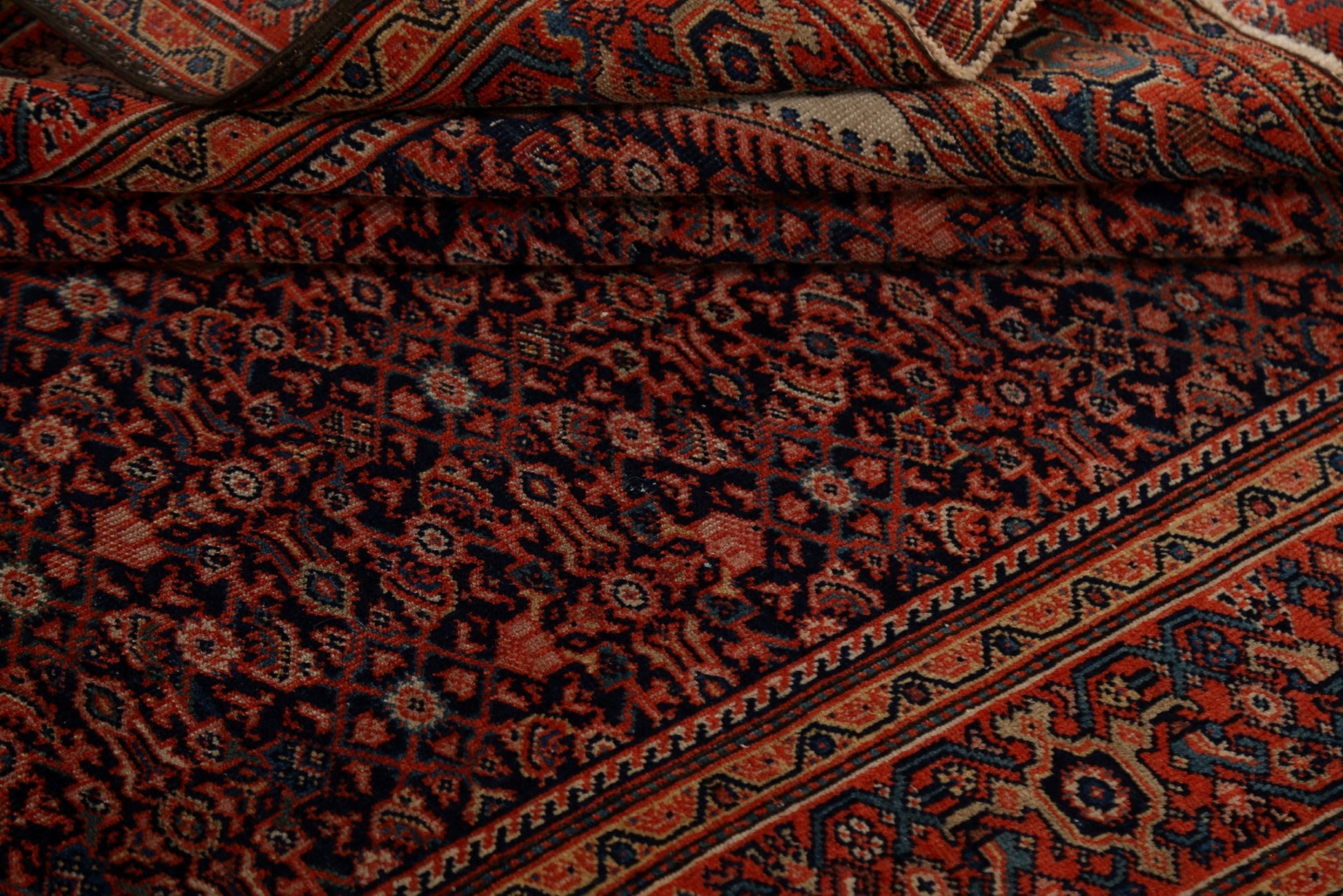 A Beautiful Genuine Persia ( Persia ) Sarouk (Farahan) rug is Hand Knotted by skillful weavers in Persia ( Persia ) with 100% Wool Material. This rug is in Very Good (Evenly Low Pile) condition. dimensions are 6' 6'' X 4' 1'' in foot and 198 X 124 in centimeter. the primary color is Navy Blue & Blues.