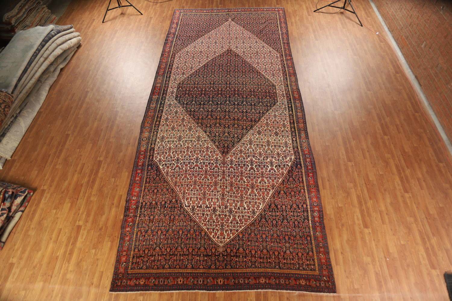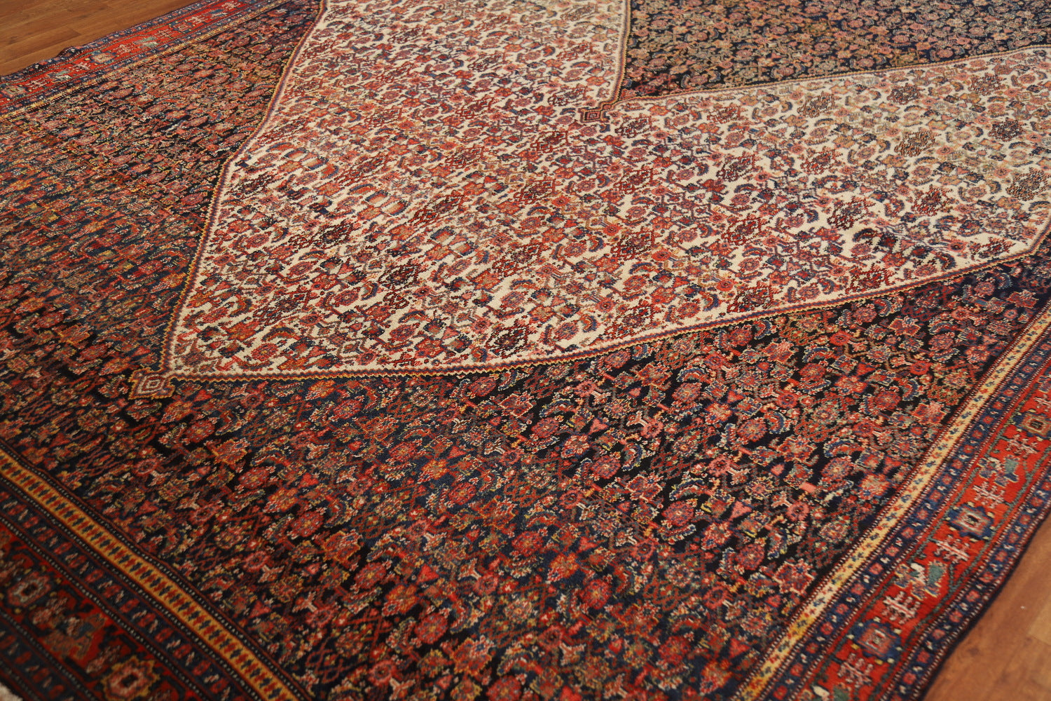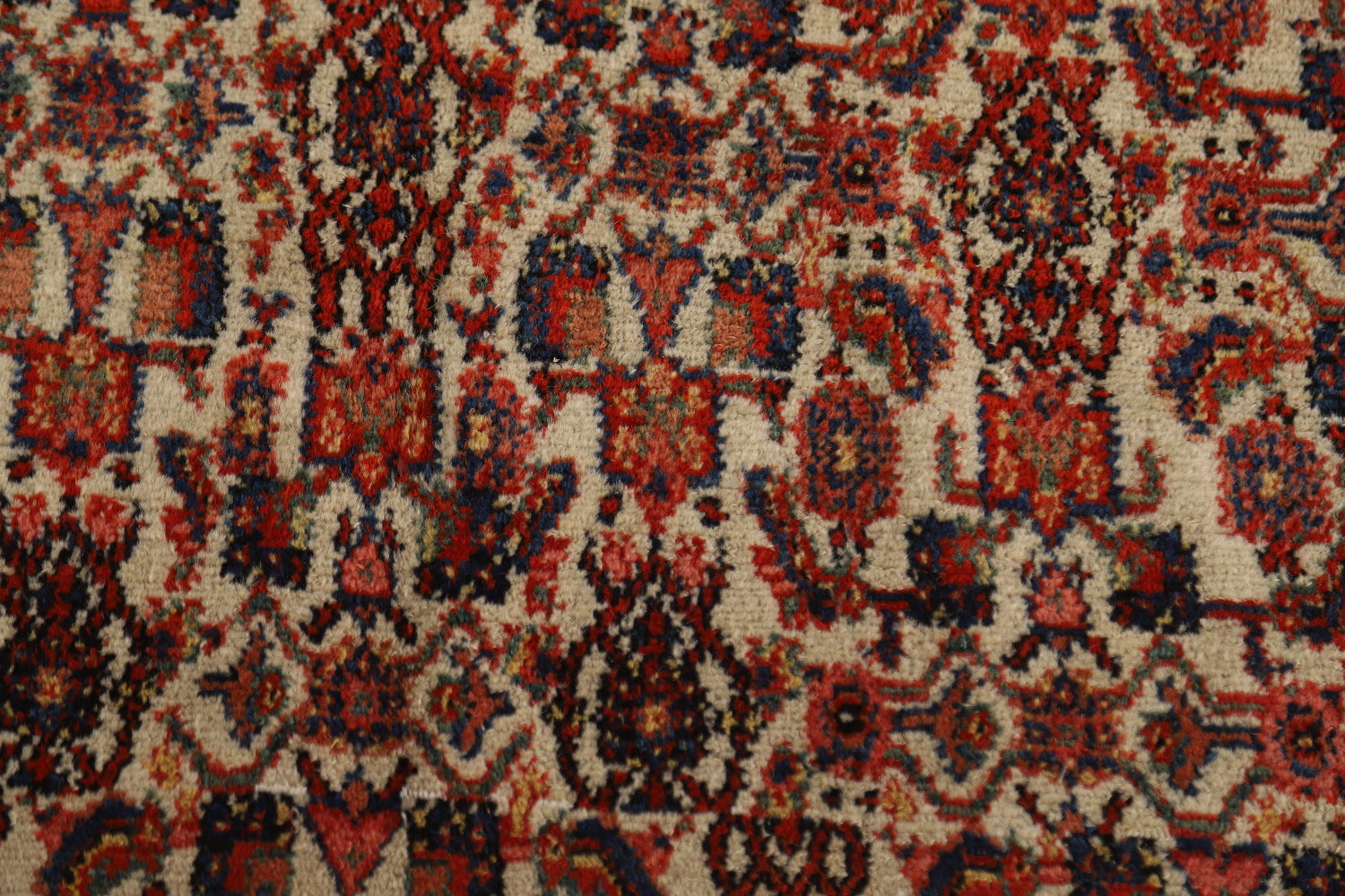 A Beautiful Genuine Persia ( Persia ) Senneh rug is Hand Knotted by skillful weavers in Persia ( Persia ) with 100% Wool Material. This rug is in Very Good (Abrash) condition. dimensions are 19' 11'' X 8' 4'' in foot and 607 X 254 in centimeter. the primary color is Navy Blue & Blues.