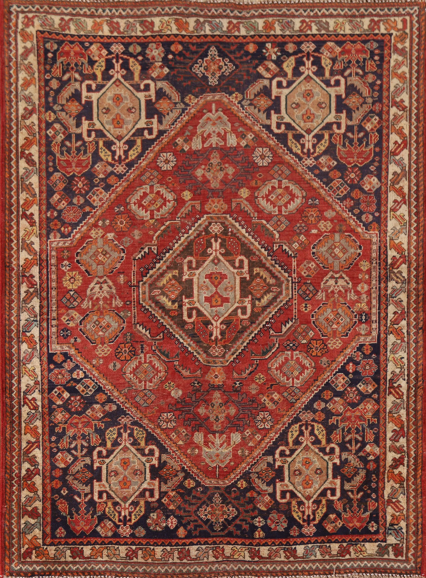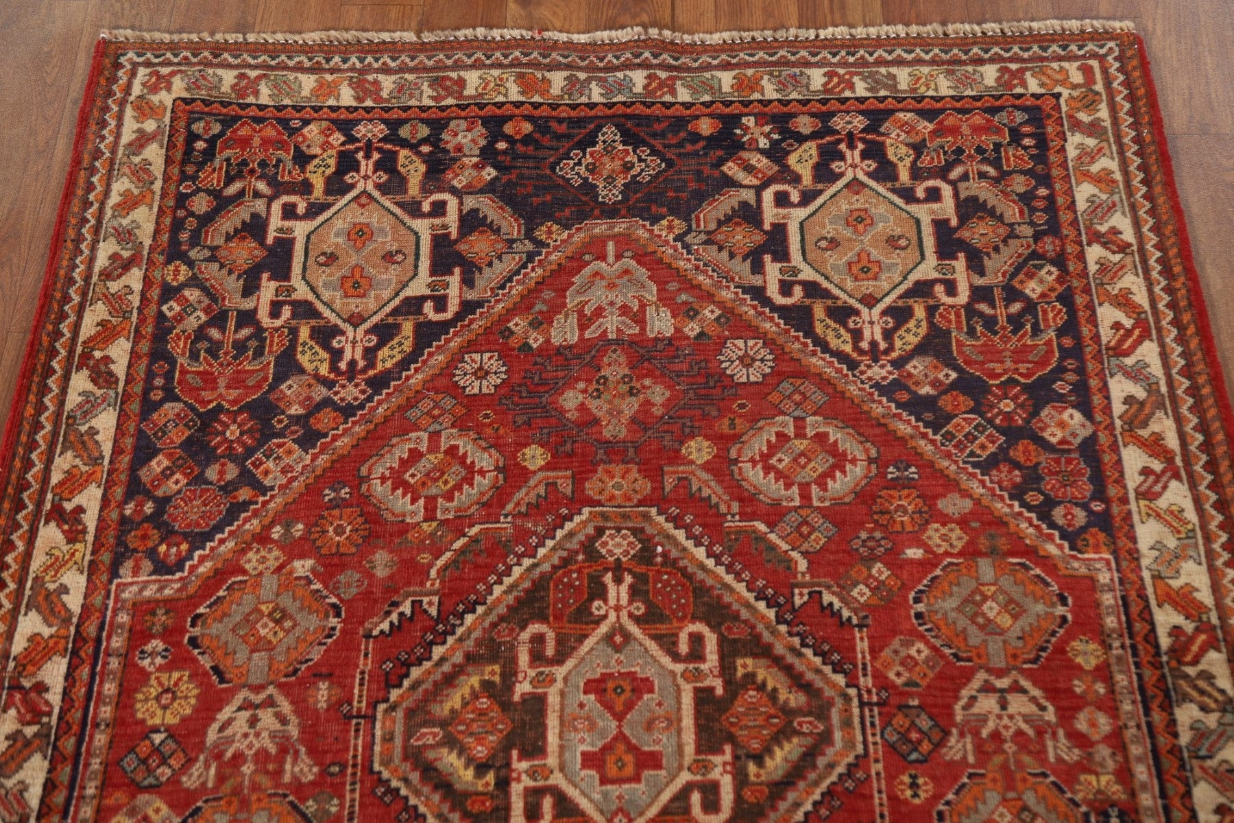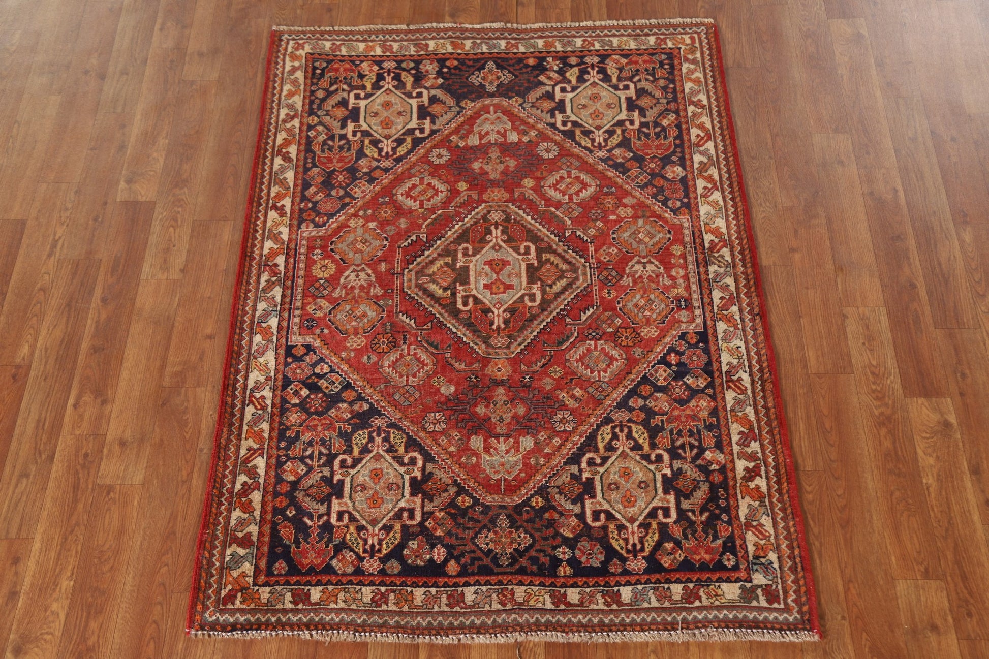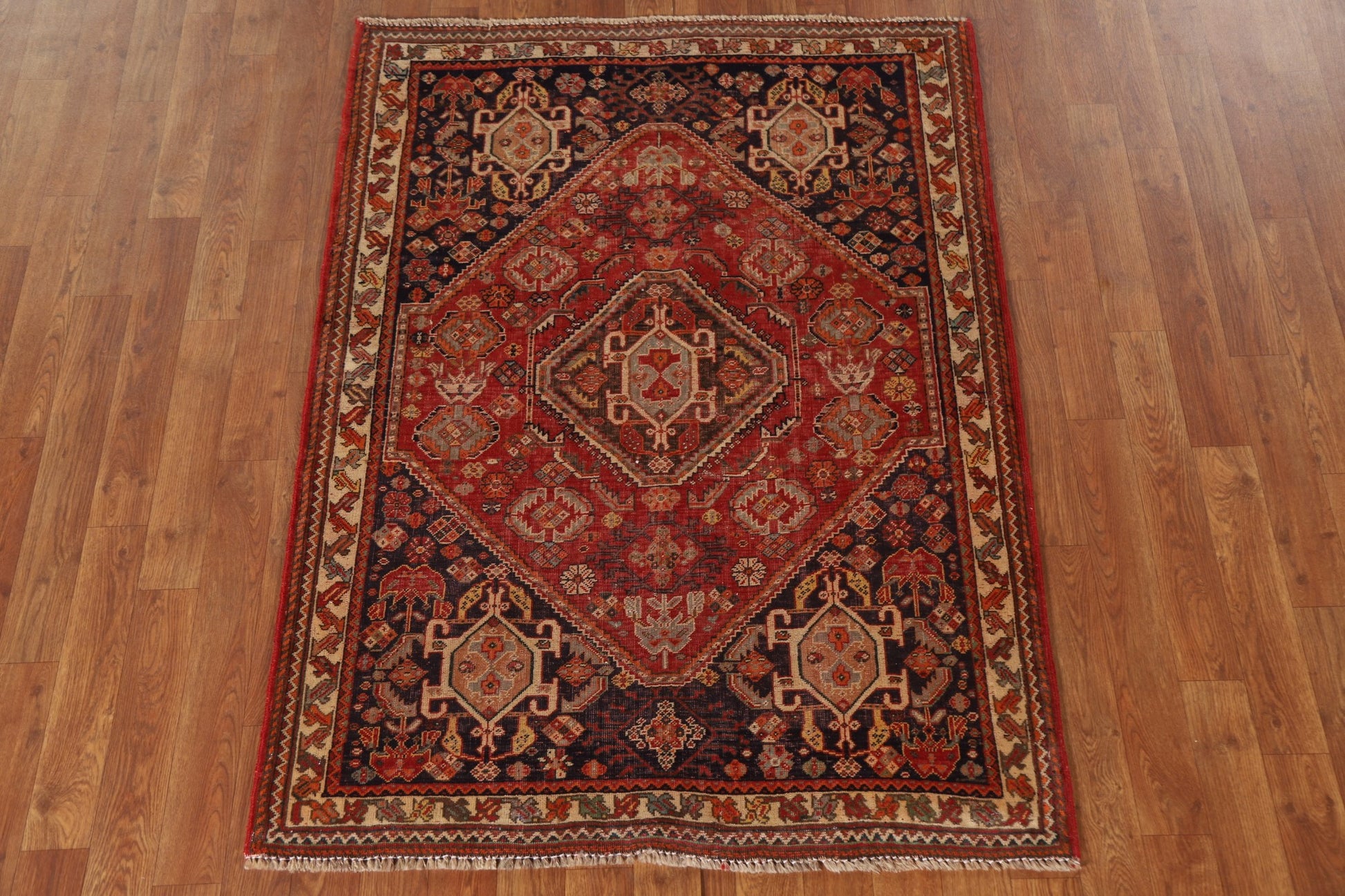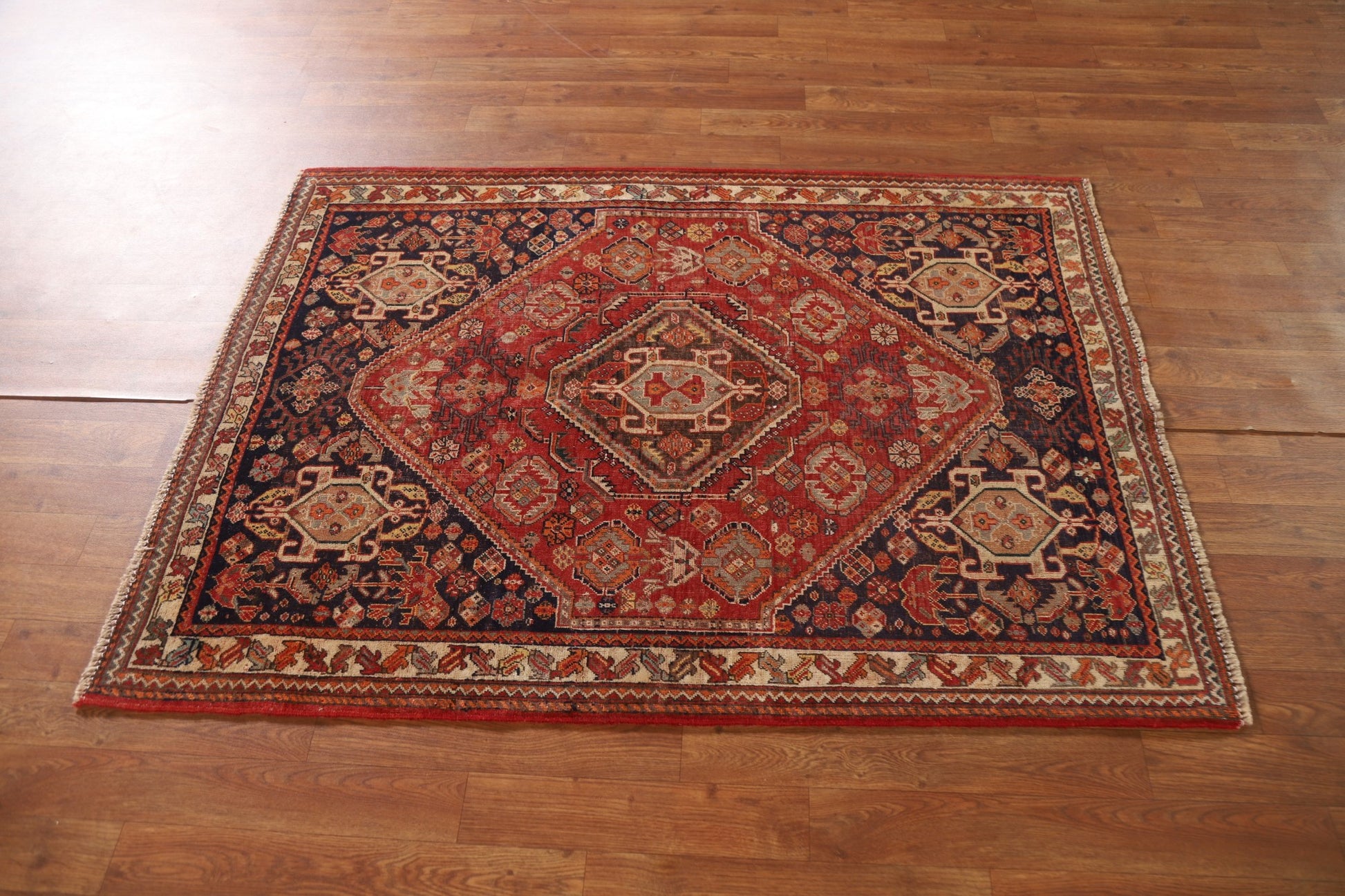 A Beautiful Genuine Persia ( Persia ) Shiraz rug is Hand Knotted by skillful weavers in Persia ( Persia ) with 100% Wool Material. This rug is in Very Good (Evenly Low Pile) condition. dimensions are 4' 9'' X 3' 5'' in foot and 145 X 104 in centimeter. the primary color is Red.