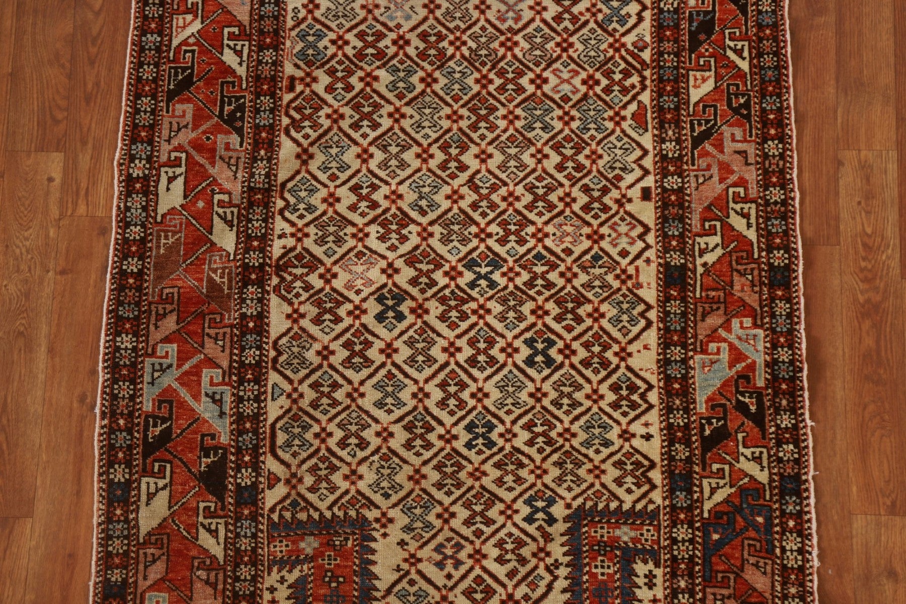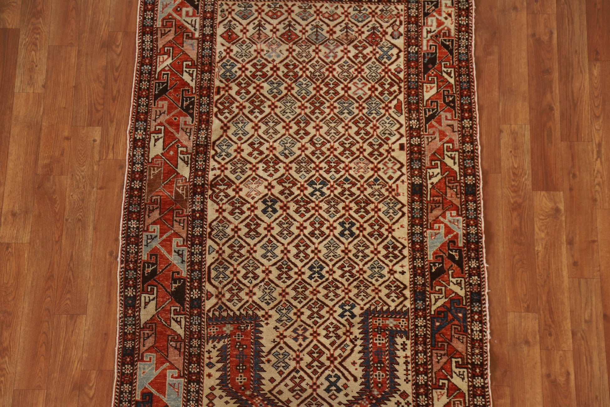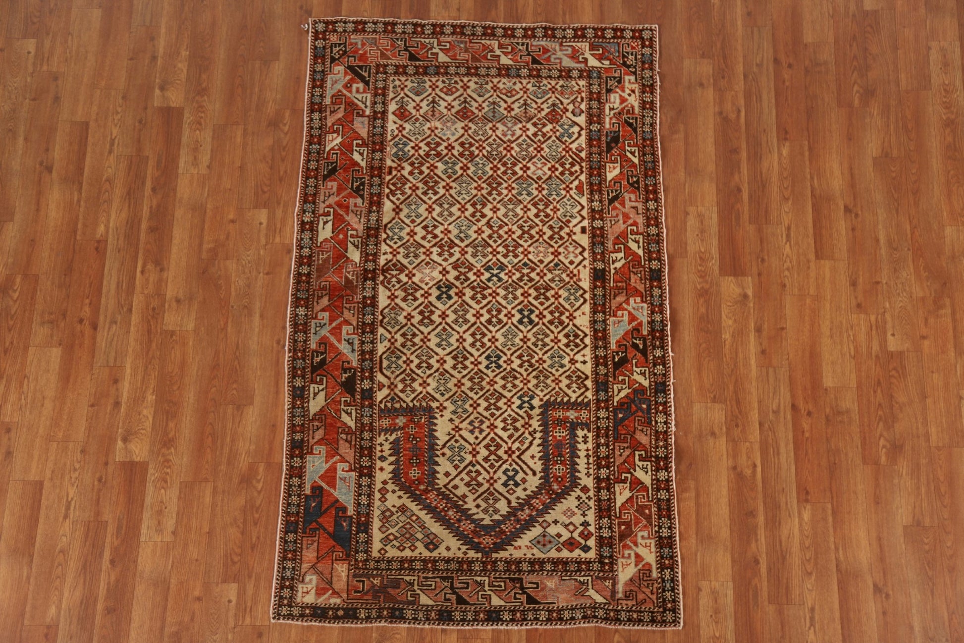 A Beautiful Genuine Russia Shirvan rug is Hand Knotted by skillful weavers in Russia with 100% Wool Material. This rug is in Very Good (Evenly Low Pile) condition. dimensions are 5' 6'' X 3' 3'' in foot and 168 X 99 in centimeter. the primary color is Beige & Ivories.