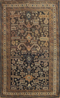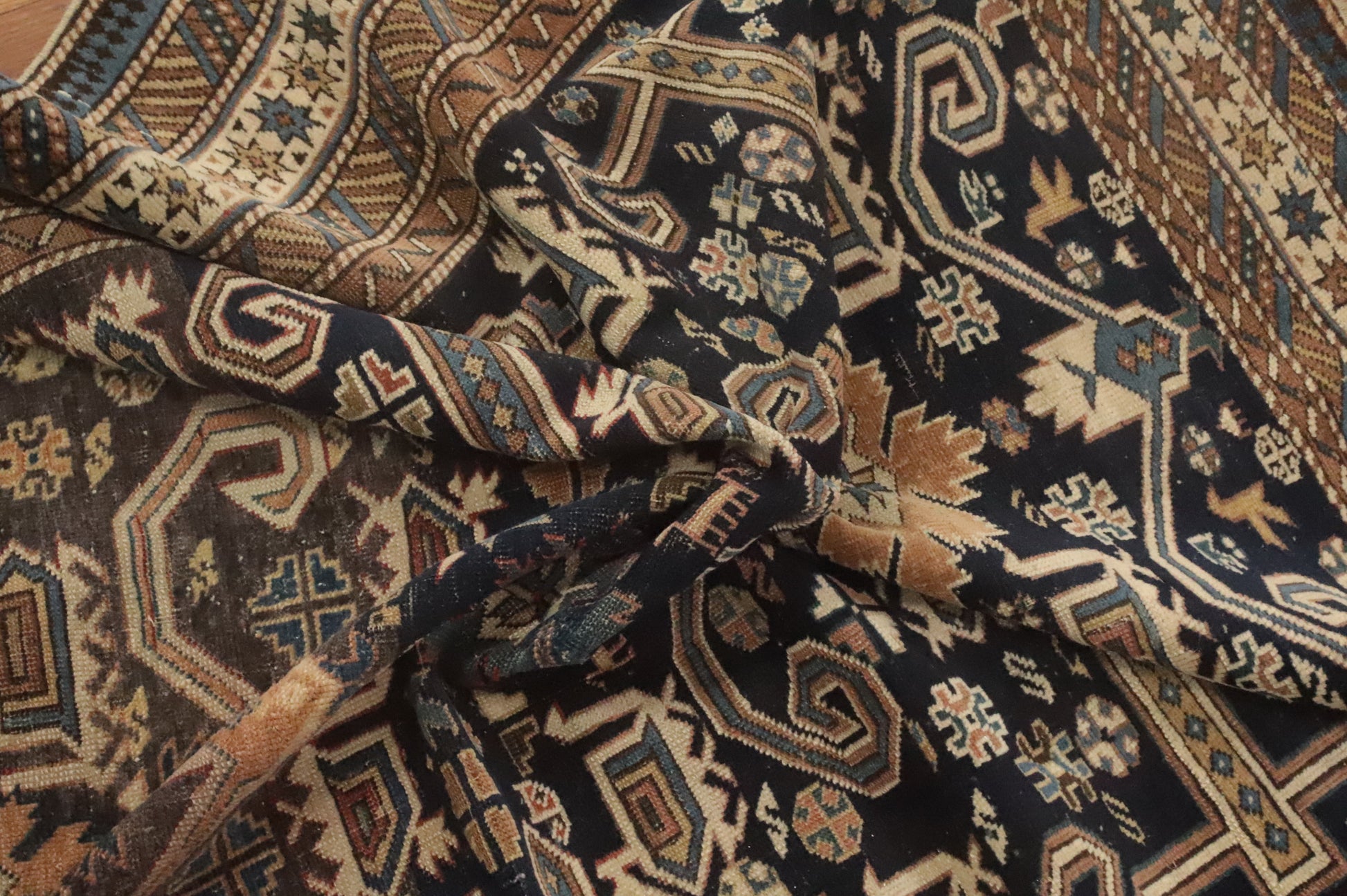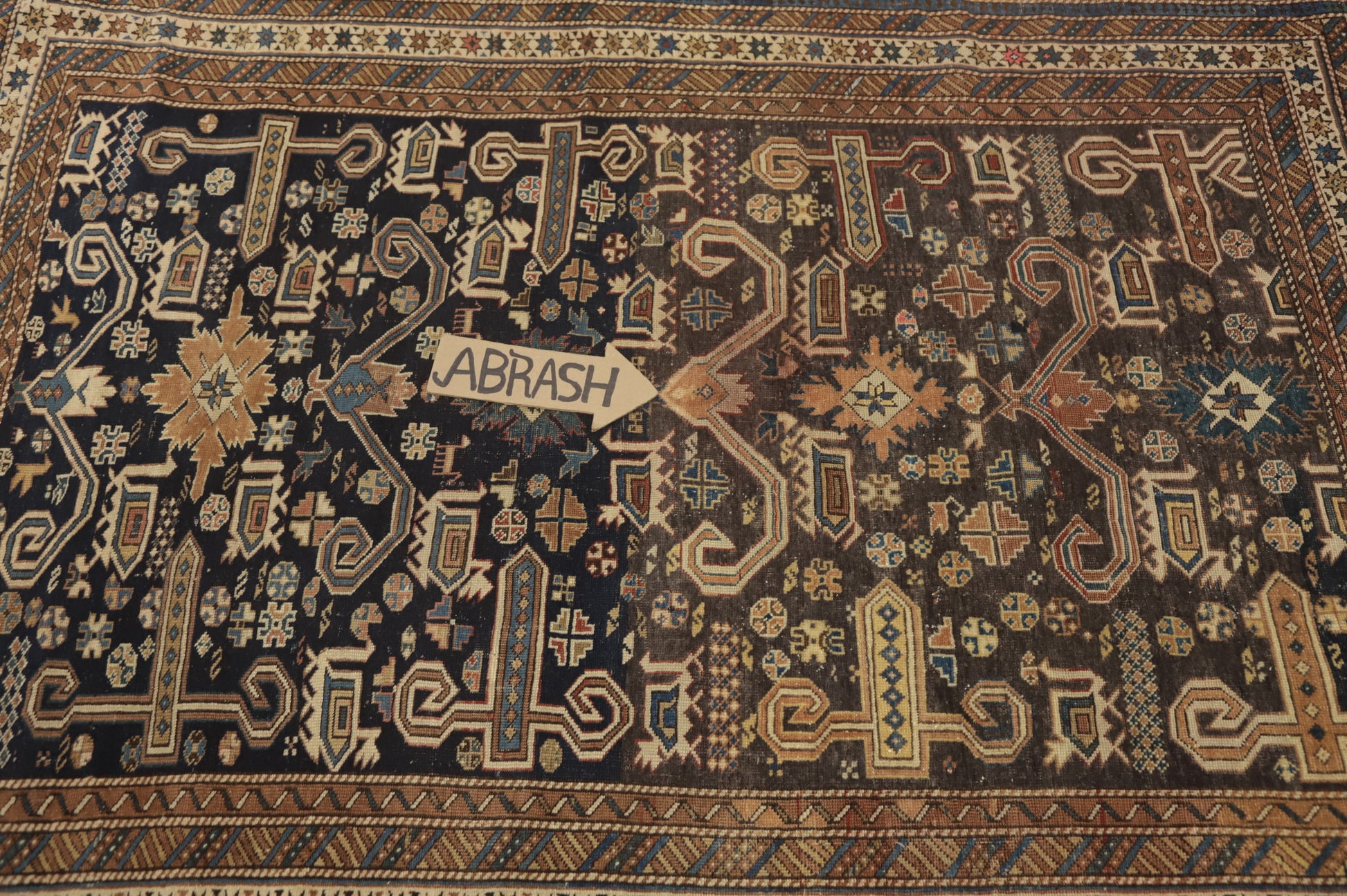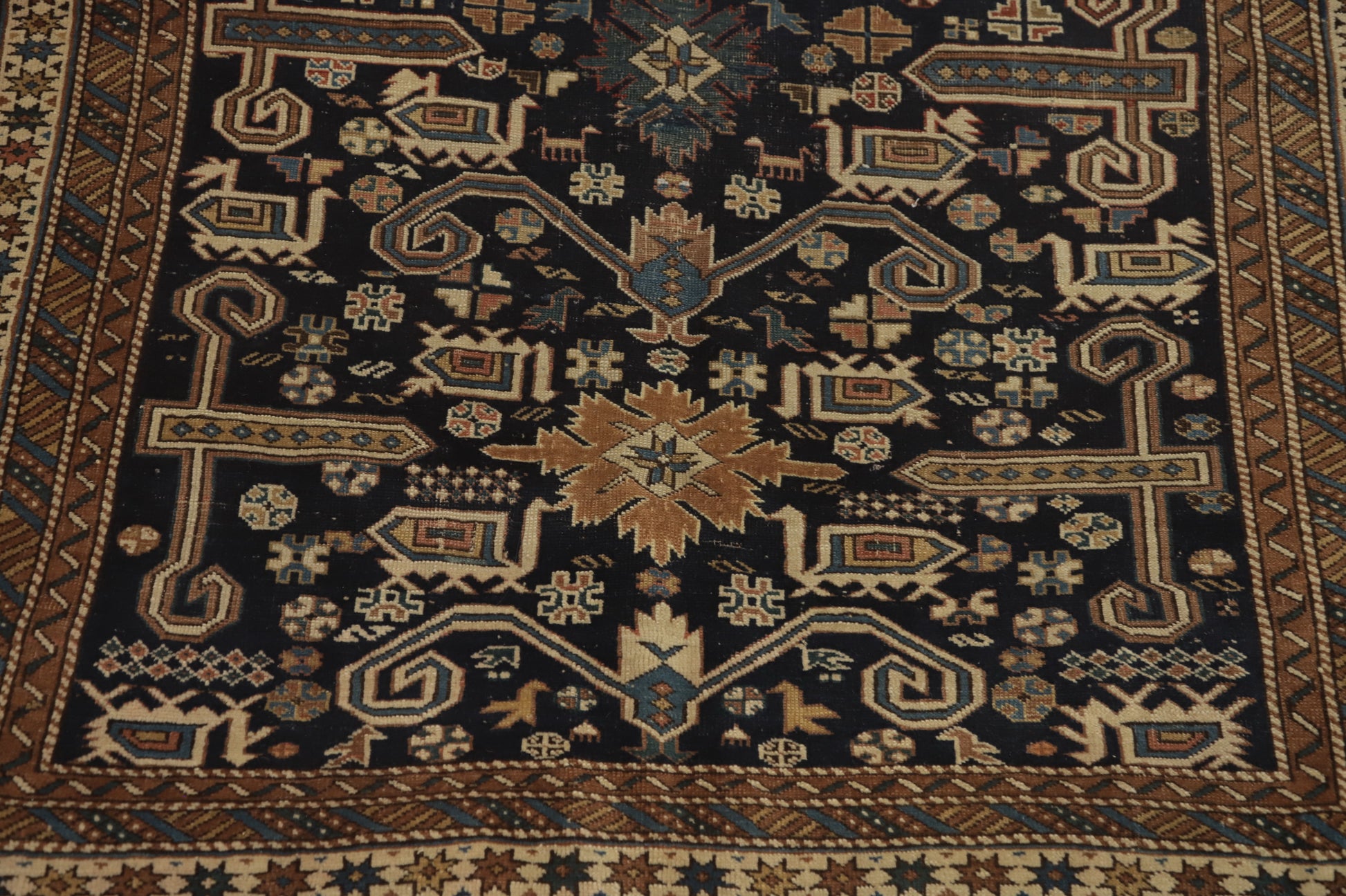 A Beautiful Genuine Russia Shirvan rug is Hand Knotted by skillful weavers in Russia with 100% Wool Material. This rug is in Very Good (Evenly Low Pile-Abrash) condition. dimensions are 5' 4'' X 3' 10'' in foot and 163 X 117 in centimeter. the primary color is Navy Blue & Blues.