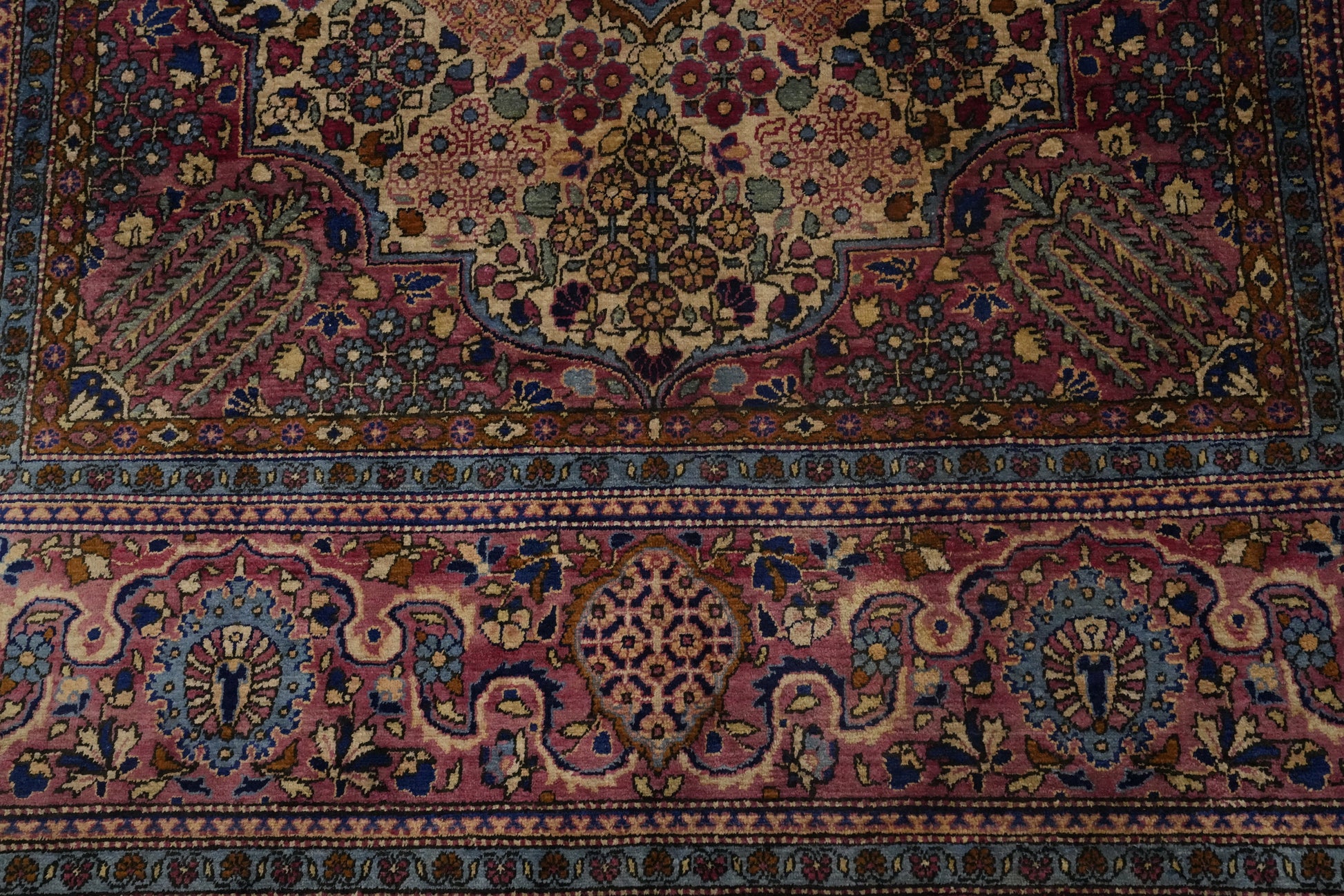 A Beautiful Genuine Persia ( Persia ) Kashan rug is Hand Knotted by skillful weavers in Persia ( Persia ) with 100% Silk Material. This rug is in Very Good condition. dimensions are 6' 8'' X 4' 3'' in foot and 203 X 130 in centimeter. the primary color is Beige & Ivories.