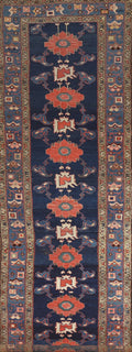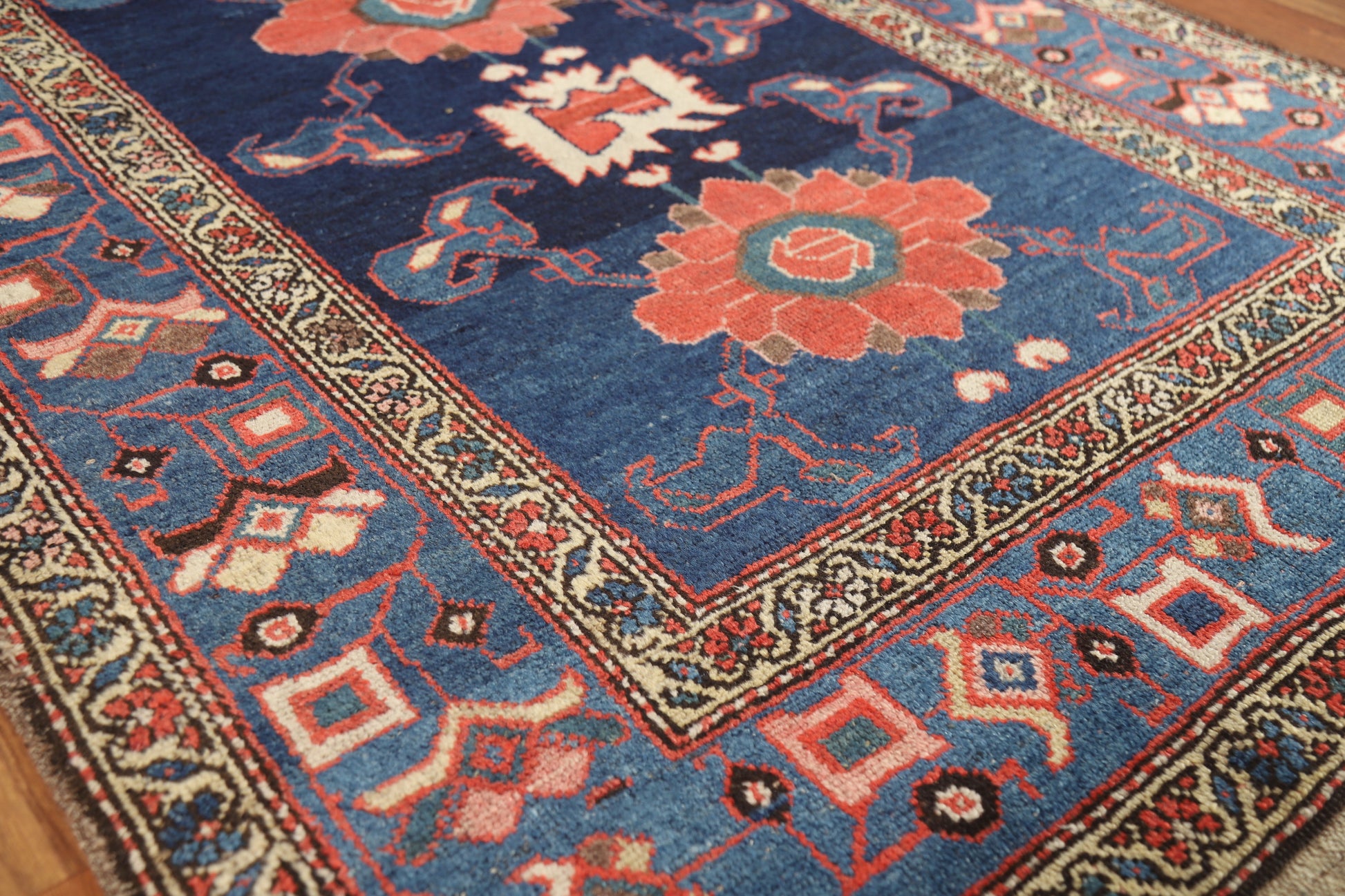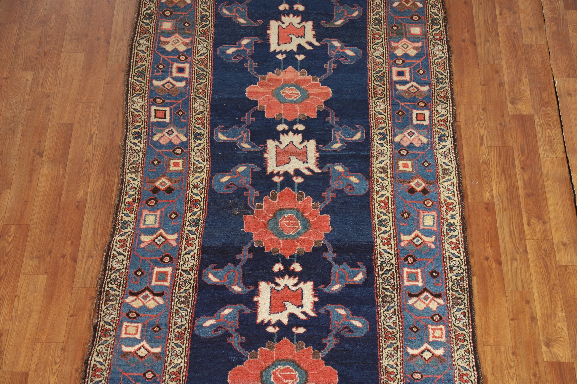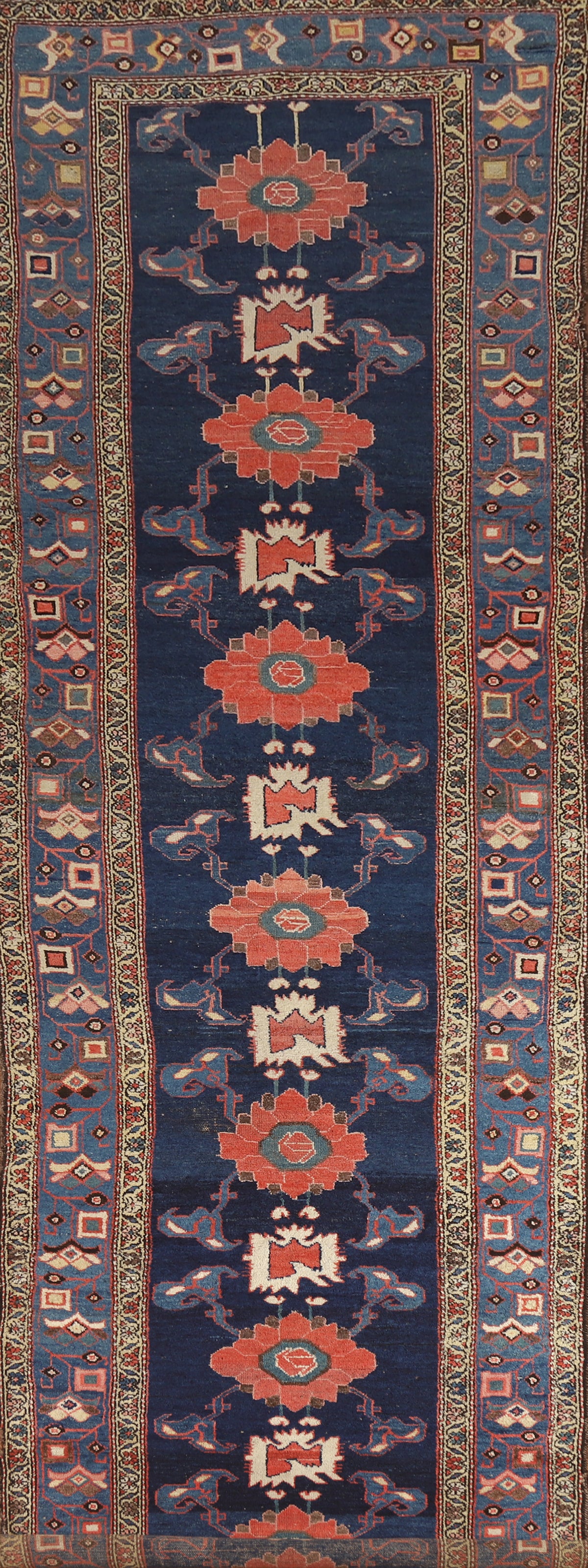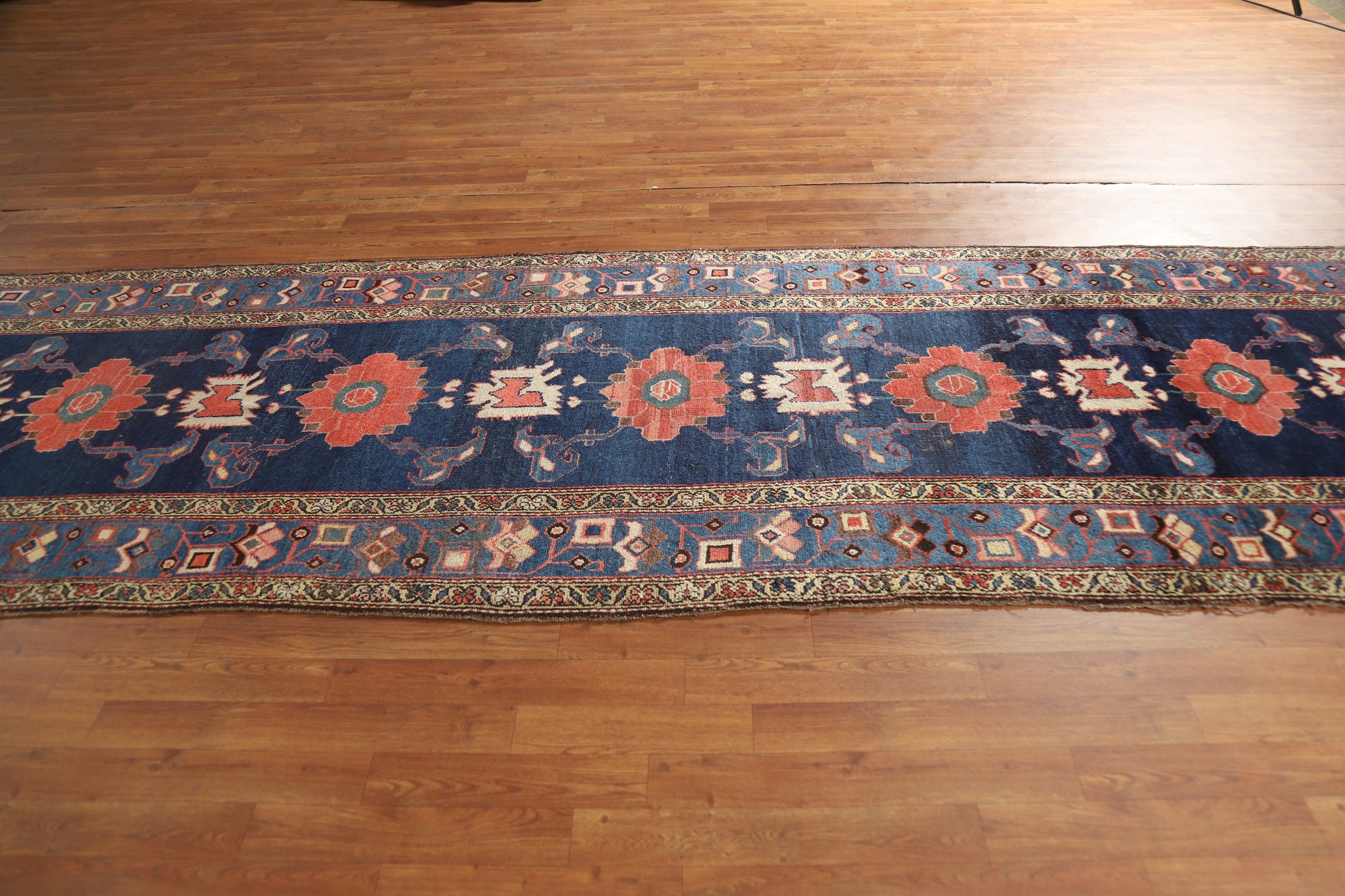 A Beautiful Genuine Persia ( Persia ) Heriz (Bakhshayesh) rug is Hand Knotted by skillful weavers in Persia ( Persia ) with 100% Wool Material. This rug is in Very Good ( Low Pile ) condition. dimensions are 14' 9'' X 3' 9'' in foot and 450 X 114 in centimeter. the primary color is Navy Blue & Blues.