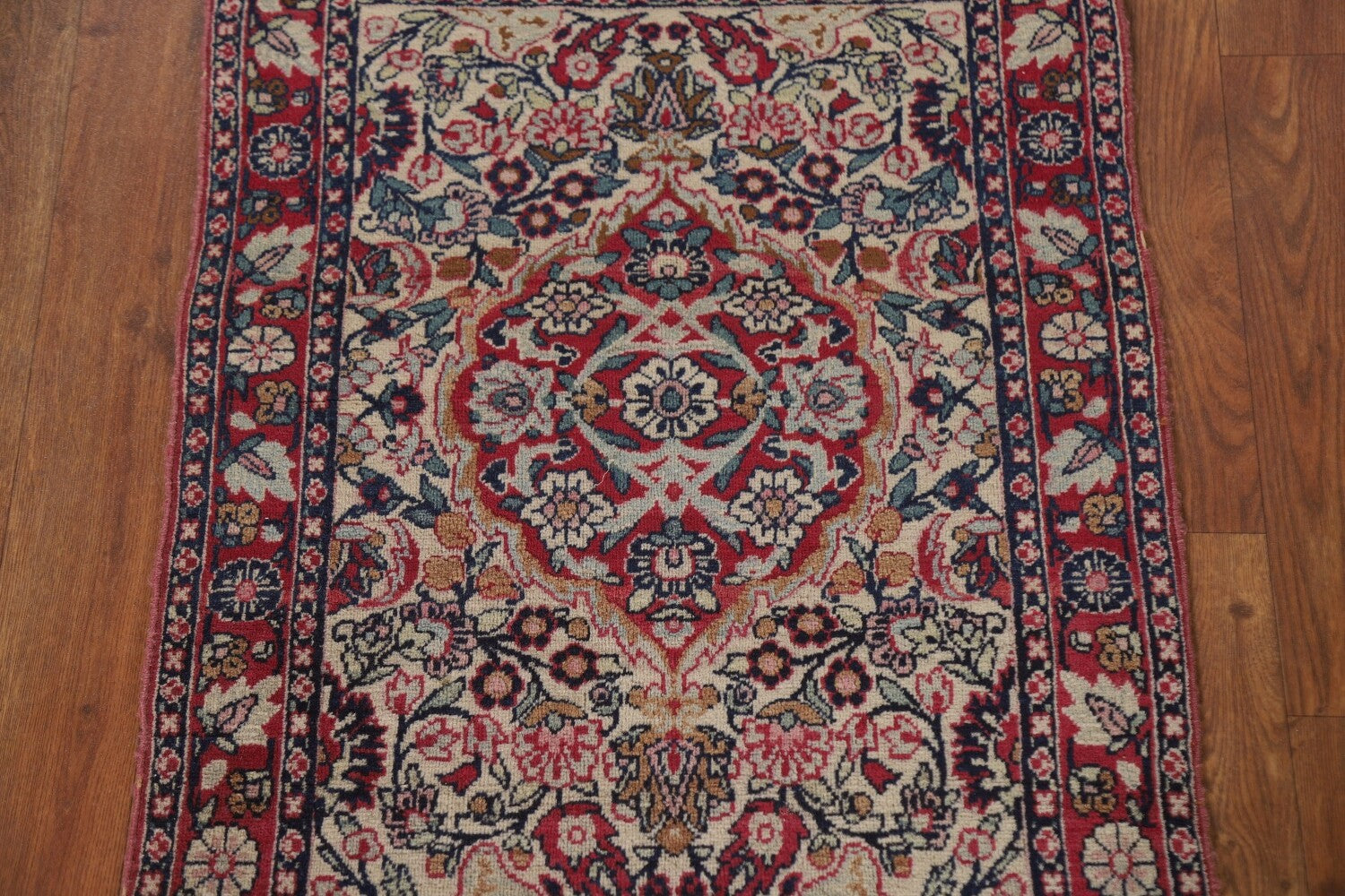 A Beautiful Genuine Persia ( Persia ) Kerman (Lavar) rug is Hand Knotted by skillful weavers in Persia ( Persia ) with 100% Wool Material. This rug is in Very Good condition. dimensions are 2' 6'' X 1' 10'' in foot and 76 X 56 in centimeter. the primary color is Beige & Ivories.