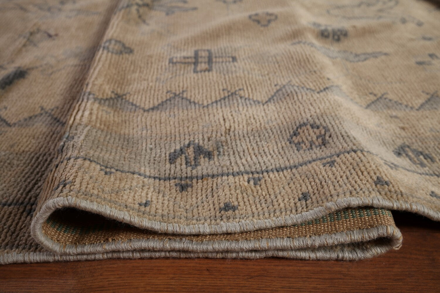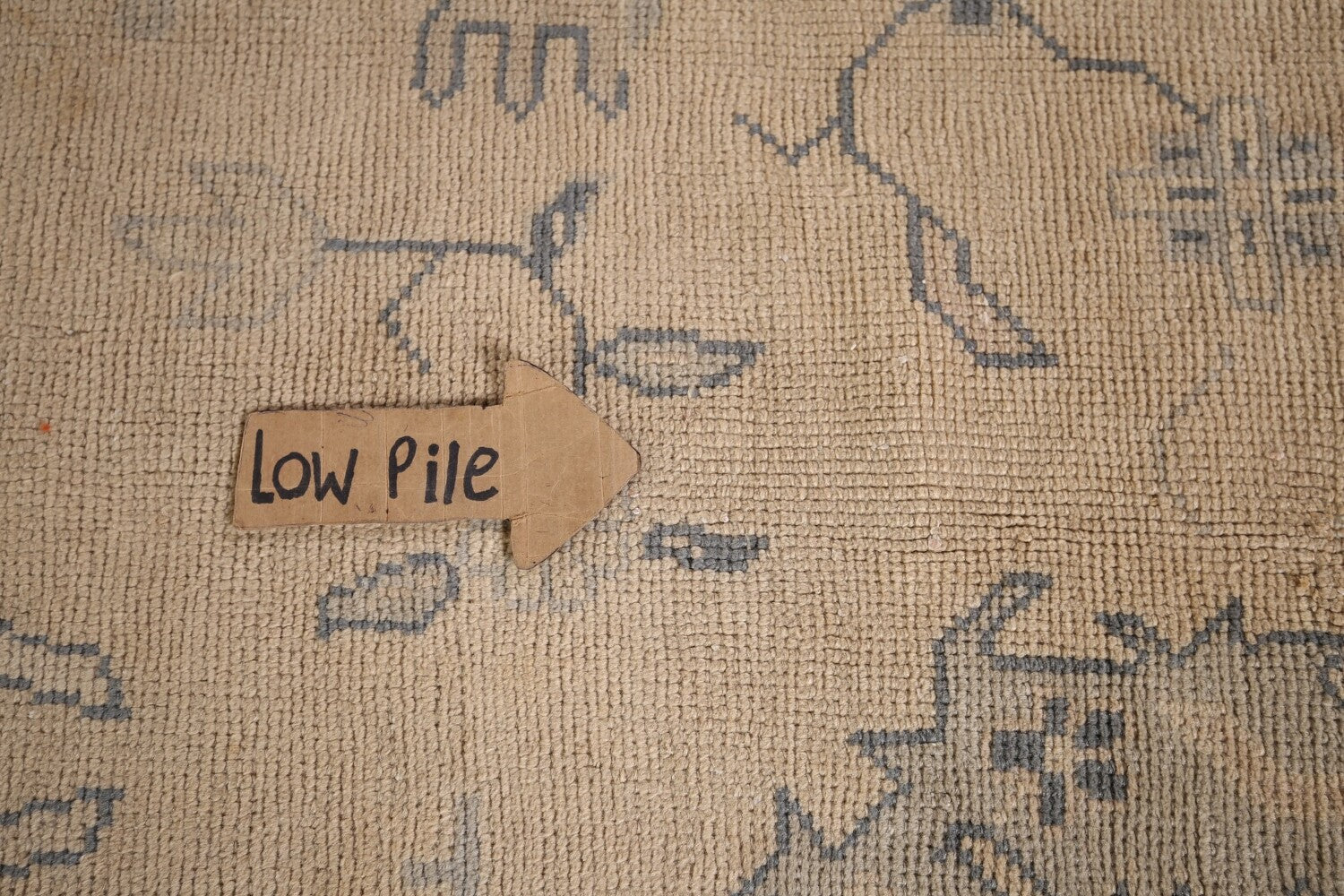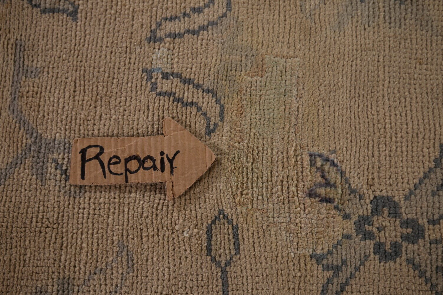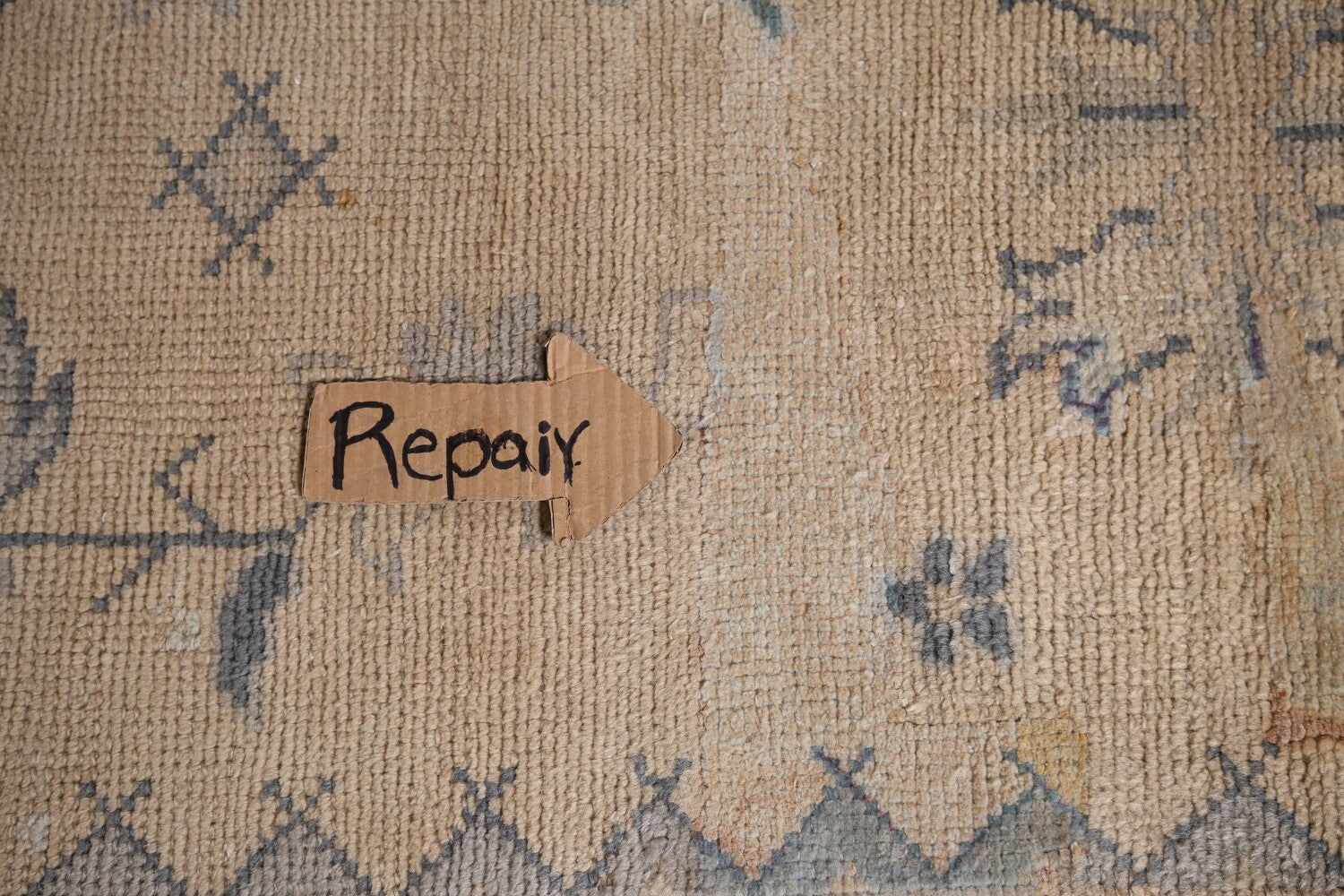 A Beautiful Genuine Turkey Oushak rug is Hand Knotted by skillful weavers in Turkey with 100% Wool Material. This rug is in Very Good ( Low Pile- Repair) condition. dimensions are 19' 1'' X 12' 5'' in foot and 582 X 378 in centimeter. the primary color is Beige & Ivories.