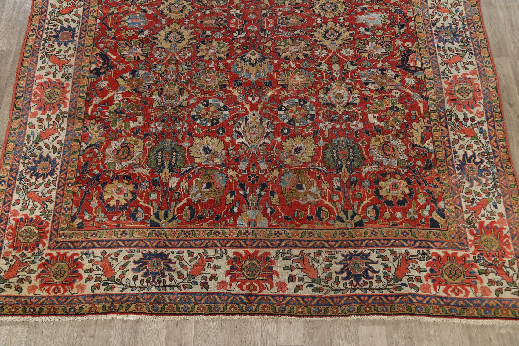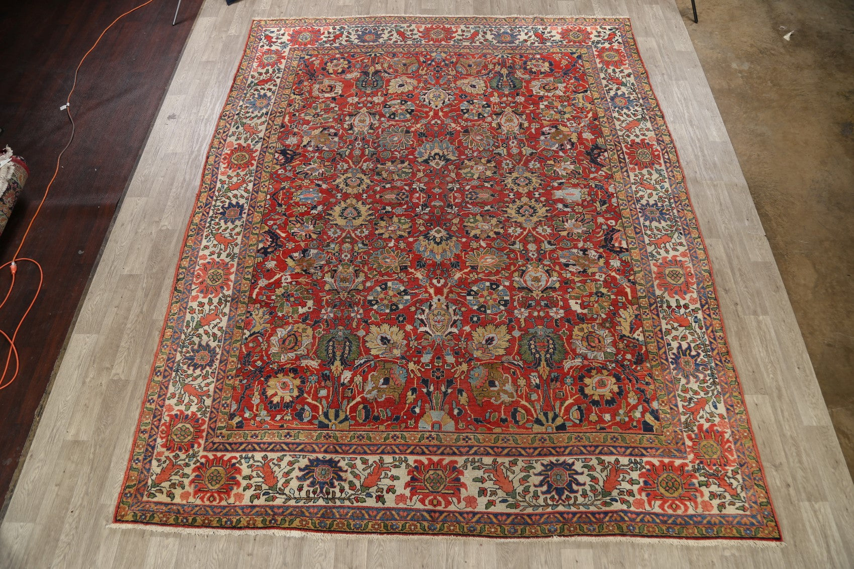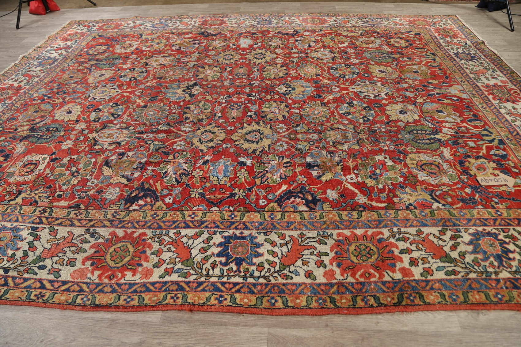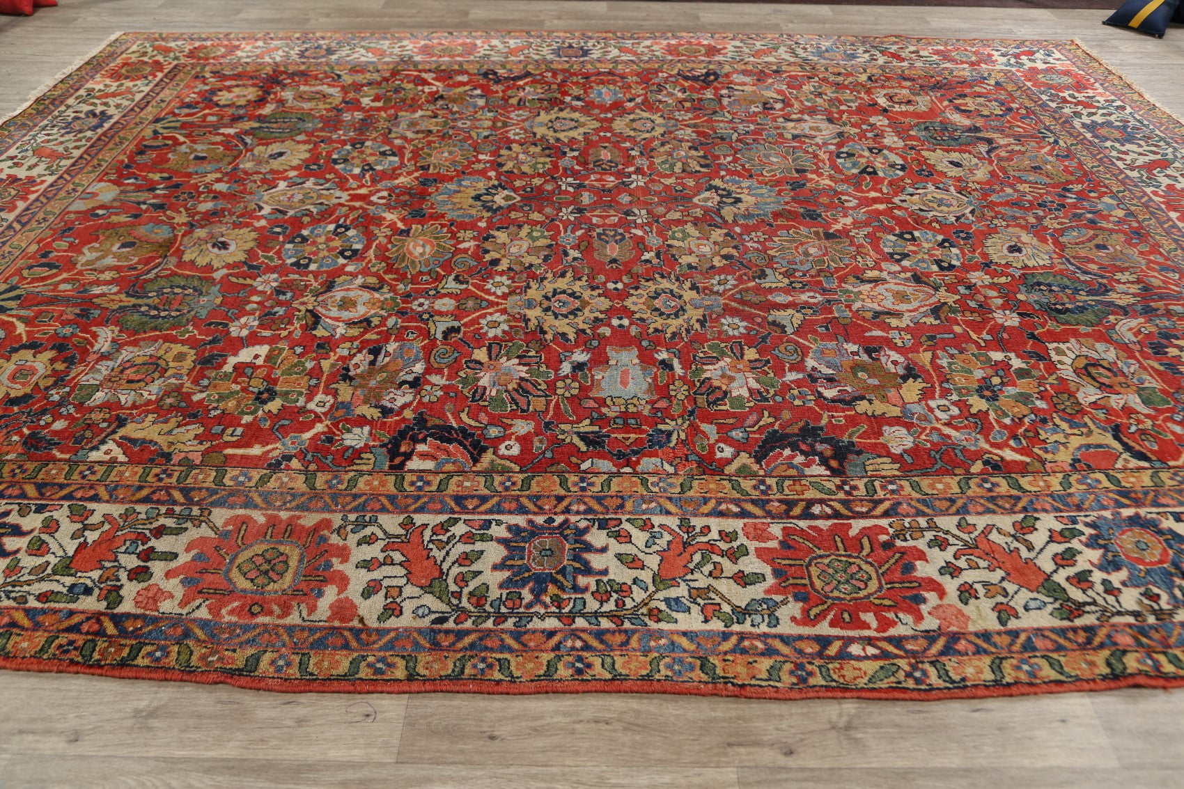 A Beautiful Genuine Persia ( Persia ) Sultanabad rug is Hand Knotted by skillful weavers in Persia ( Persia ) with 100% Wool Material. This rug is in Very Good (Evenly Low Pile) condition. dimensions are 12' 11'' X 10' 3'' in foot and 394 X 312 in centimeter. the primary color is Red.