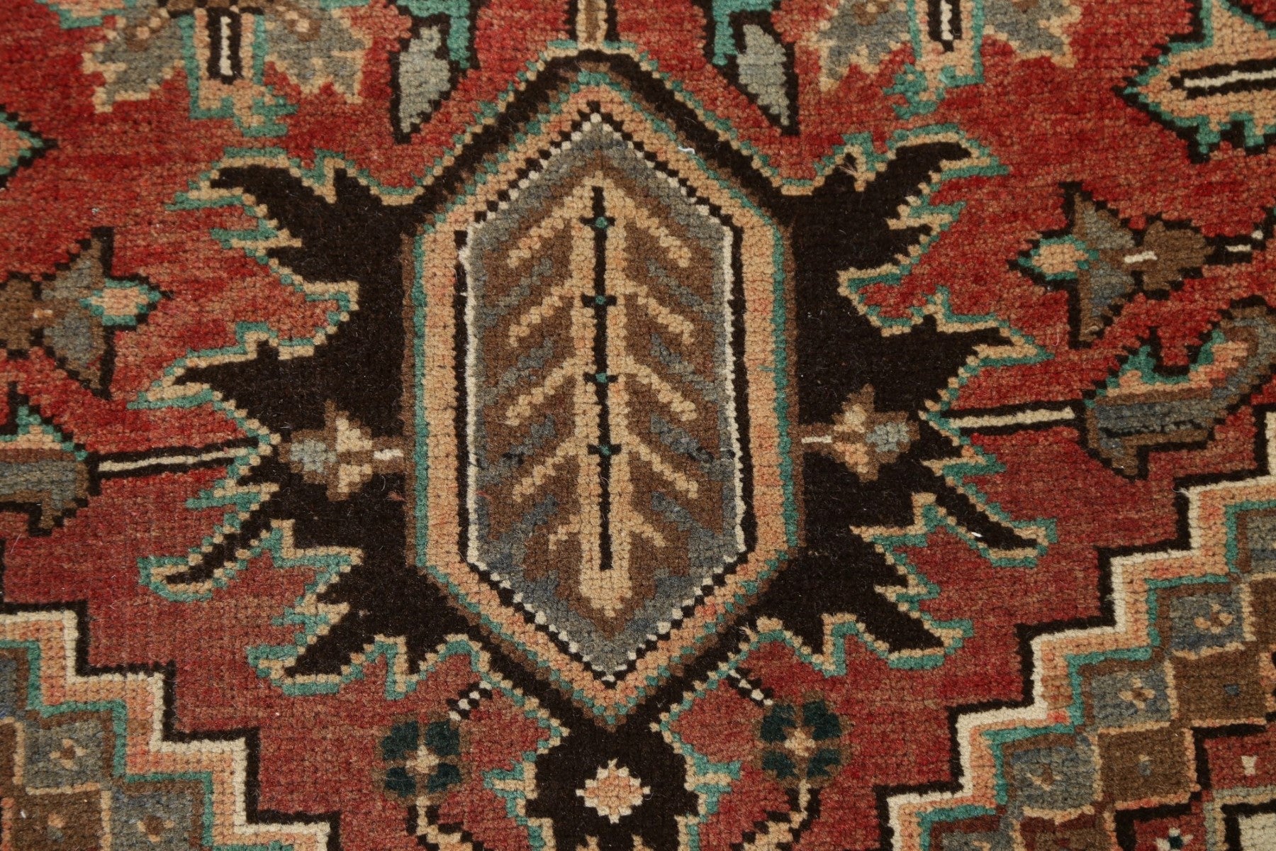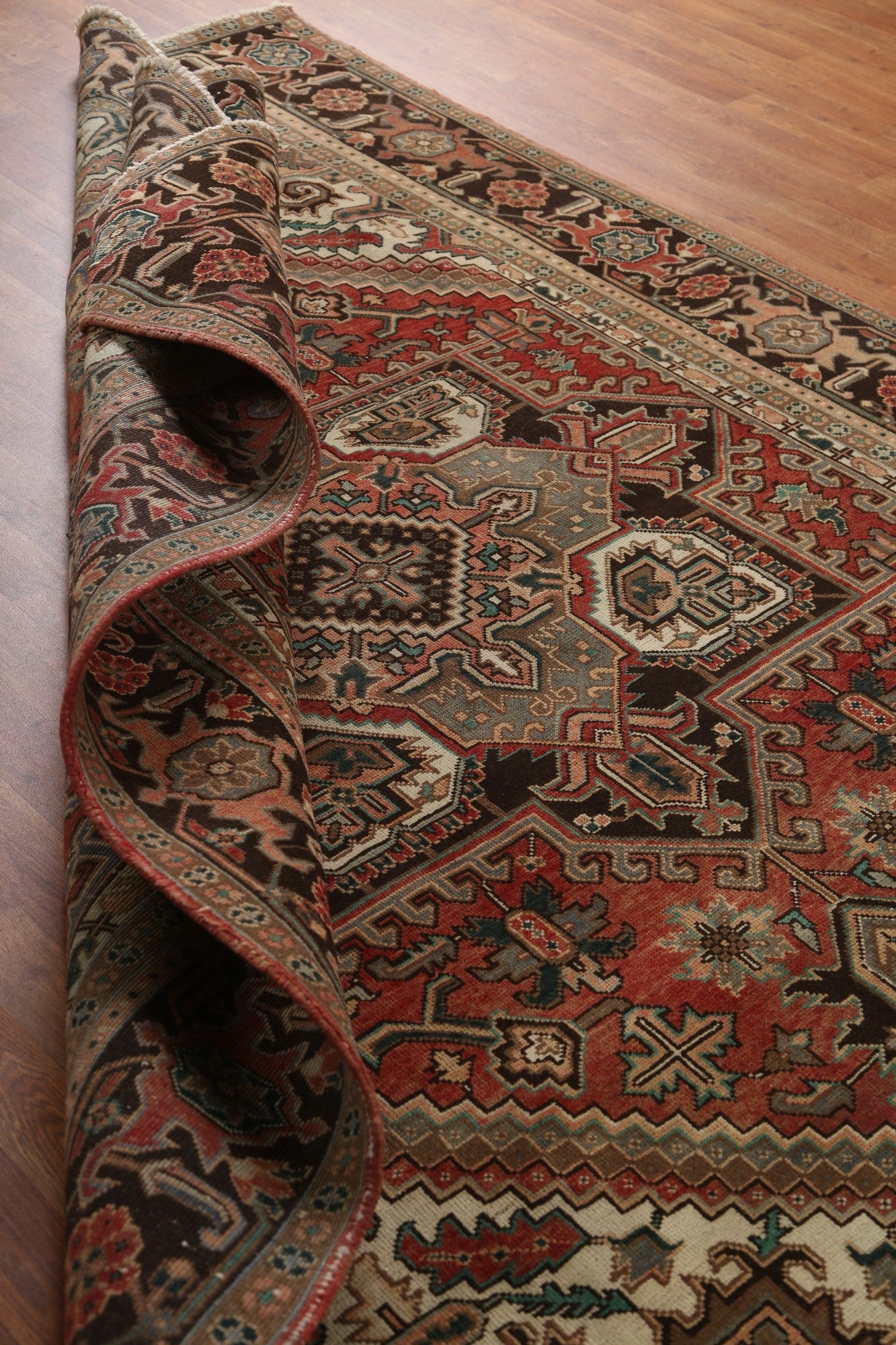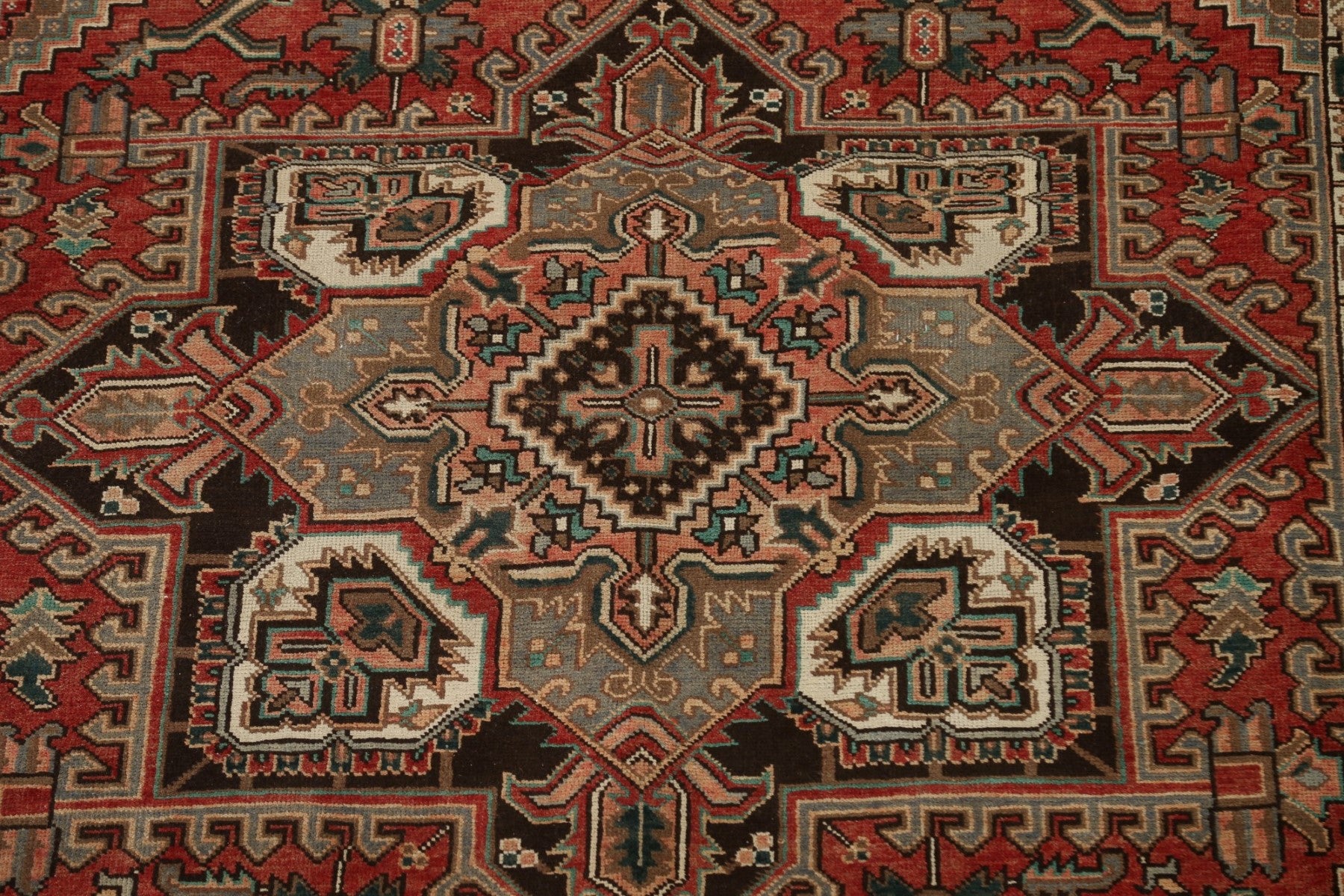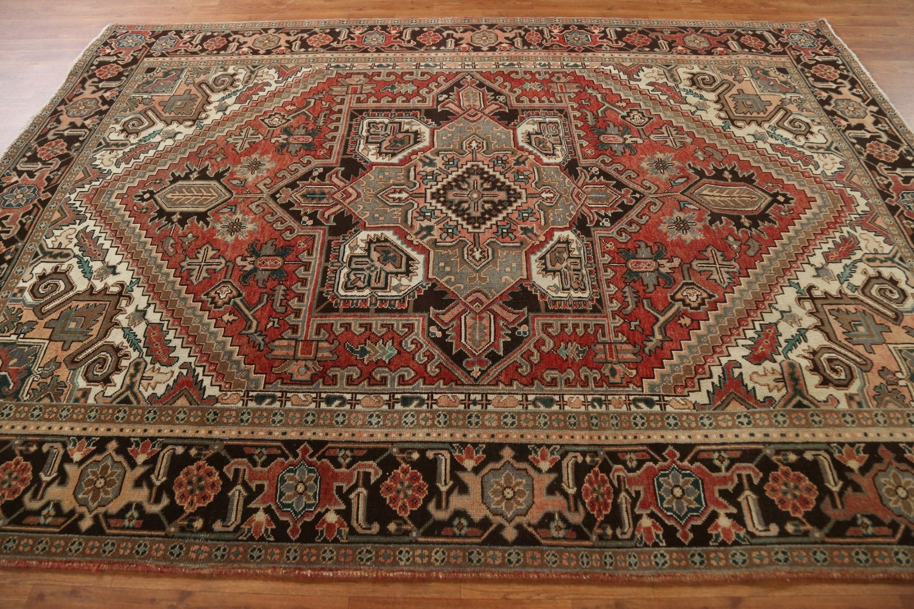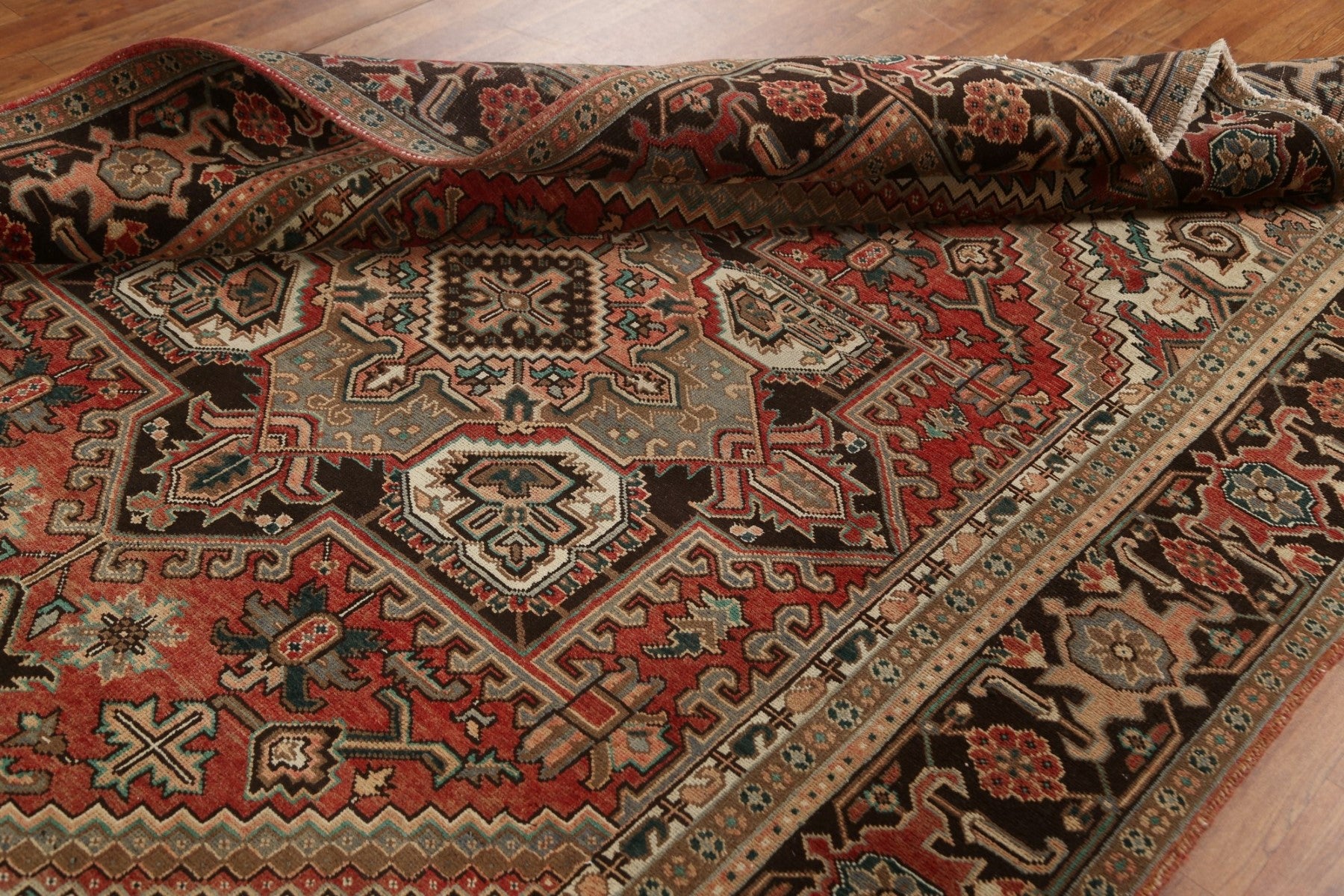 A Beautiful Genuine Persia ( Persia ) Heriz rug is Hand Knotted by skillful weavers in Persia ( Persia ) with 100% Wool Material. This rug is in Very Good ( Low Pile ) condition. dimensions are 9' 6'' X 6' 9'' in foot and 290 X 206 in centimeter. the primary color is Red.