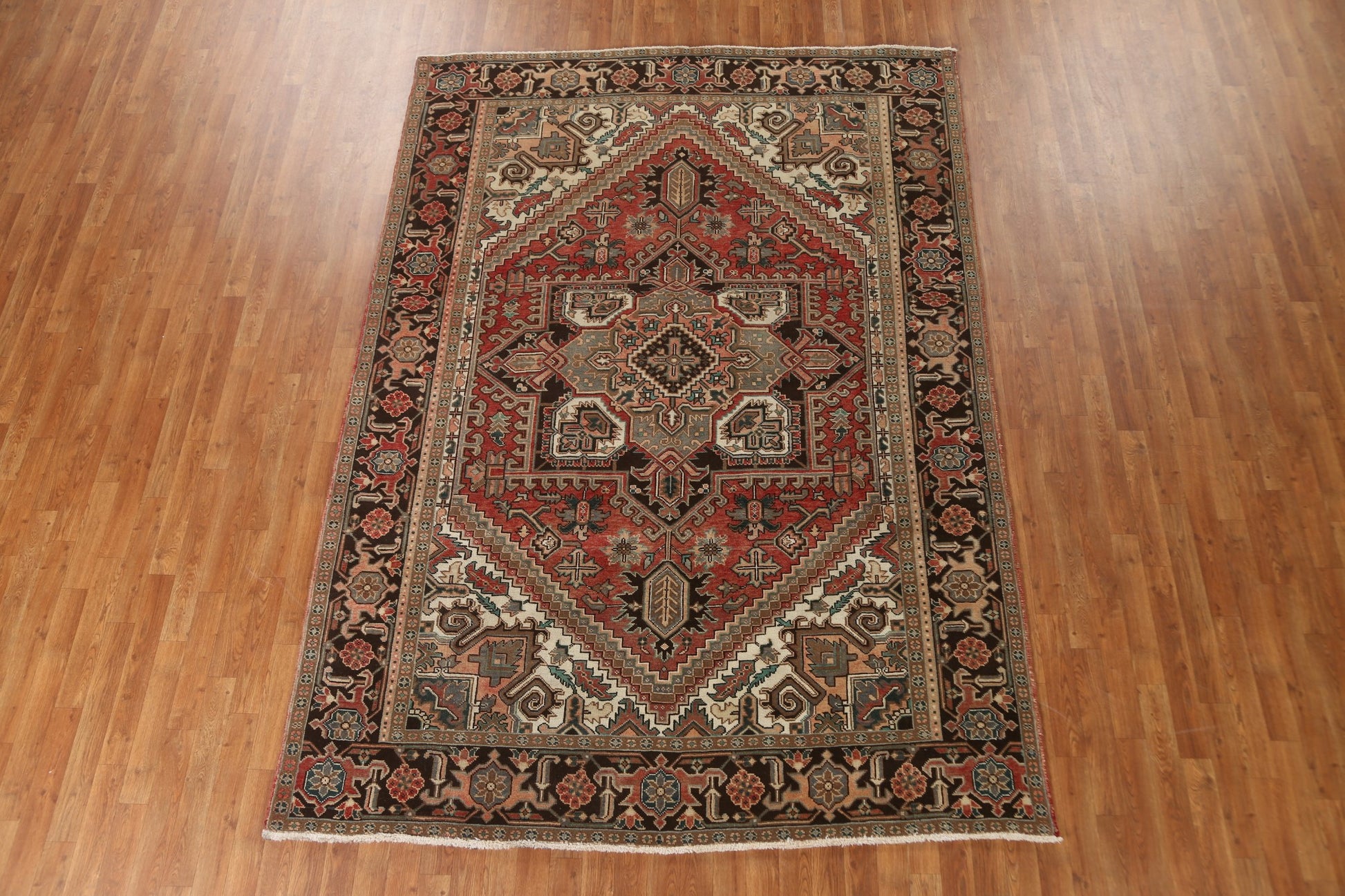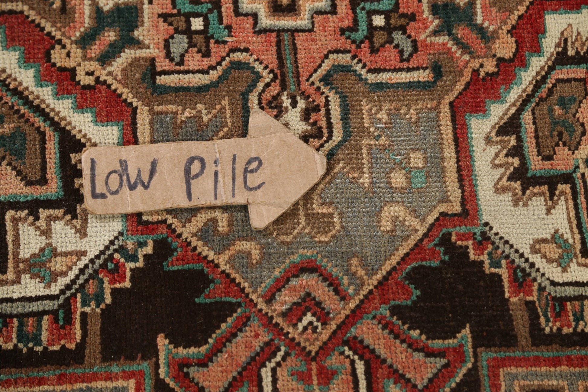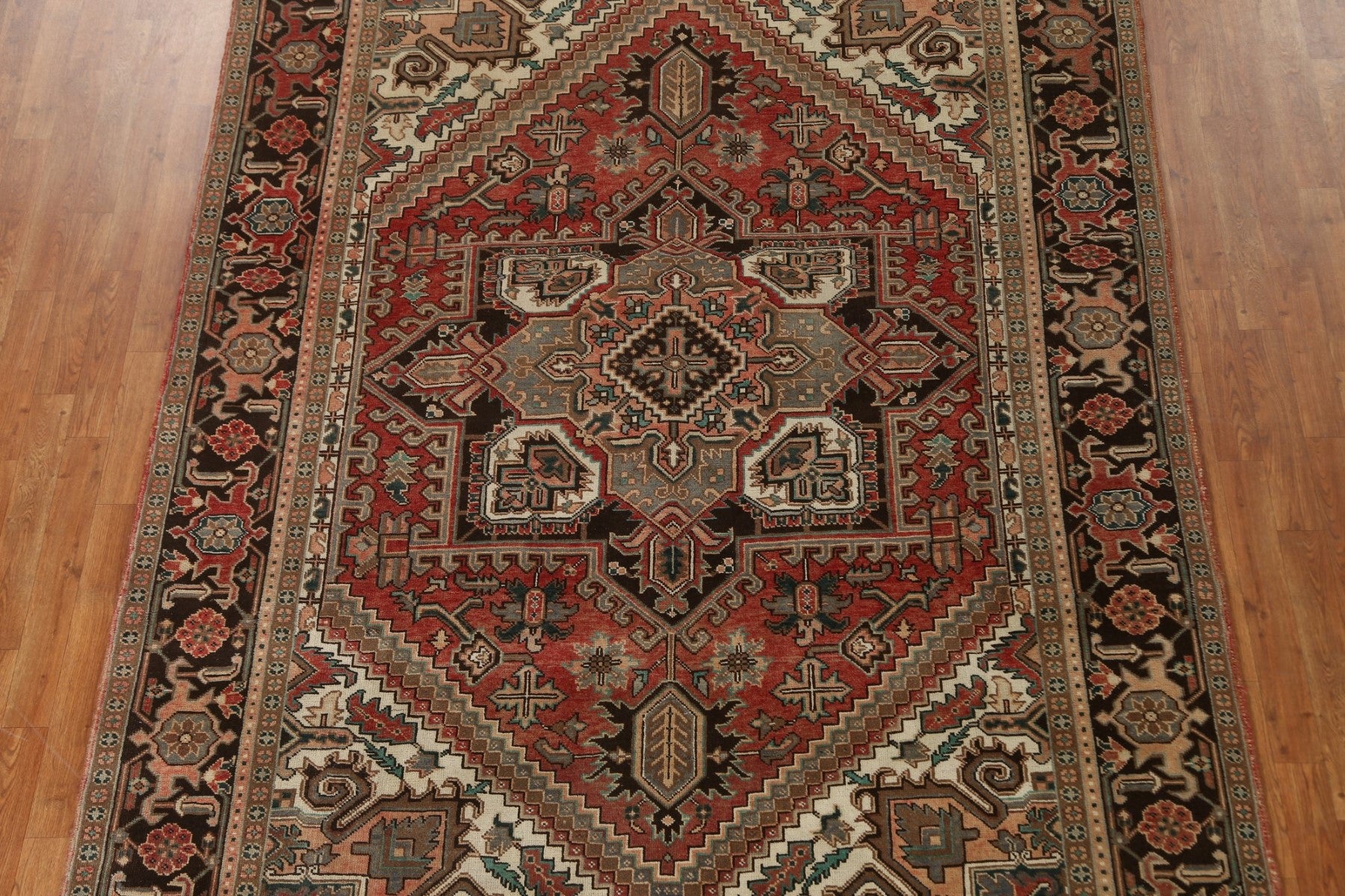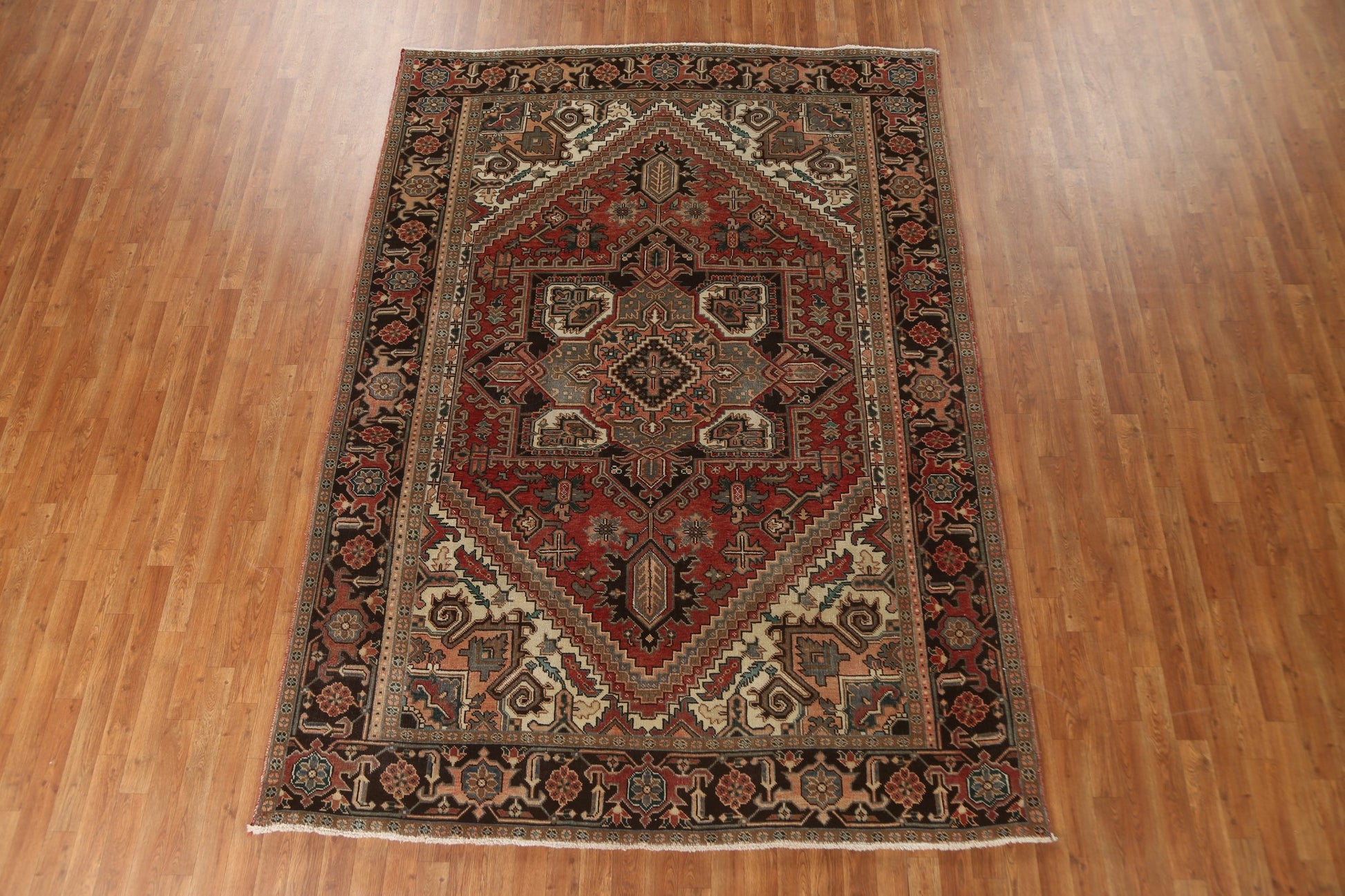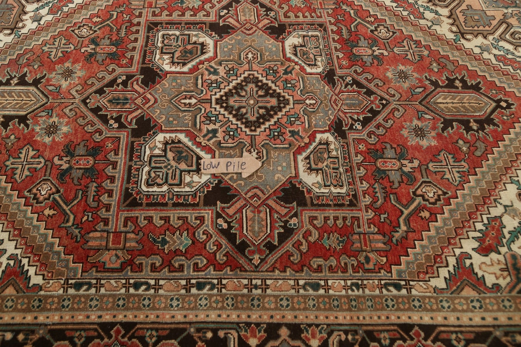 A Beautiful Genuine Persia ( Persia ) Heriz rug is Hand Knotted by skillful weavers in Persia ( Persia ) with 100% Wool Material. This rug is in Very Good ( Low Pile ) condition. dimensions are 9' 6'' X 6' 9'' in foot and 290 X 206 in centimeter. the primary color is Red.