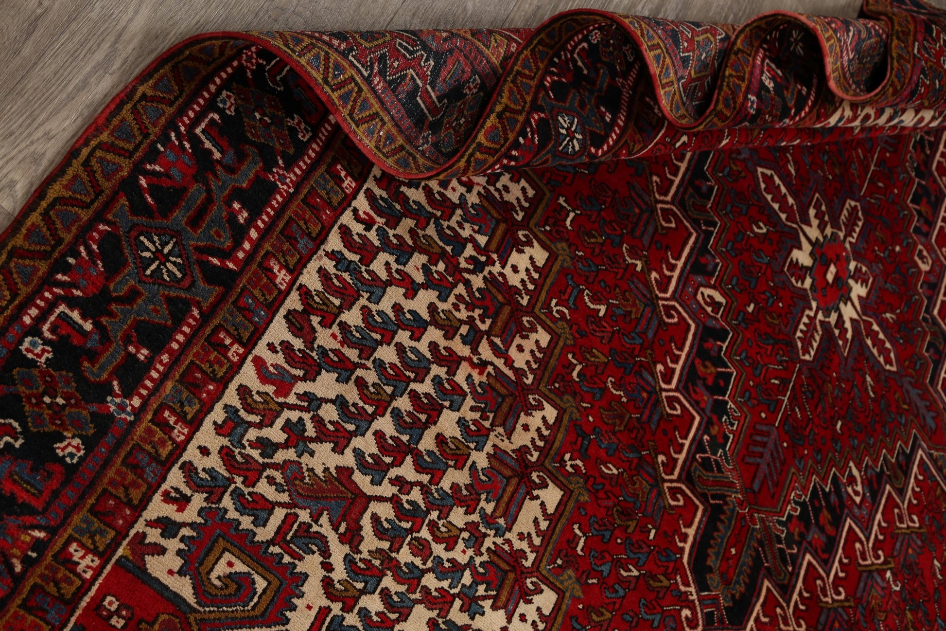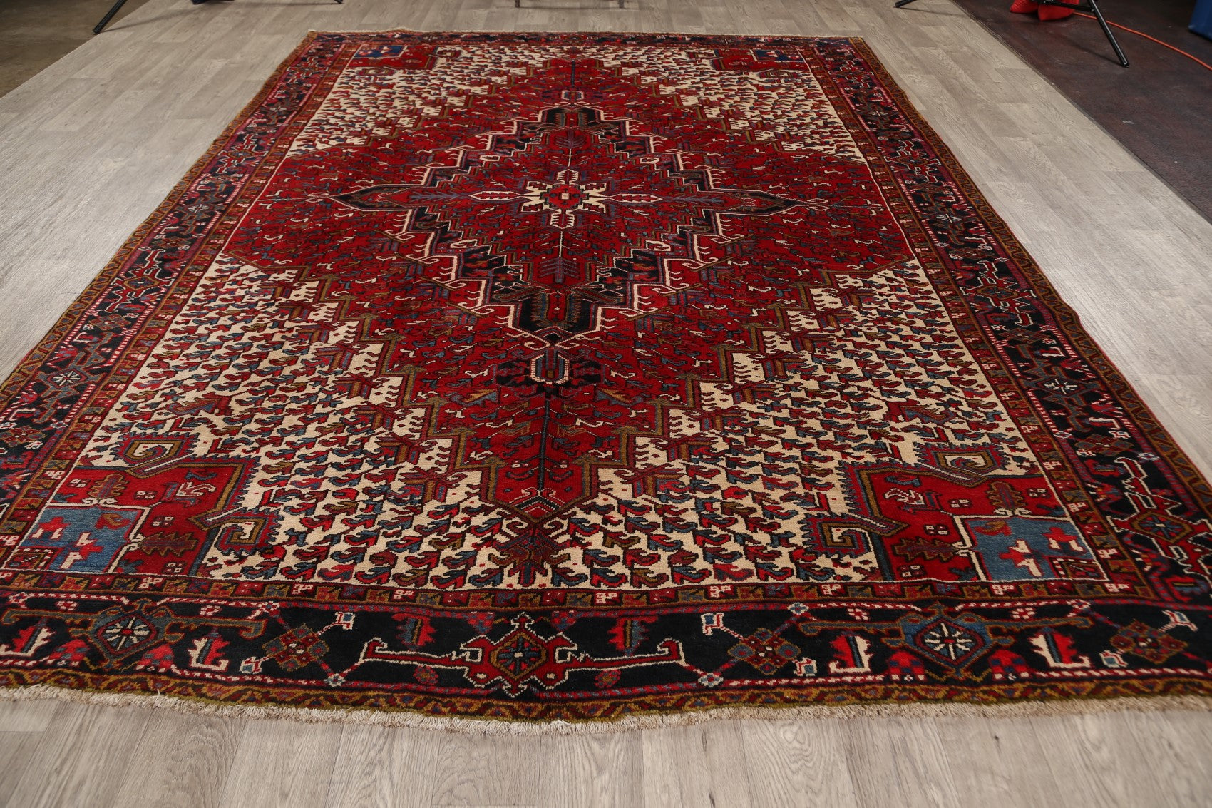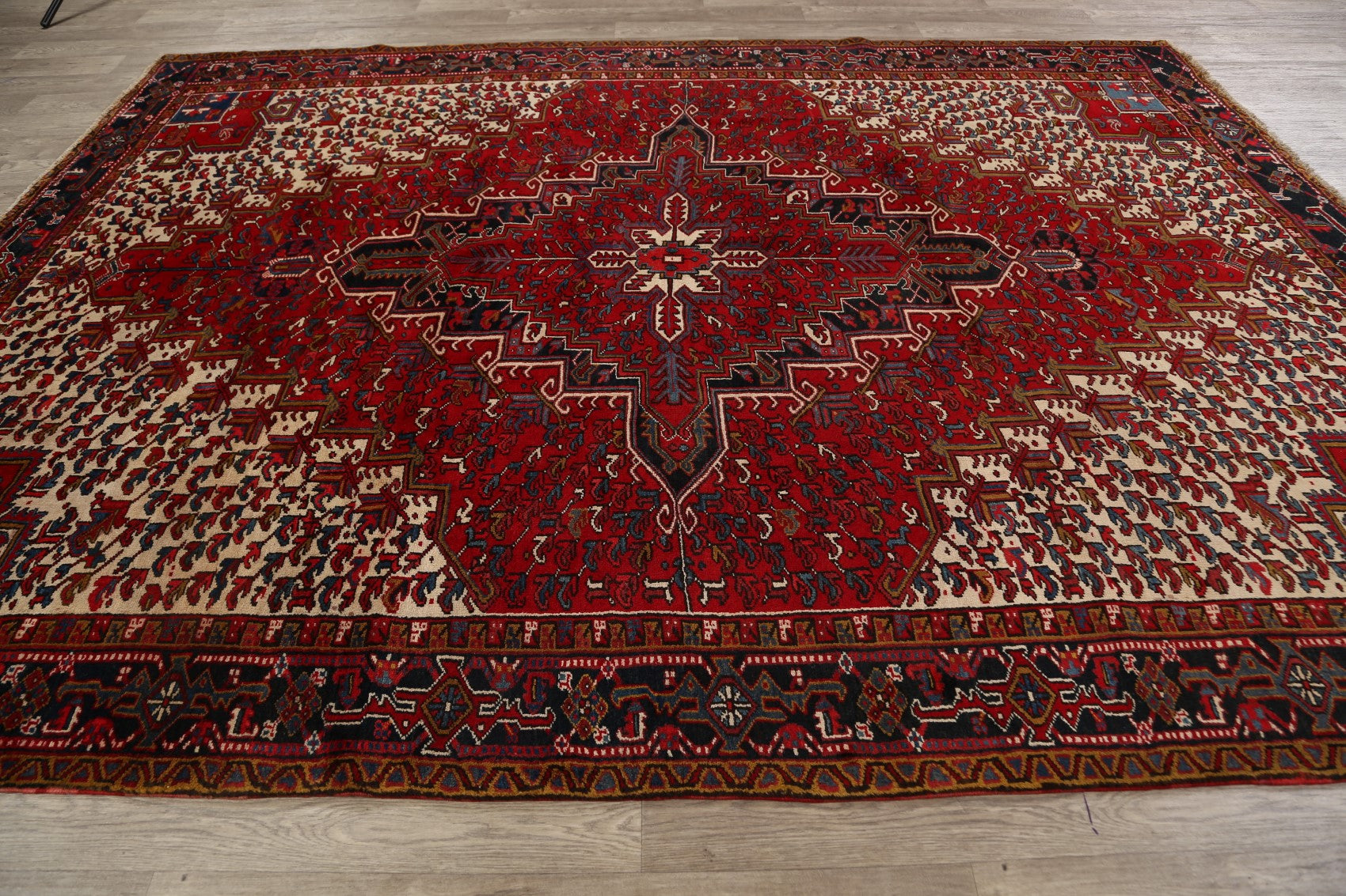 A Beautiful Genuine Persia ( Persia ) Heriz rug is Hand Knotted by skillful weavers in Persia ( Persia ) with 100% Wool Material. This rug is in Very Good condition. dimensions are 10' 10'' X 8' 0'' in foot and 330 X 244 in centimeter. the primary color is Red.