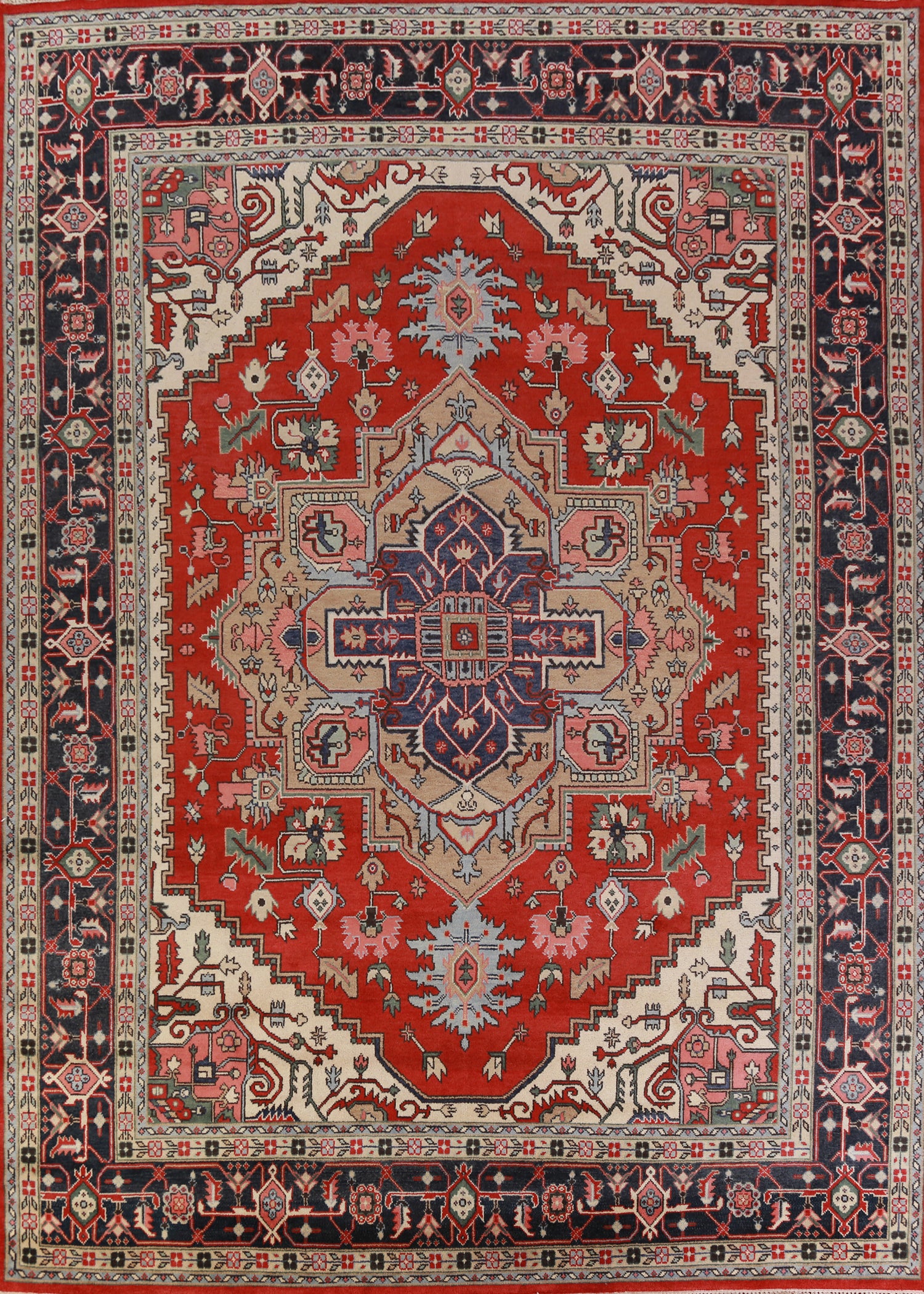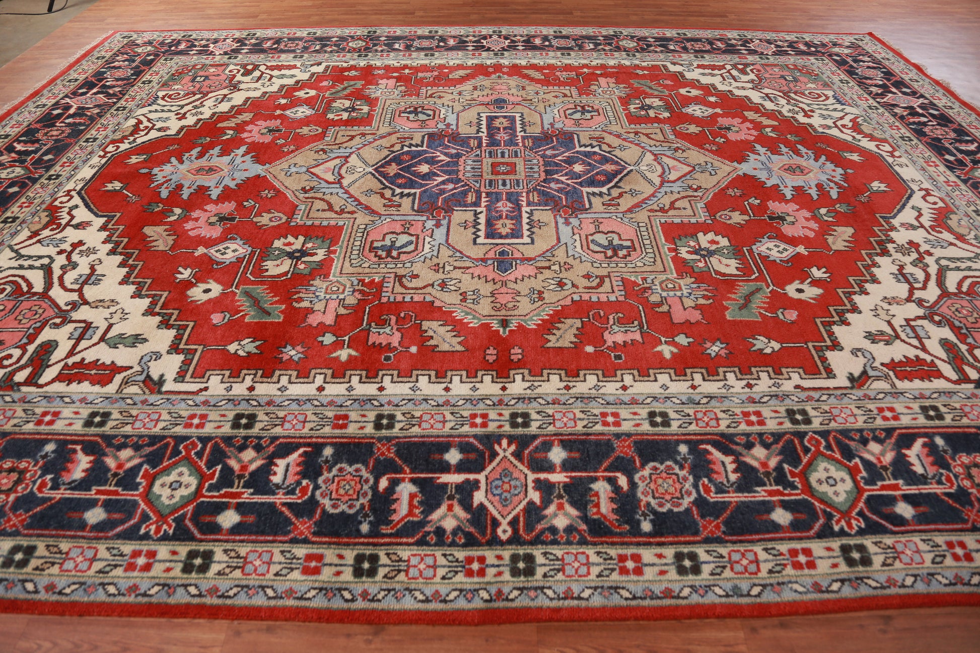 A Beautiful Genuine India Heriz (serapi) rug is Hand Knotted by skillful weavers in India with 100% Wool Material. This rug is in New, First Quality condition. dimensions are 15' 2'' X 11' 8'' in foot and 462 X 356 in centimeter. the primary color is Red.