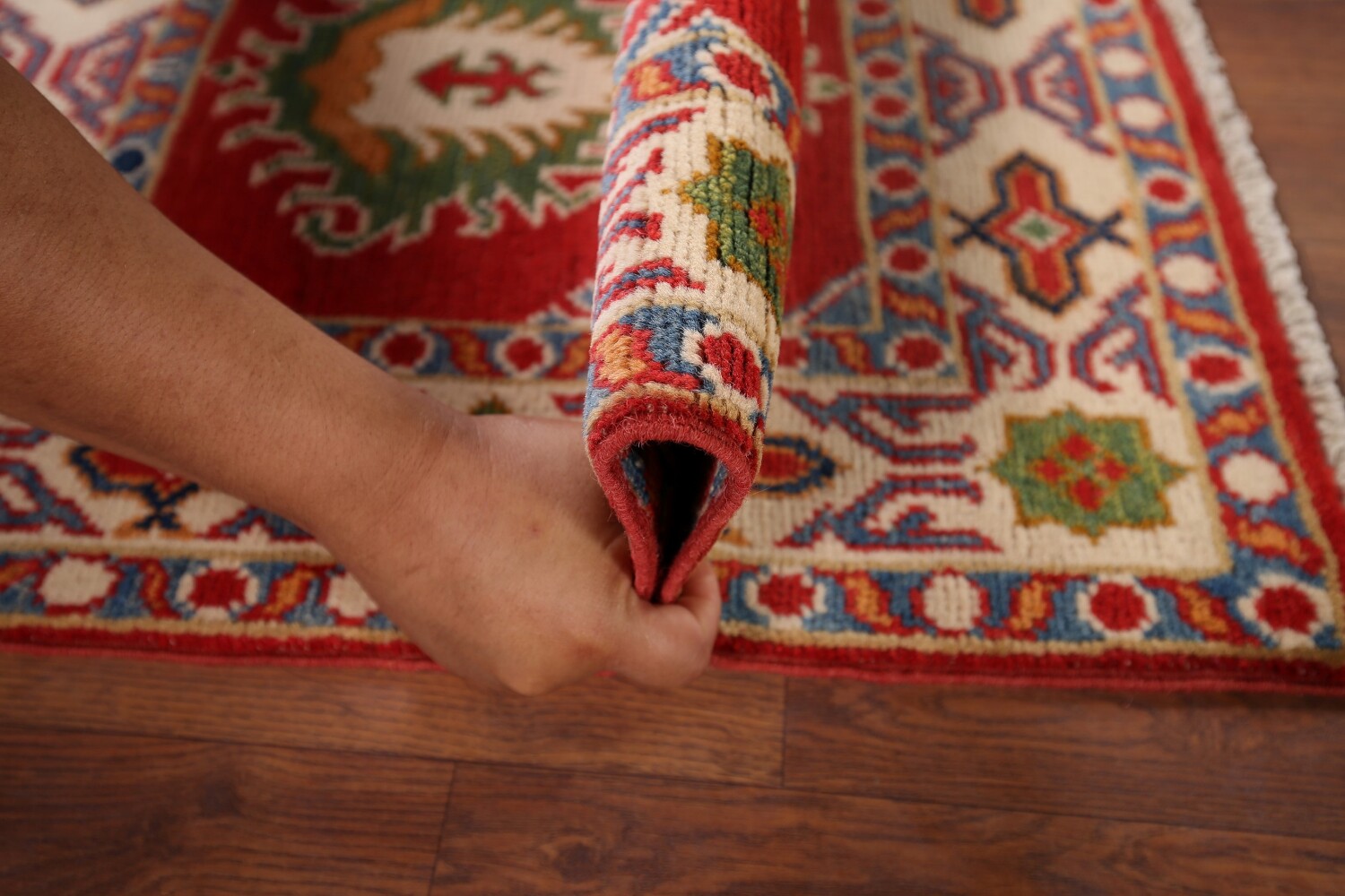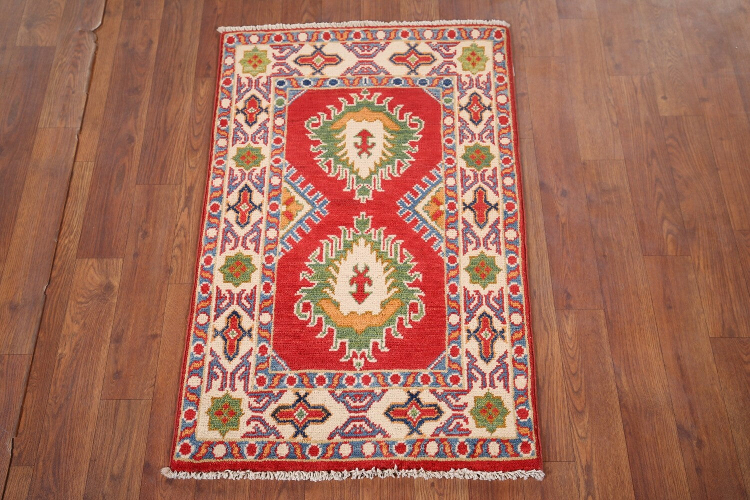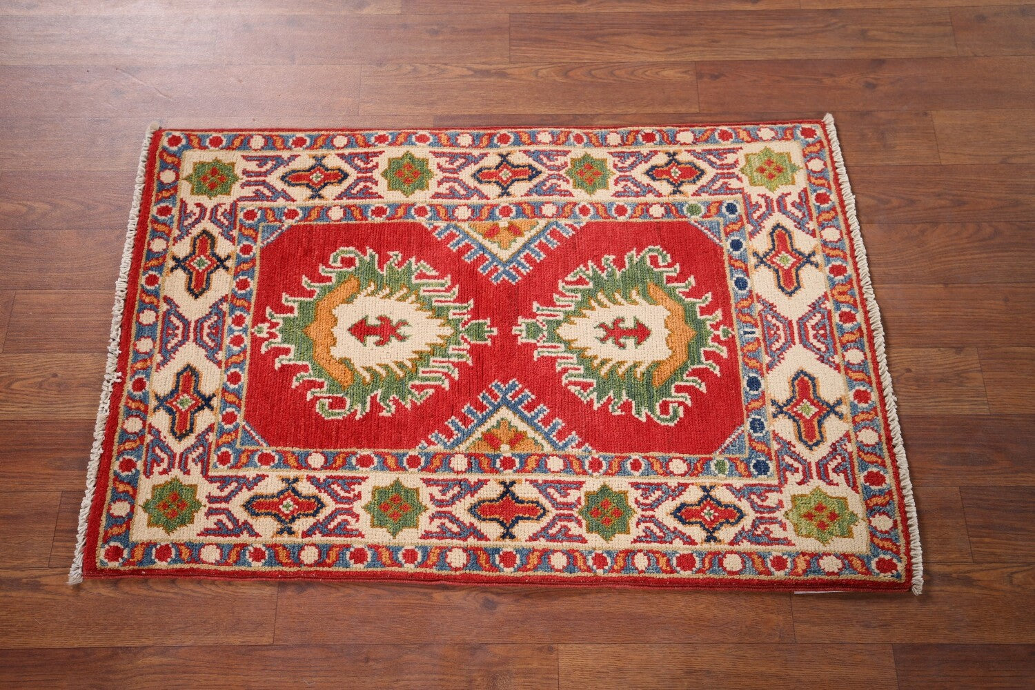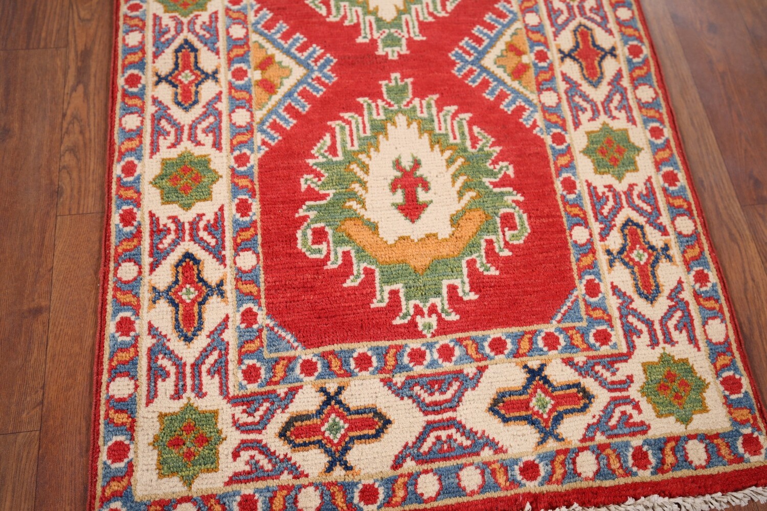 A Beautiful Genuine Pakistan Kazak rug is Hand Knotted by skillful weavers in Pakistan with 100% Wool Material. This rug is in New, First Quality condition. dimensions are 2' 11'' X 1' 11'' in foot and 89 X 58 in centimeter. the primary color is Red.