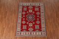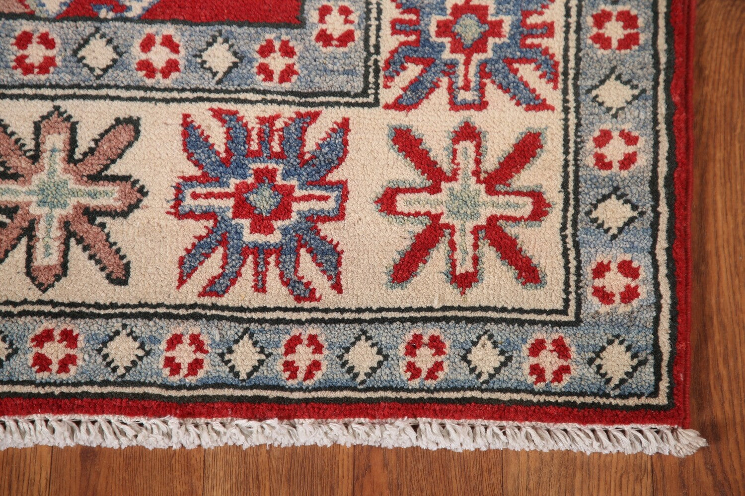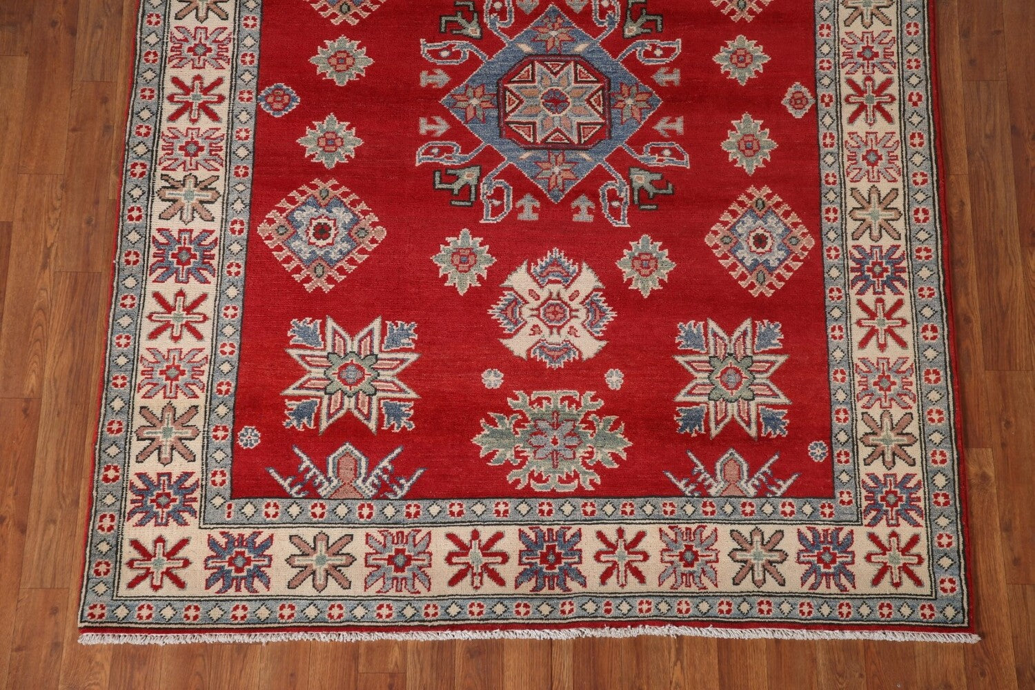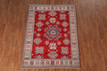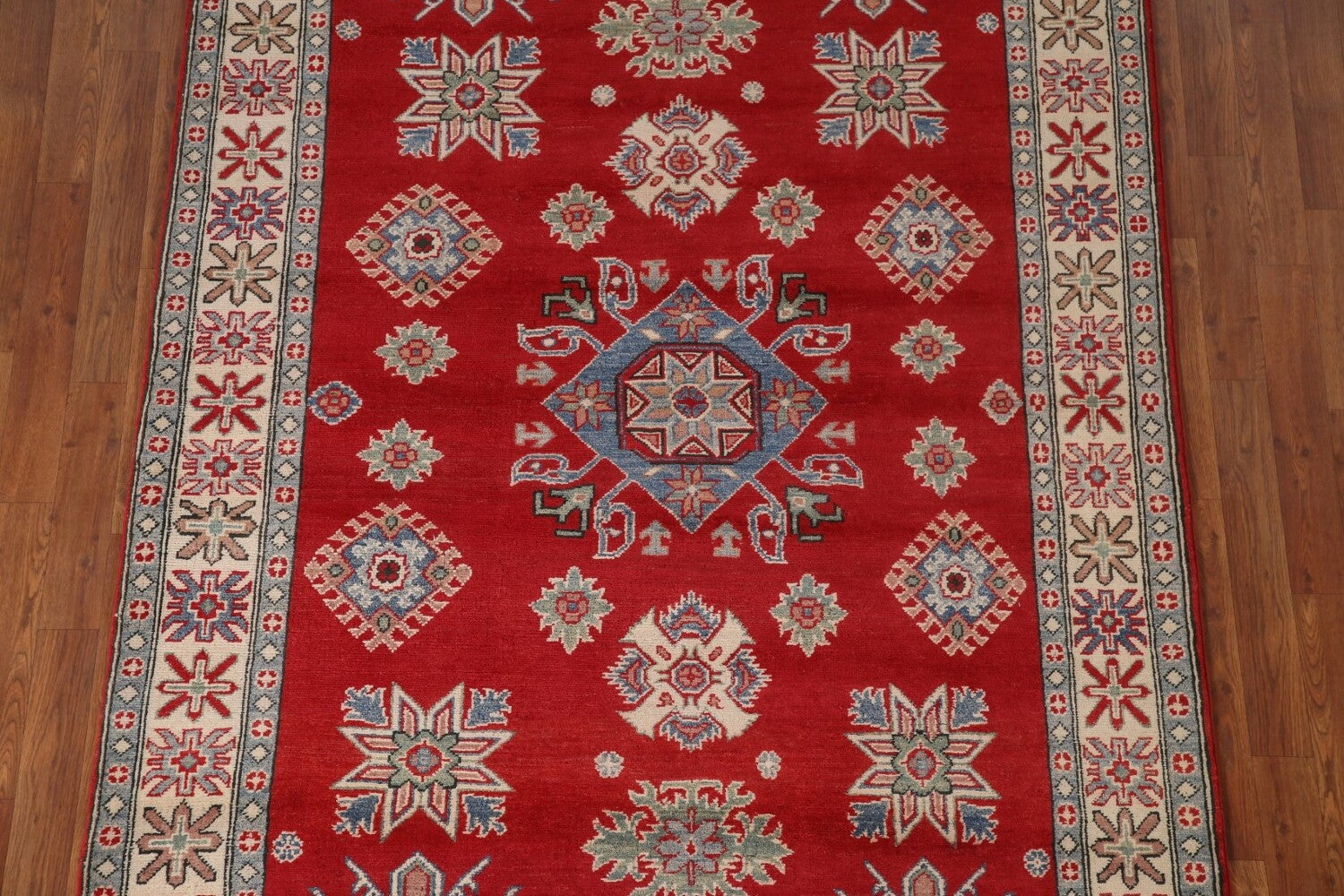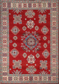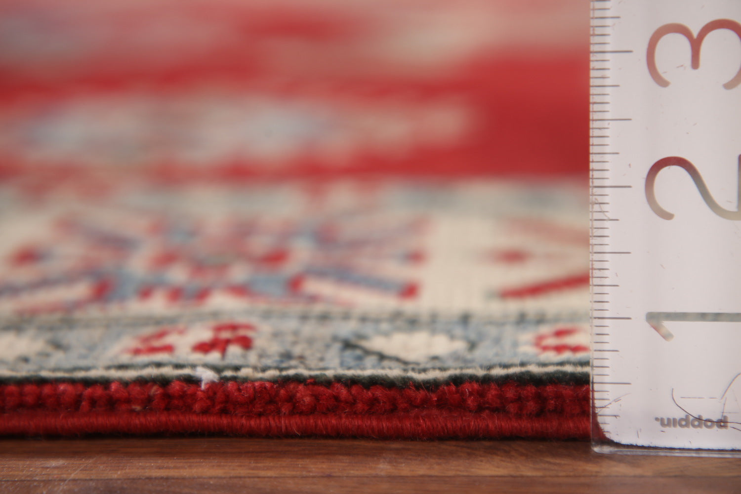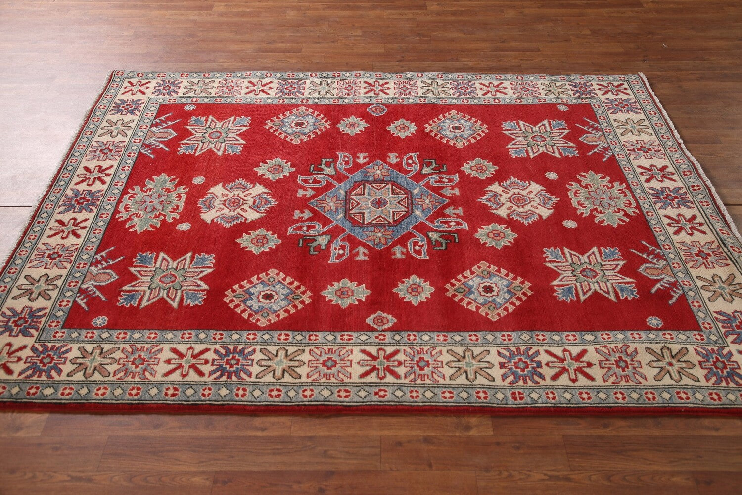 A Beautiful Genuine Pakistan Kazak rug is Hand Knotted by skillful weavers in Pakistan with 100% Wool Material. This rug is in New, First Quality condition. dimensions are 6' 9'' X 5' 0'' in foot and 206 X 152 in centimeter. the primary color is Red.
