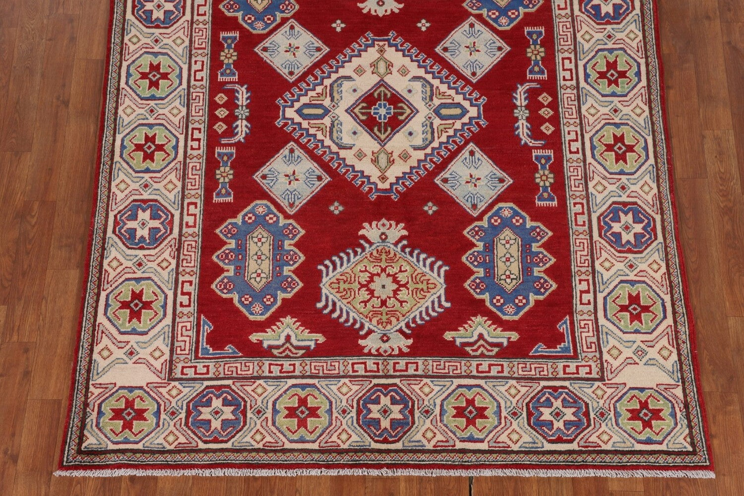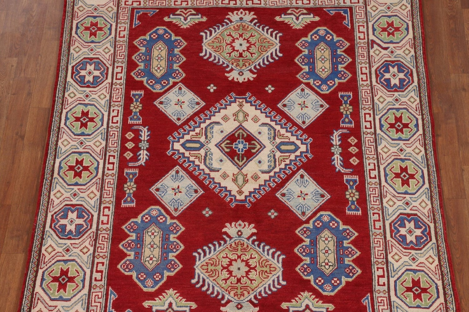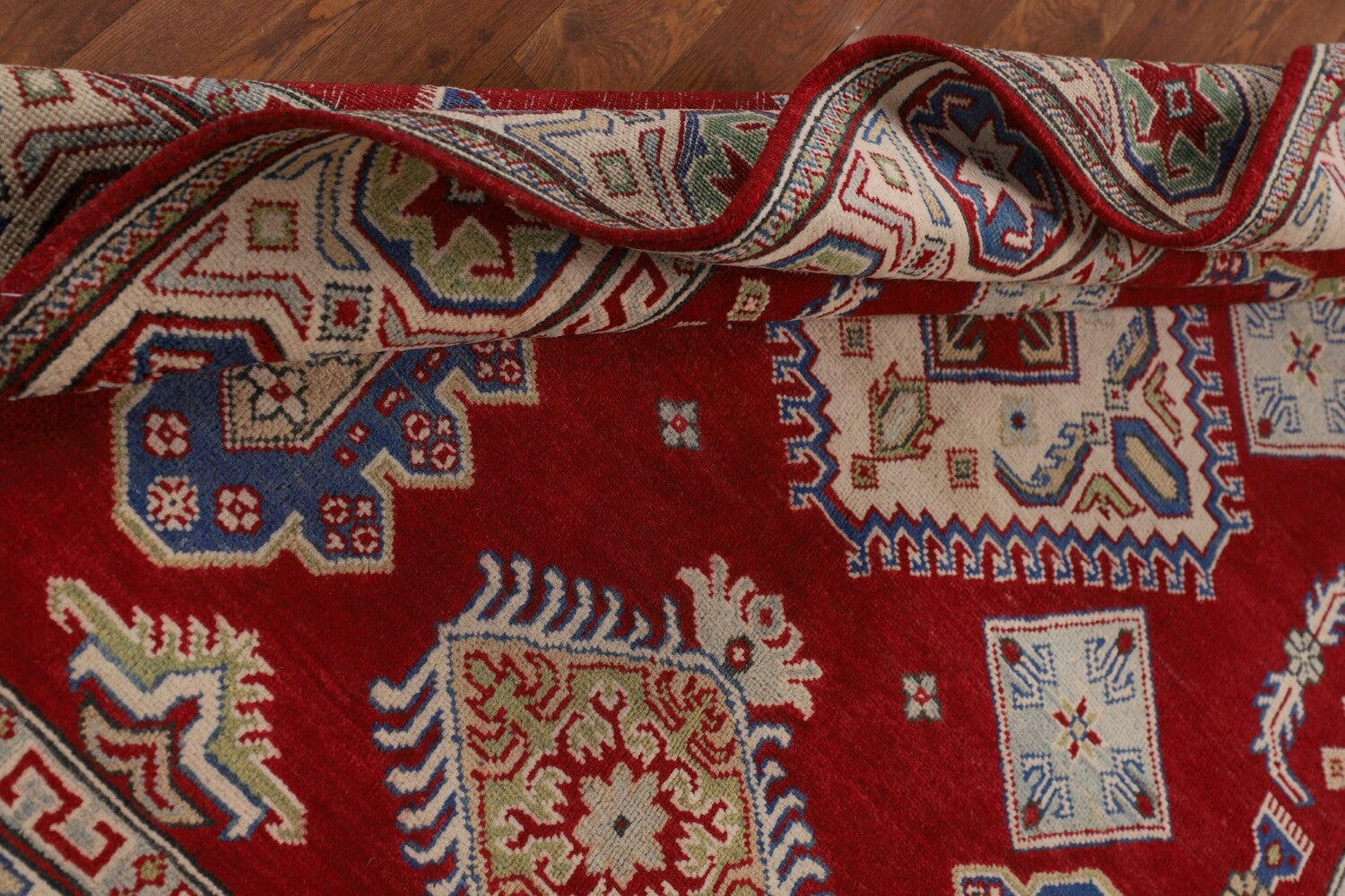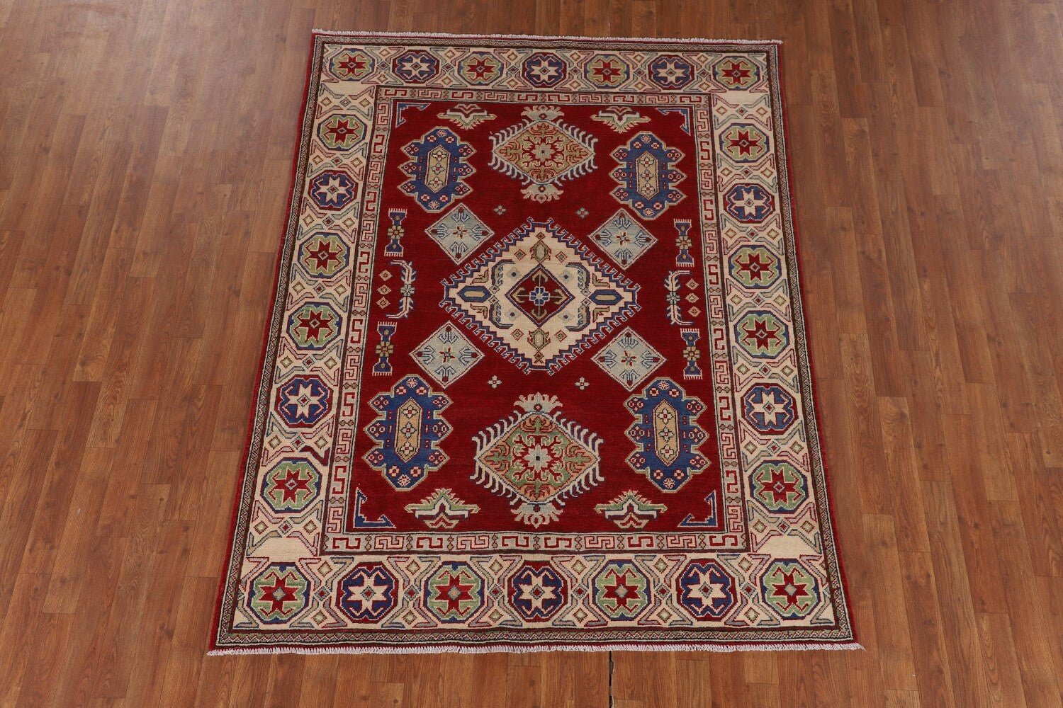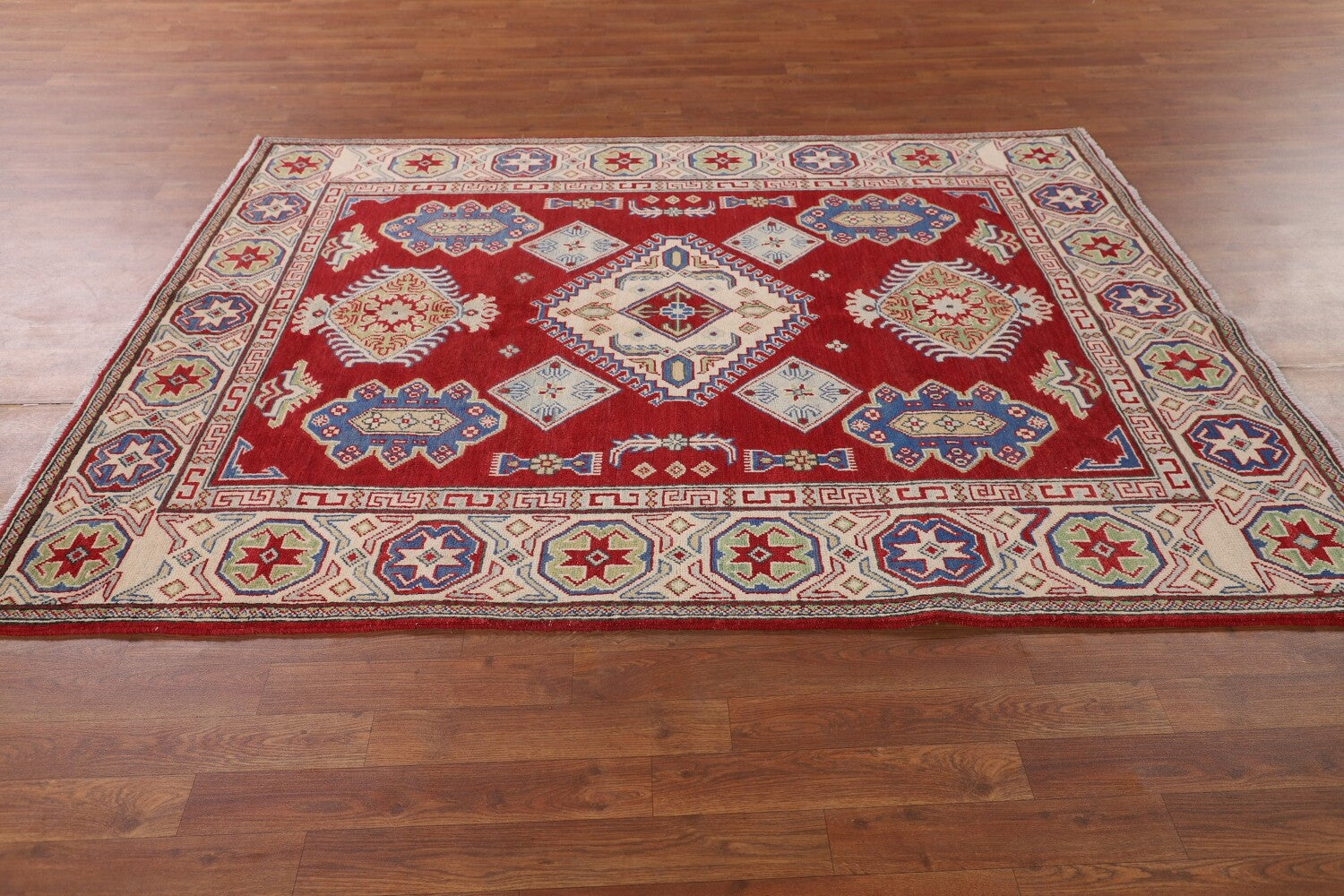 A Beautiful Genuine Pakistan Kazak rug is Hand Knotted by skillful weavers in Pakistan with 100% Wool Material. This rug is in New, First Quality condition. dimensions are 6' 9'' X 5' 2'' in foot and 206 X 157 in centimeter. the primary color is Red.