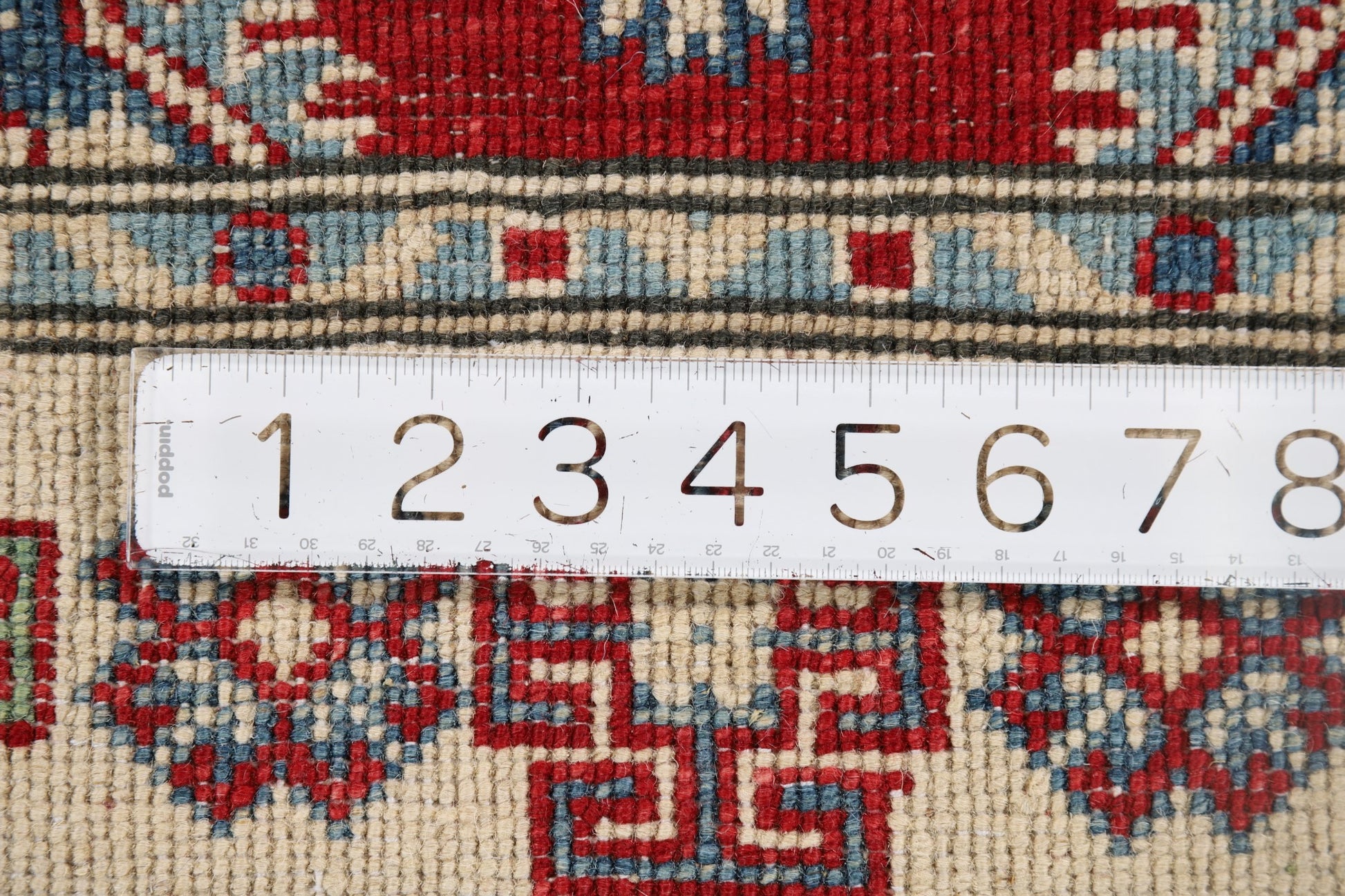 A Beautiful Genuine Pakistan Kazak rug is Hand Knotted by skillful weavers in Pakistan with 100% Wool Material. This rug is in New, First Quality condition. dimensions are 9' 8'' X 2' 9'' in foot and 295 X 84 in centimeter. the primary color is Red.