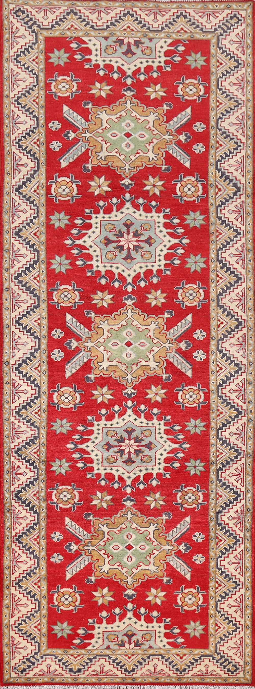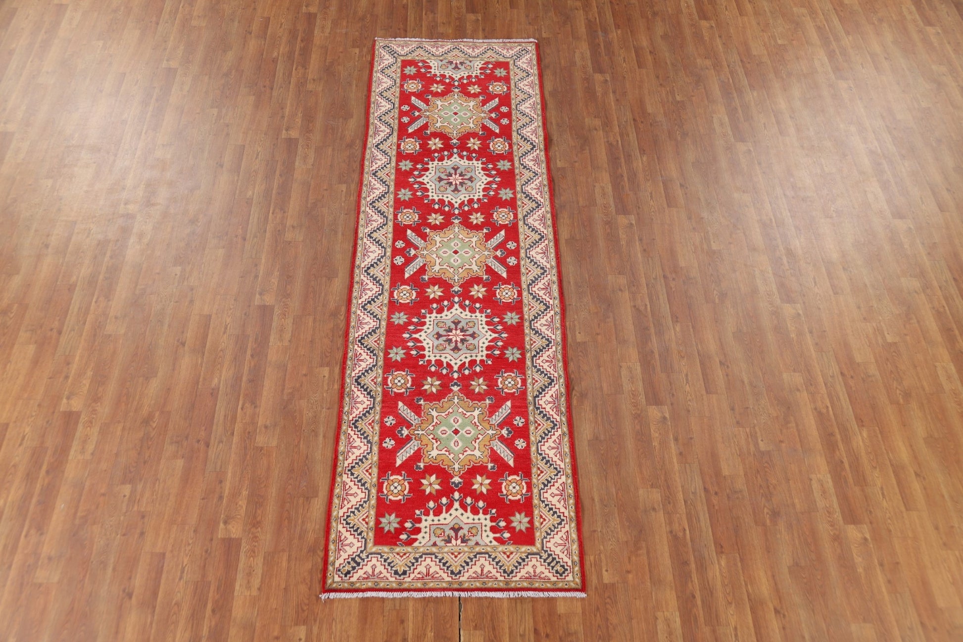 Red Geometric Kazak Oriental Runner Rug 3x10