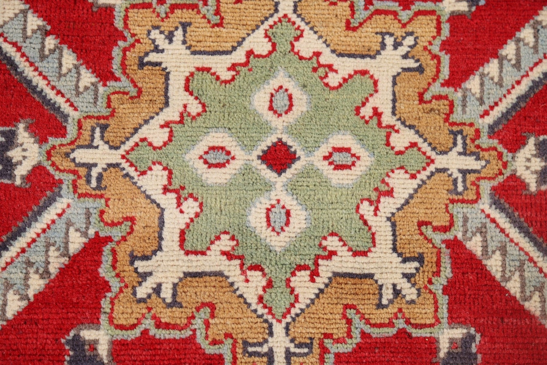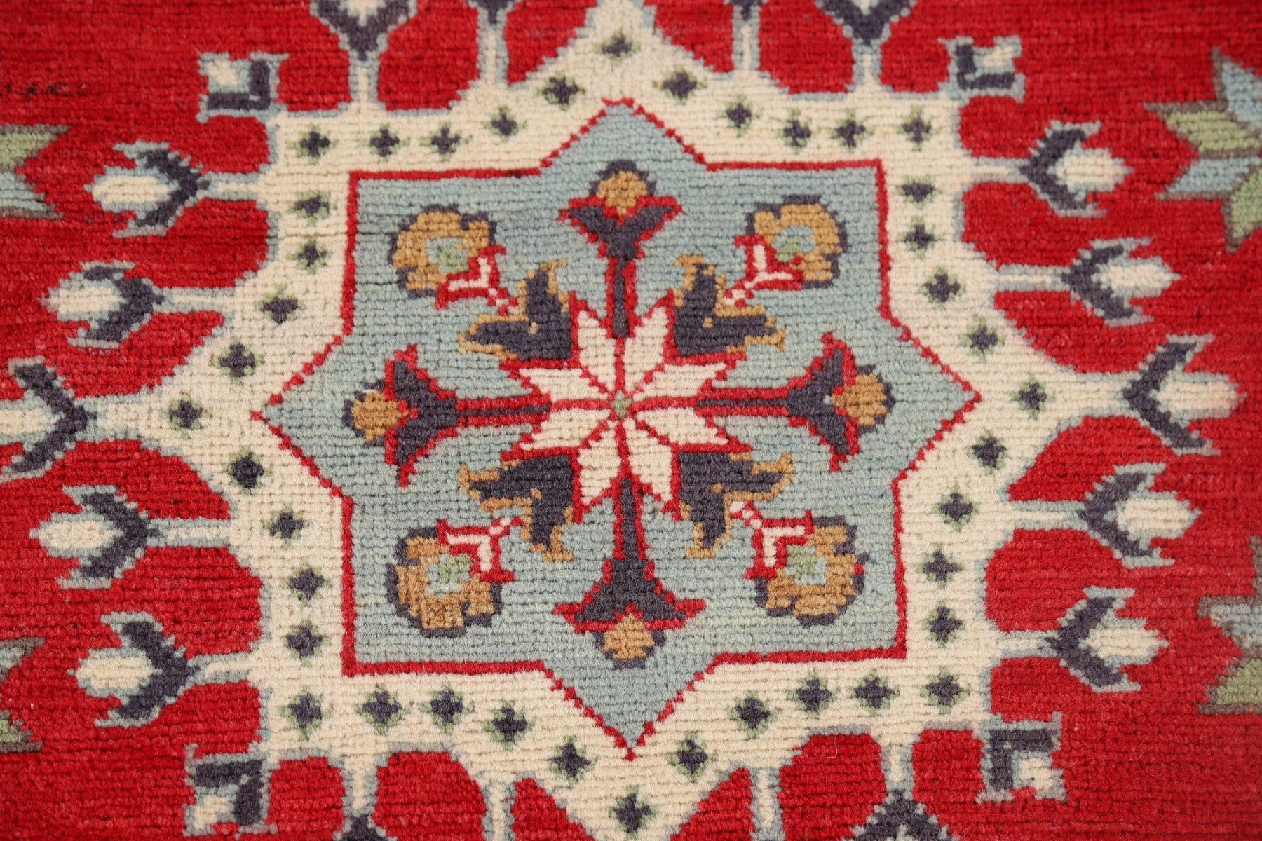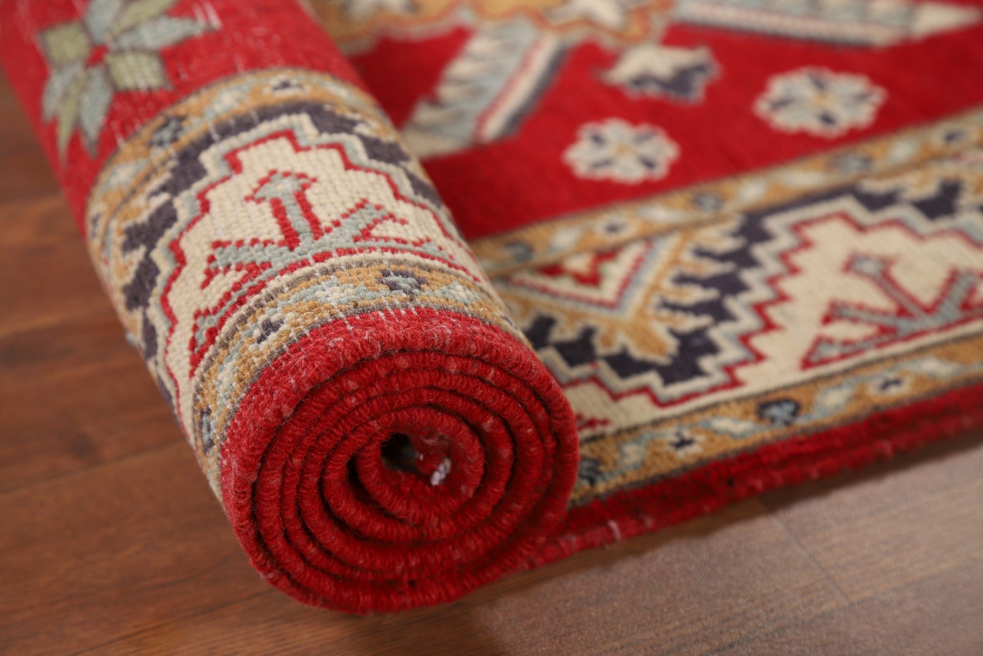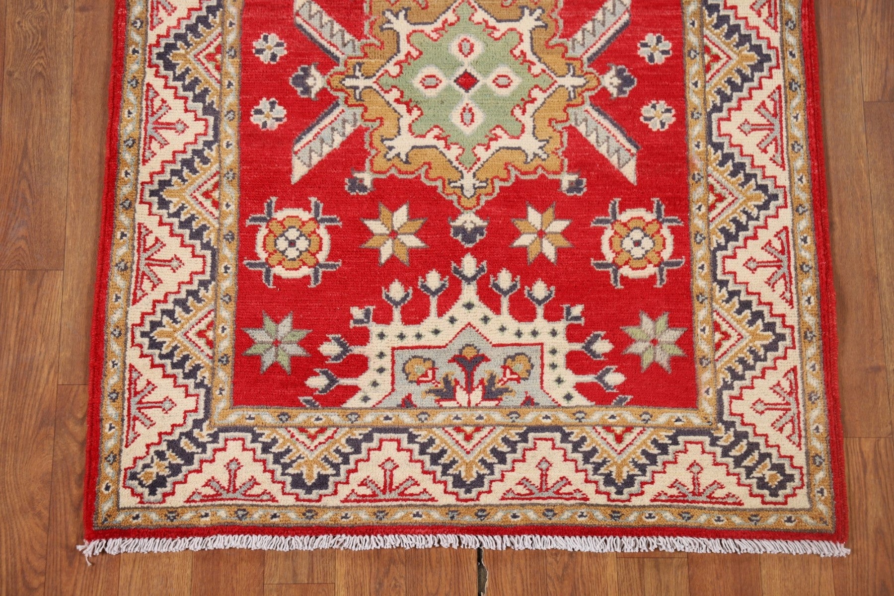 A Beautiful Genuine Pakistan Kazak rug is Hand Knotted by skillful weavers in Pakistan with 100% Wool Material. This rug is in New, First Quality condition. dimensions are 9' 8'' X 2' 11'' in foot and 295 X 89 in centimeter. the primary color is Red.