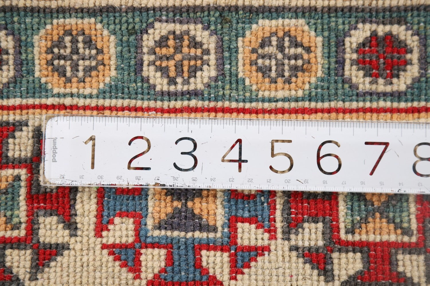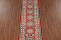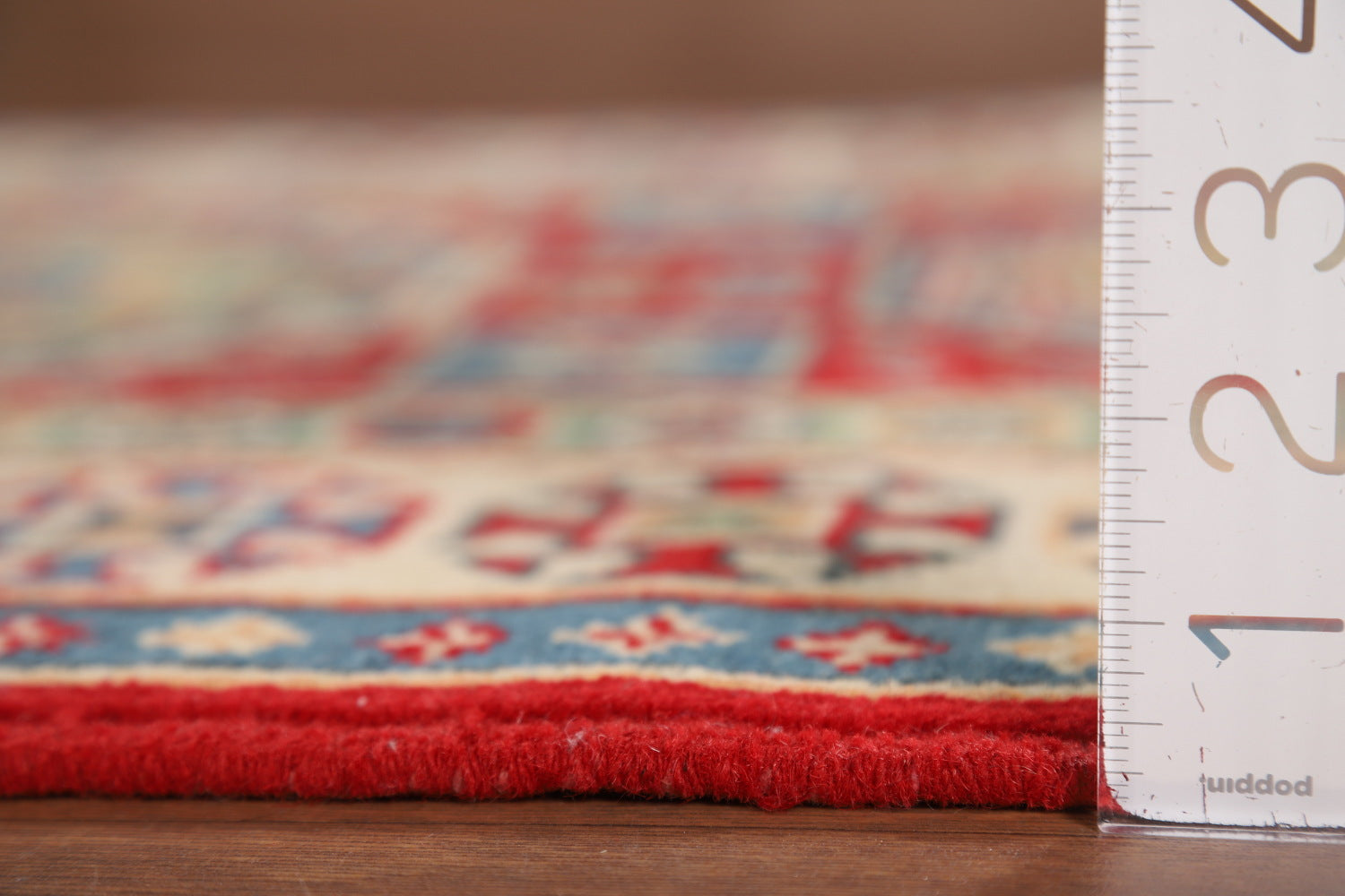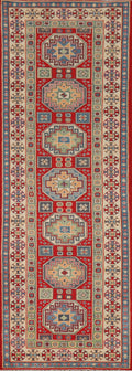 A Beautiful Genuine Pakistan Kazak rug is Hand Knotted by skillful weavers in Pakistan with 100% Wool Material. This rug is in New, First Quality condition. dimensions are 9' 11'' X 2' 9'' in foot and 302 X 84 in centimeter. the primary color is Red.