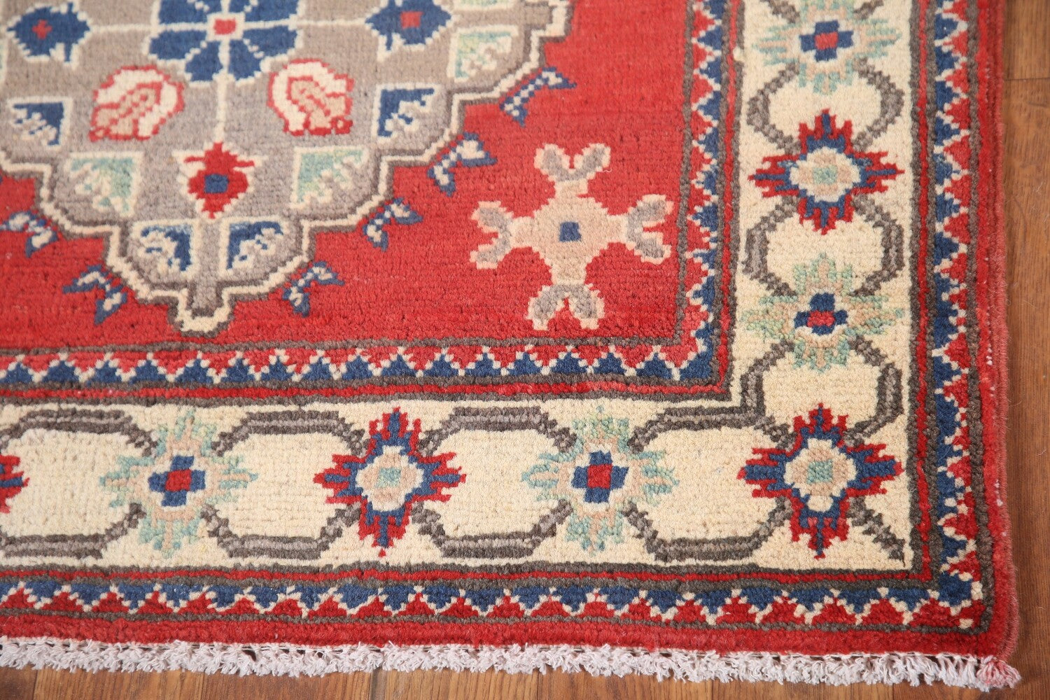 A Beautiful Genuine Pakistan Kazak rug is Hand Knotted by skillful weavers in Pakistan with 100% Wool Material. This rug is in New, First Quality condition. dimensions are 9' 3'' X 2' 9'' in foot and 282 X 84 in centimeter. the primary color is Red.