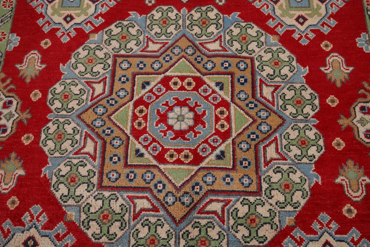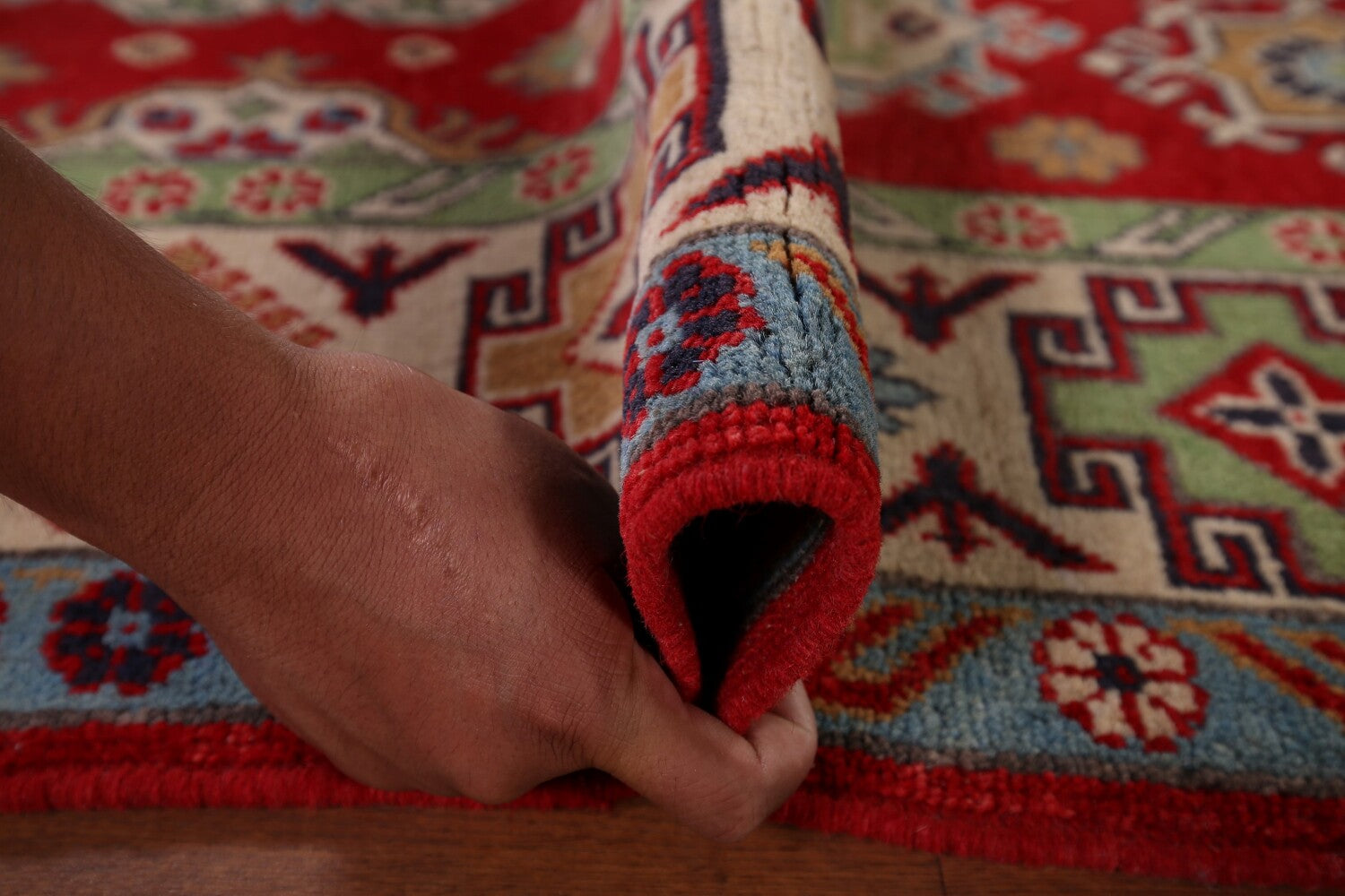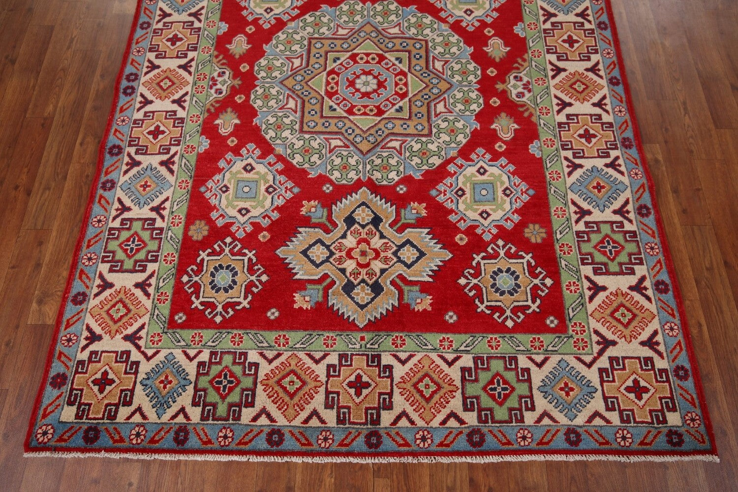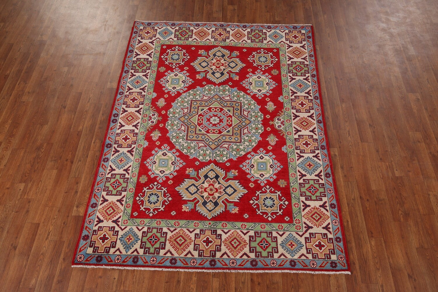 A Beautiful Genuine Pakistan Kazak rug is Hand Knotted by skillful weavers in Pakistan with 100% Wool Material. This rug is in New, First Quality condition. dimensions are 6' 9'' X 5' 0'' in foot and 206 X 152 in centimeter. the primary color is Red.