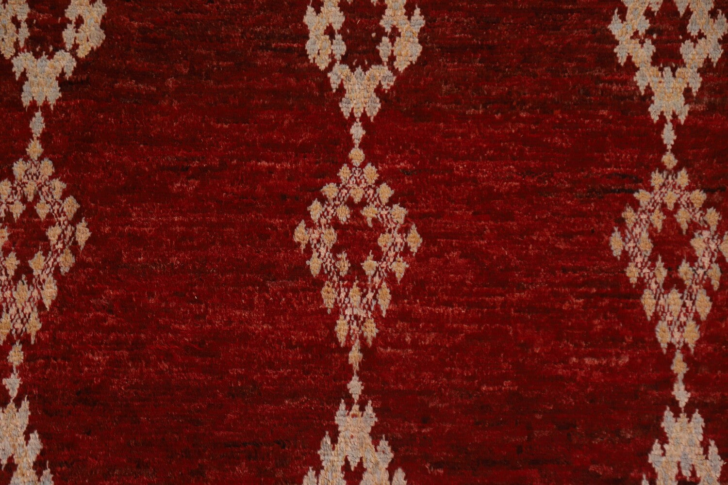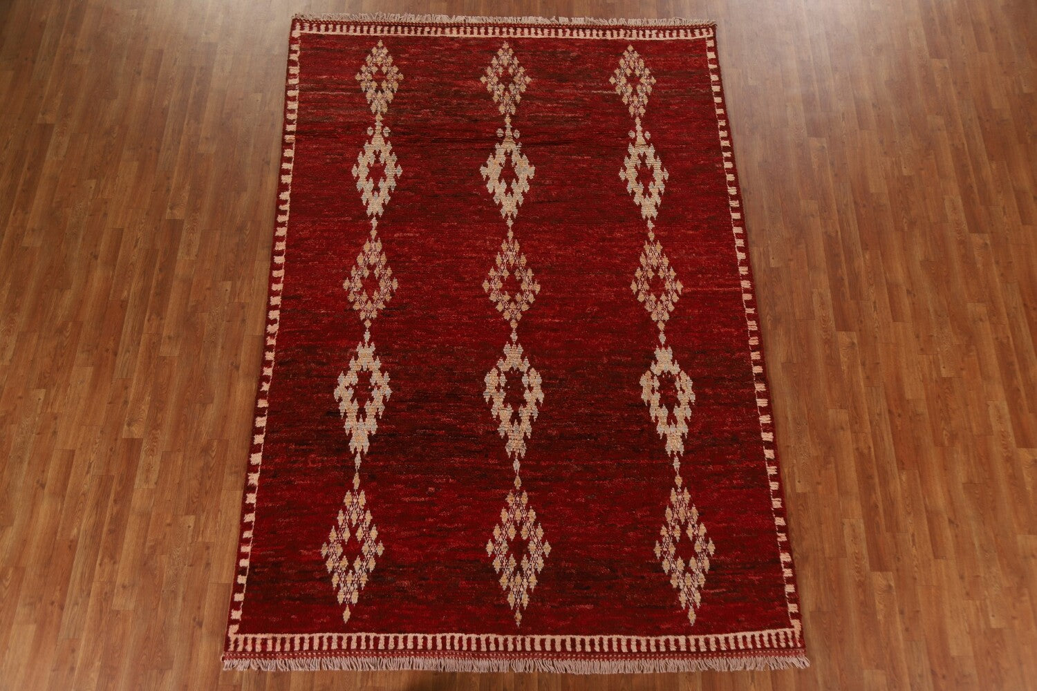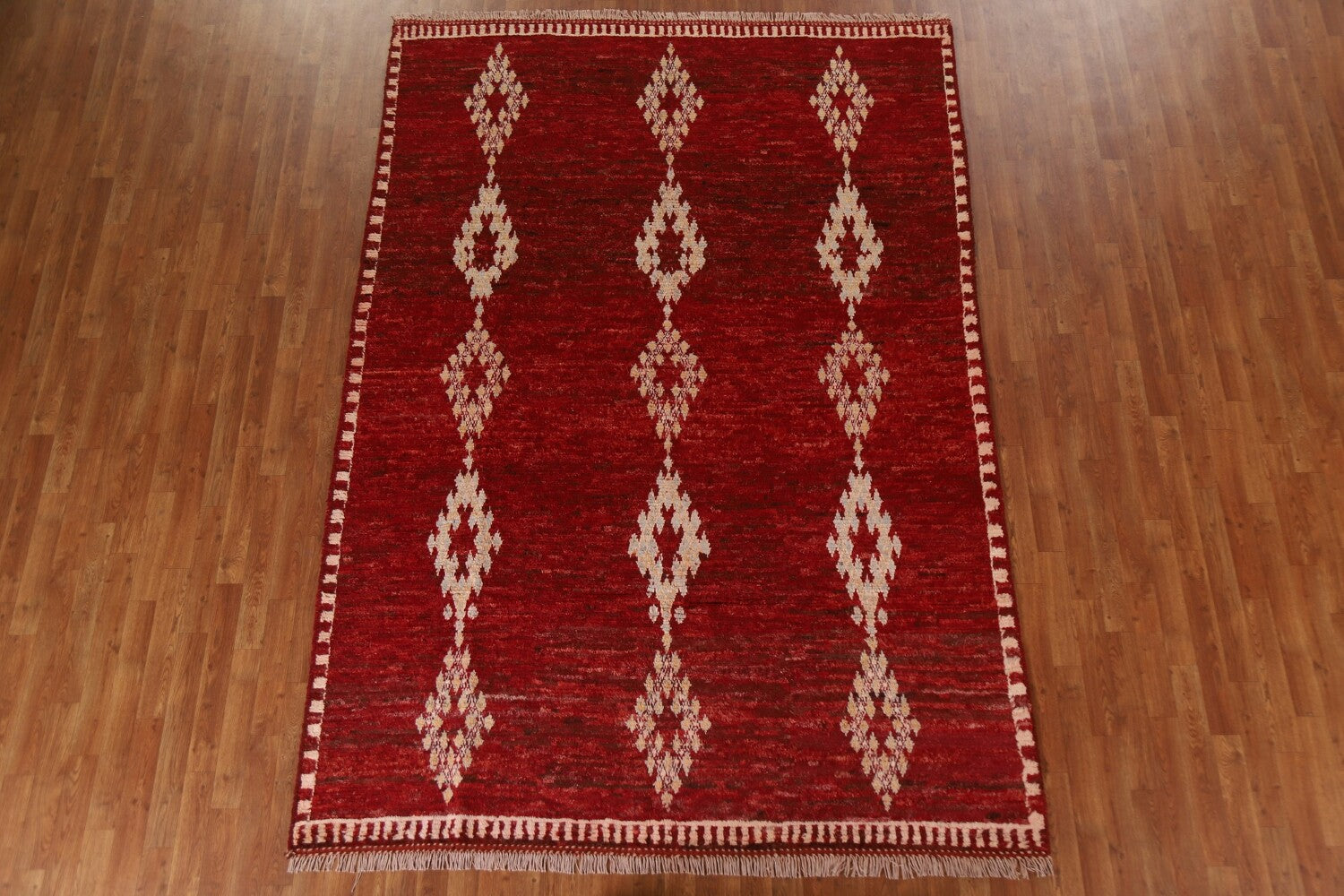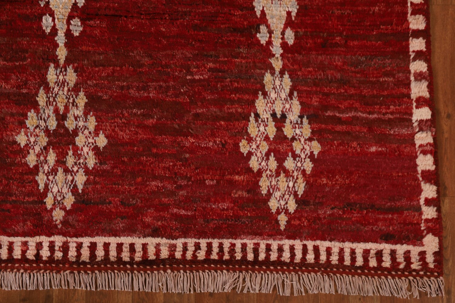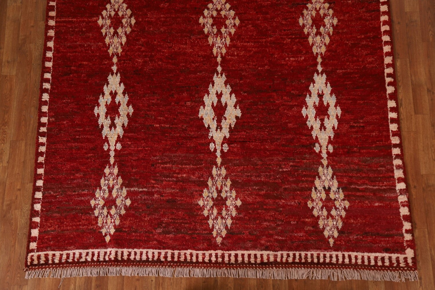 A Beautiful Genuine Pakistan Moroccan rug is Hand Knotted by skillful weavers in Pakistan with 100% Wool Material. This rug is in New, First Quality condition. dimensions are 9' 9'' X 6' 9'' in foot and 297 X 206 in centimeter. the primary color is Red.