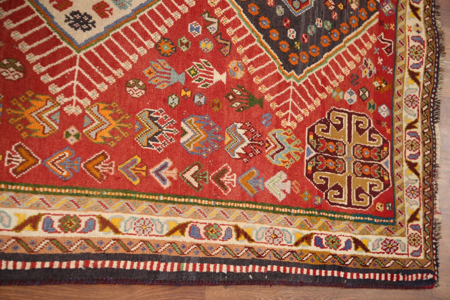 A Beautiful Genuine Persia ( Persia ) Shiraz (Kashkoli) rug is Hand Knotted by skillful weavers in Persia ( Persia ) with 100% Wool Material. This rug is in Very Good (Abrash) condition. dimensions are 5' 4'' X 3' 9'' in foot and 163 X 114 in centimeter. the primary color is Red.