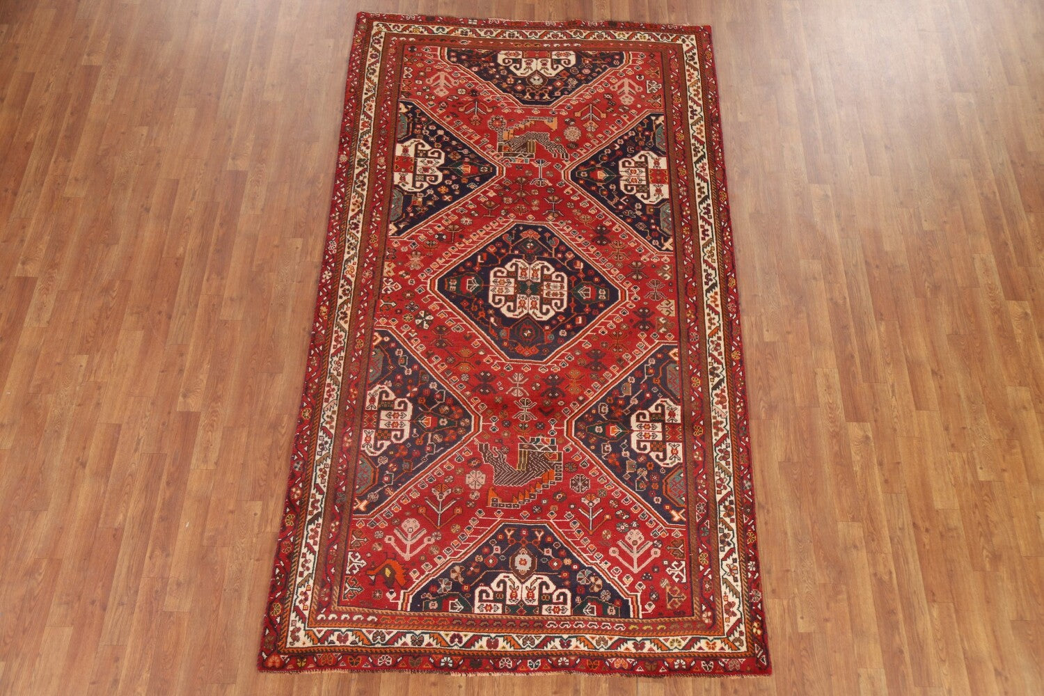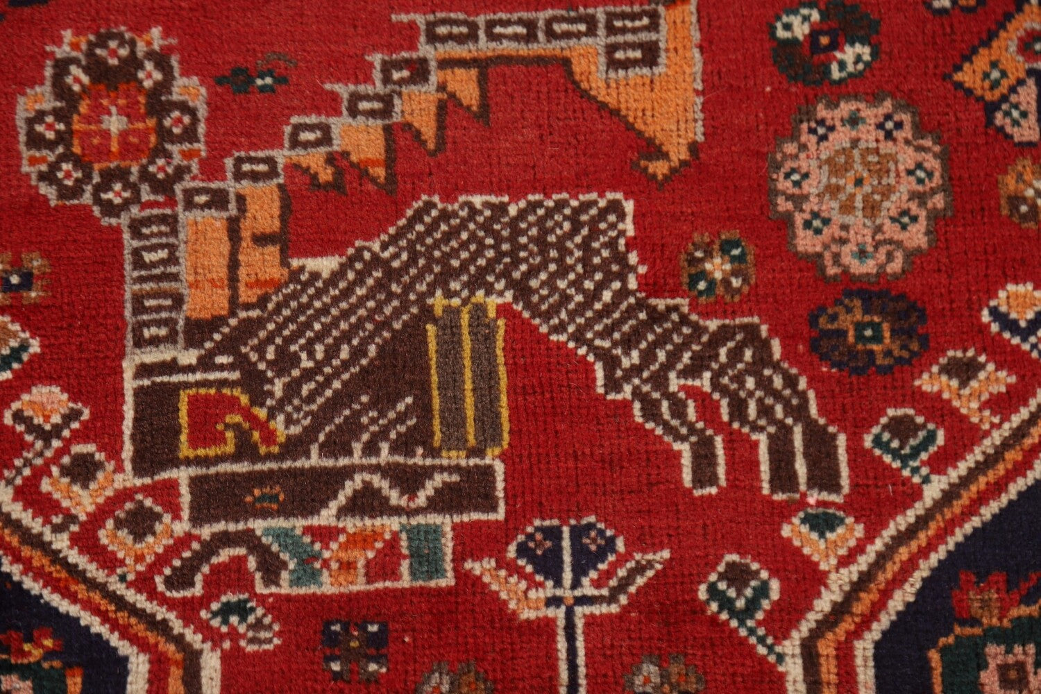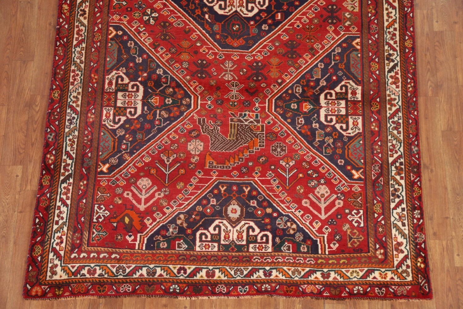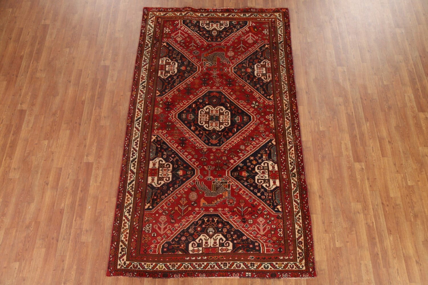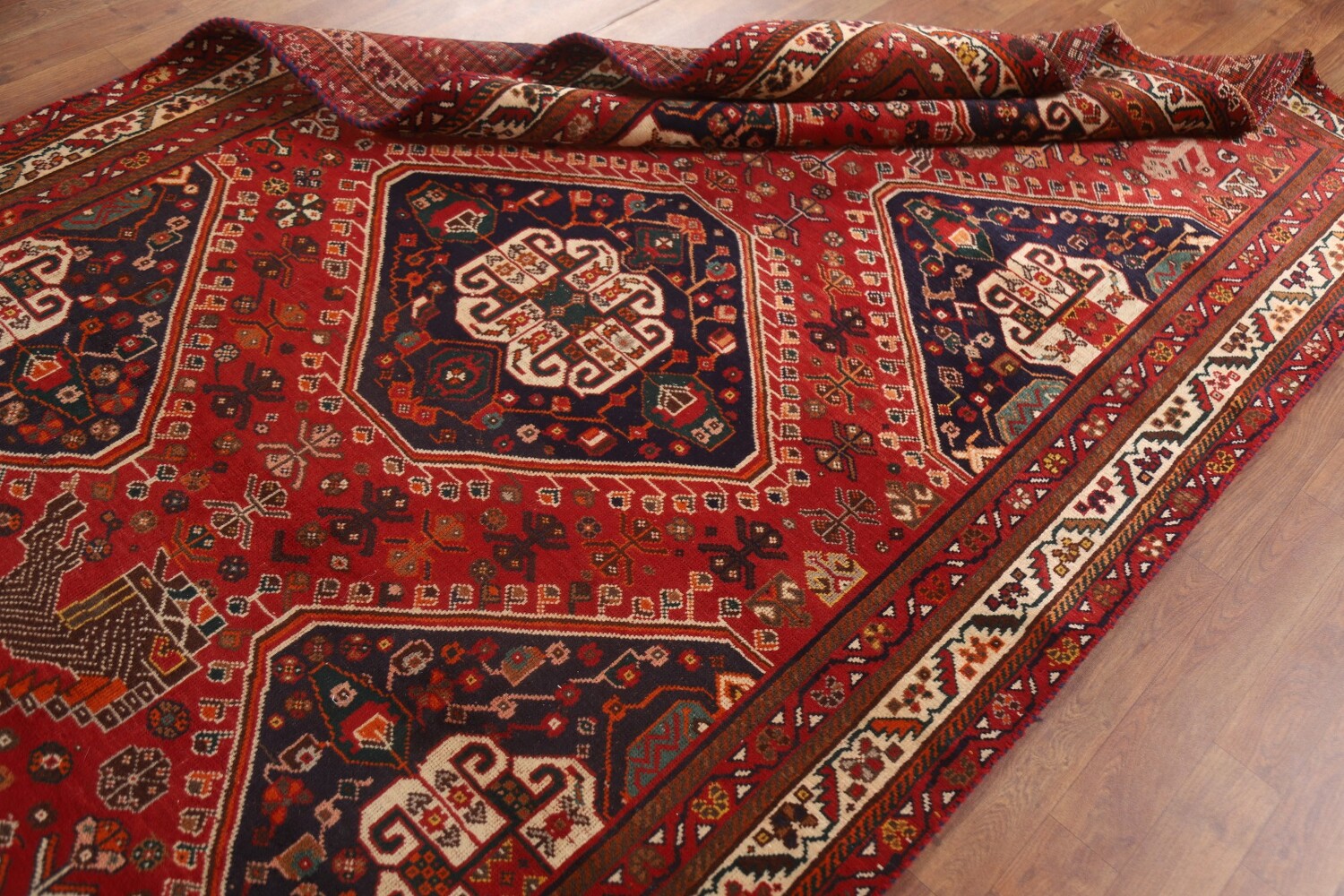 A Beautiful Genuine Persia ( Persia ) Shiraz rug is Hand Knotted by skillful weavers in Persia ( Persia ) with 100% Wool Material. This rug is in Very Good (Low Pile) condition. dimensions are 8' 8'' X 4' 11'' in foot and 264 X 150 in centimeter. the primary color is Red.